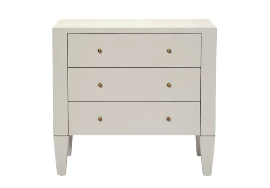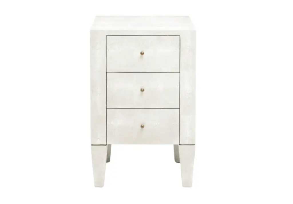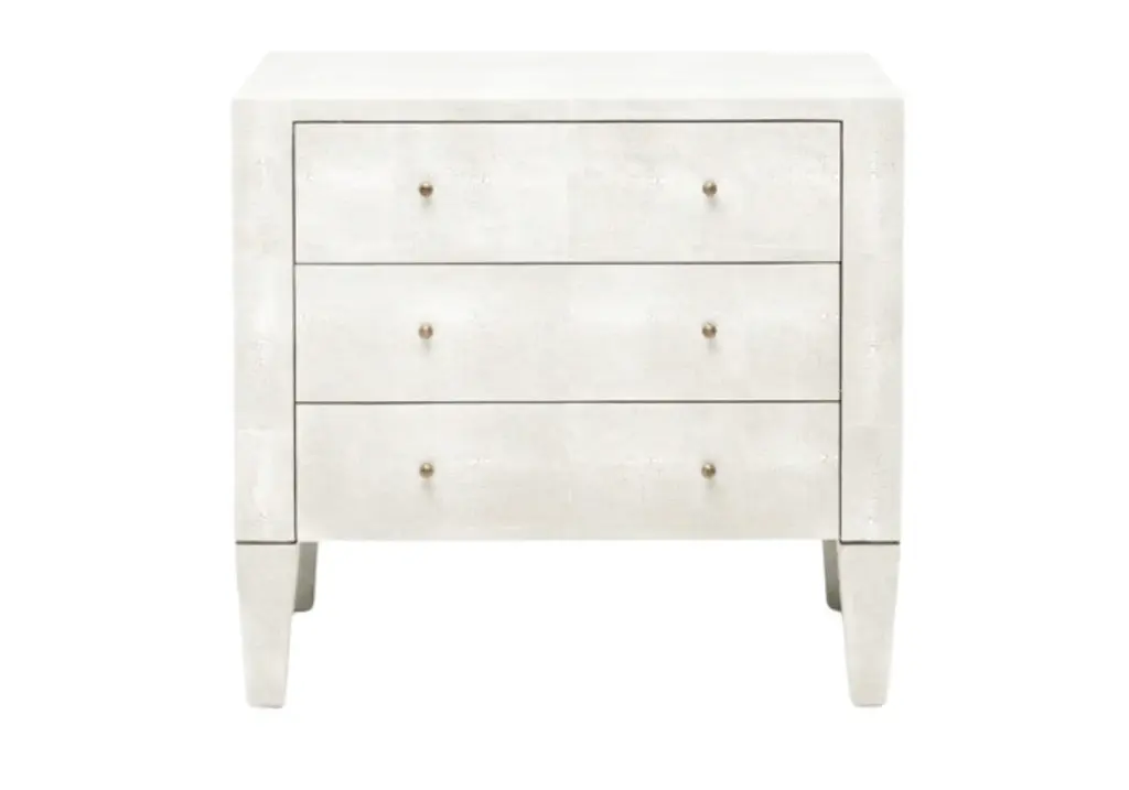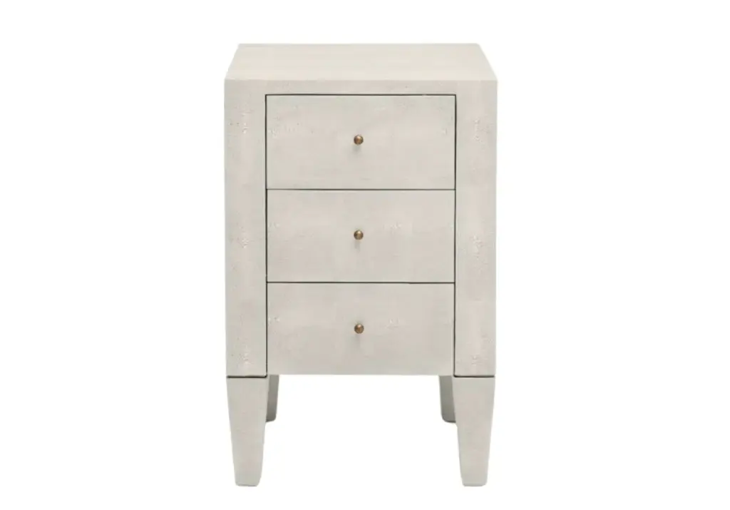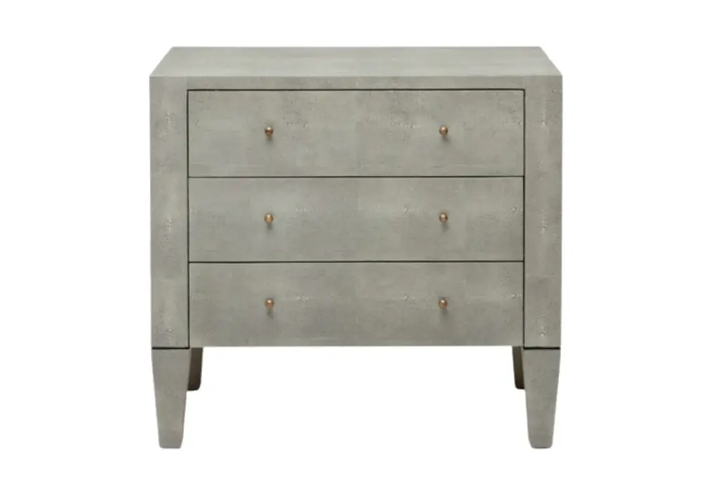 This nightstand boasts a frame, fully wrapped in faux shagreen in three neutral colors. Tasteful brass hardware provides an elegant touch, complemented by bottom mount soft glide drawers. Available in two sizes, style a pair around a bed or a single one for a handsome, refined look.