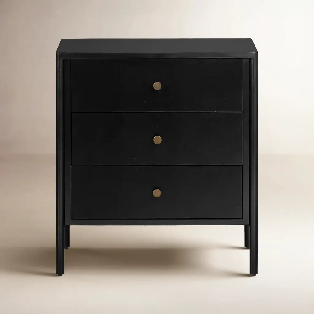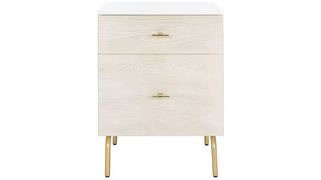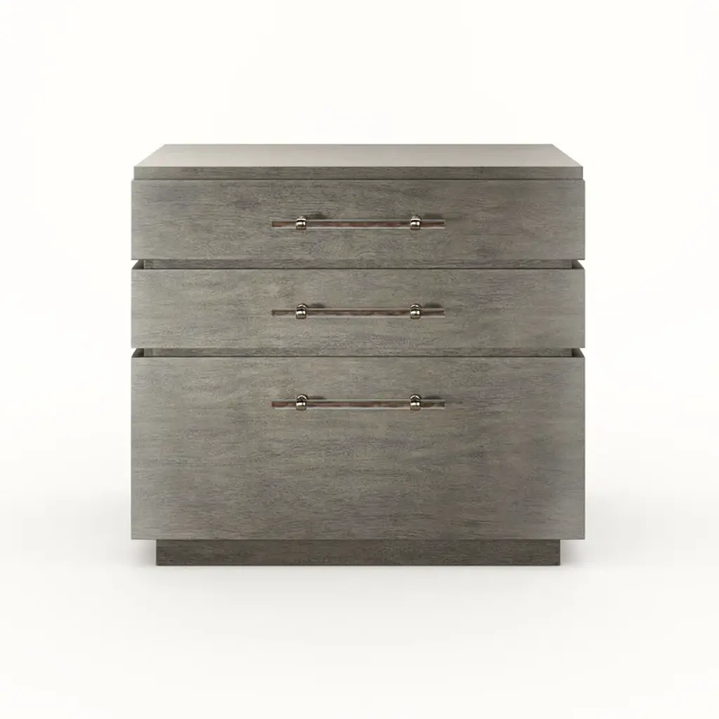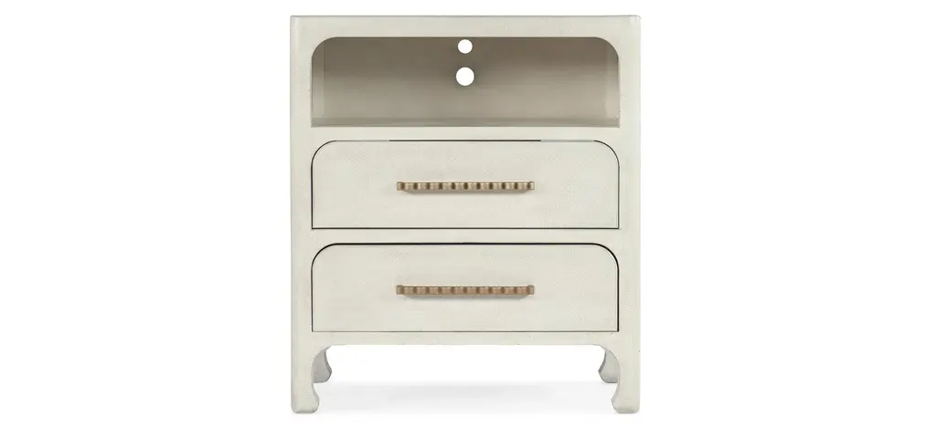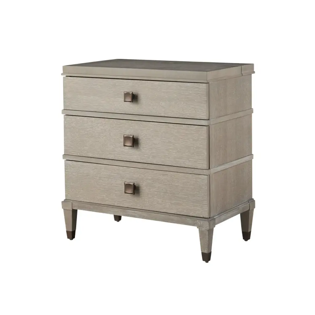 This nightstand boasts a frame, fully wrapped in faux shagreen in three neutral colors. Tasteful brass hardware provides an elegant touch, complemented by bottom mount soft glide drawers. Available in two sizes, style a pair around a bed or a single one for a handsome, refined look.