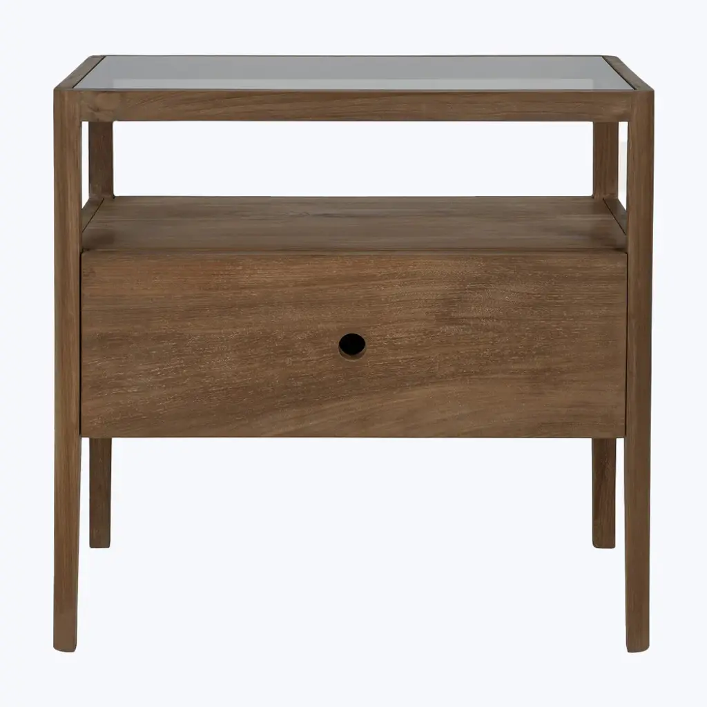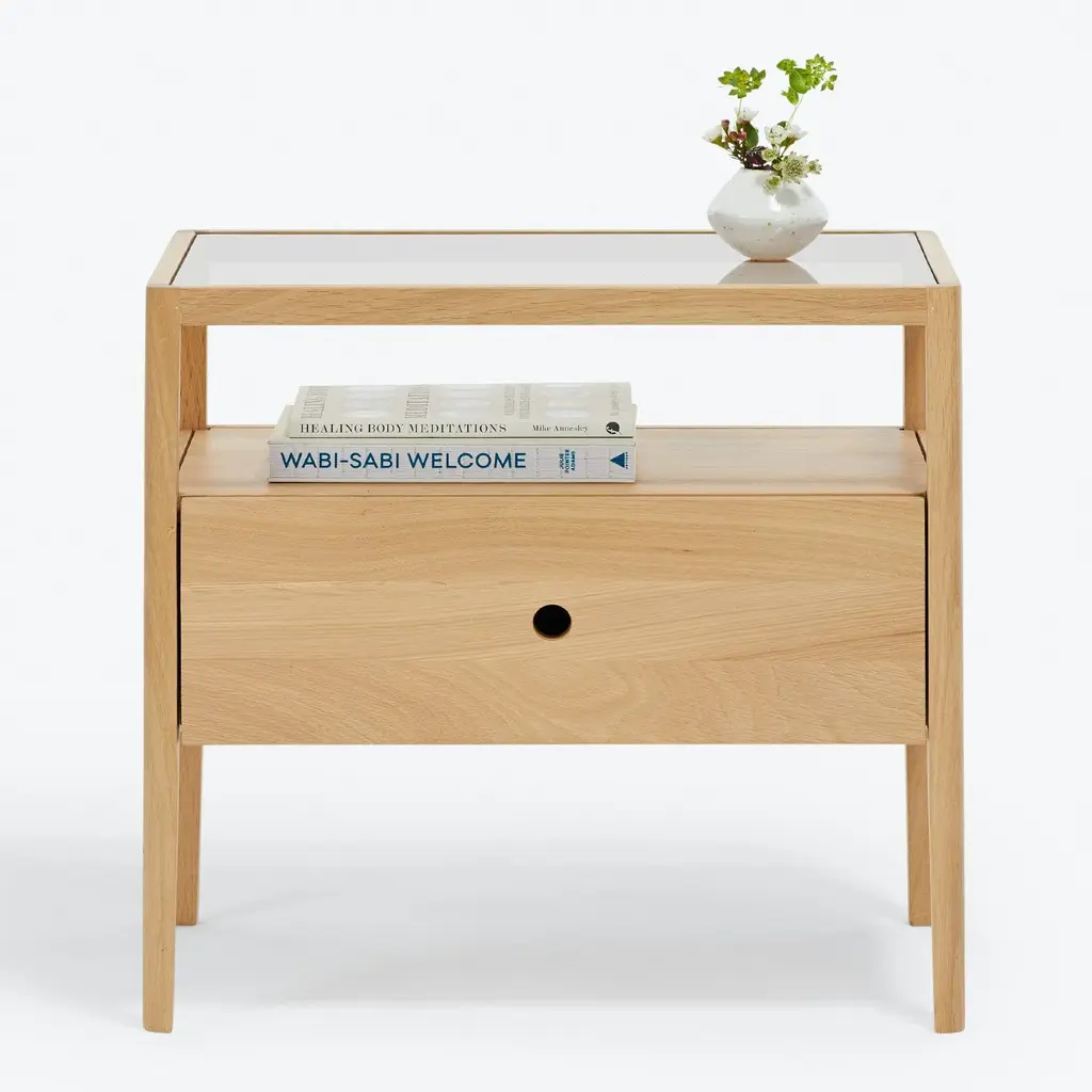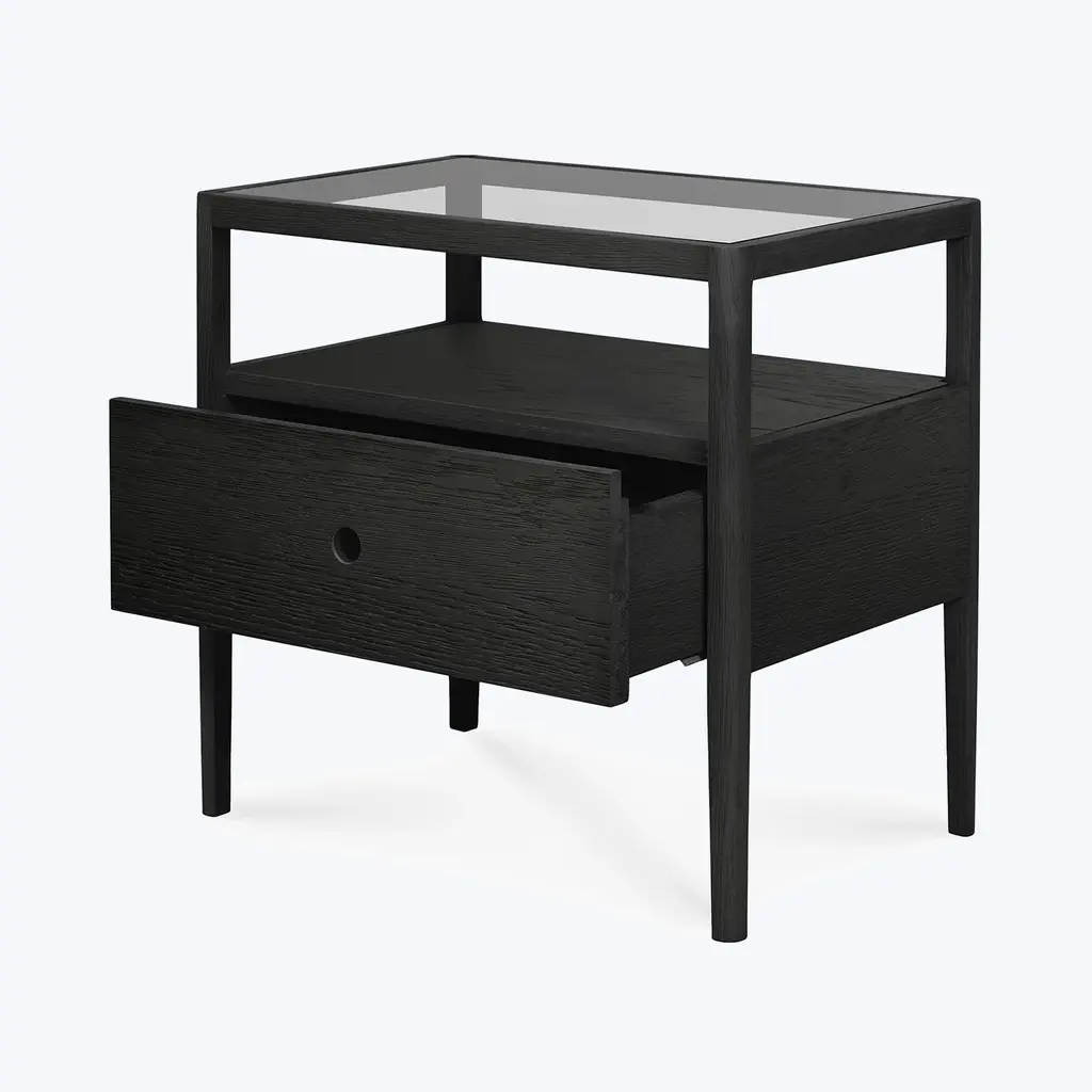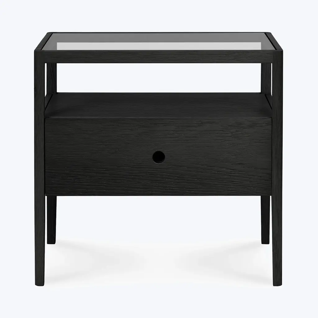 The Spindle Oak Nightstand by Ethnicraft combines minimalist design with the warmth of natural oak, offering a timeless and functional addition to any bedroom. Measuring 22" W x 20.5" H x 14" D, this nightstand is crafted from high-quality oak, ensuring durability and lasting beauty. The sleek, natural oak or black finish and clean lines create a subtle yet striking contrast with the glass, giving the piece an airy, light feel that complements various decor styles. The smooth wood grain adds character and depth, while the glass top offers a touch of elegance. Featuring a modern glass top, it elevates the nightstand's sophisticated look, while a wide drawer and open shelf below provide ample storage for essentials. Weighing 31 lbs and made in Serbia, the Spindle Oak Nightstand is a perfect blend of style and practicality, making it an ideal choice for any contemporary or transitional bedroom.