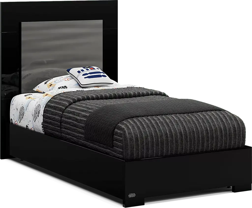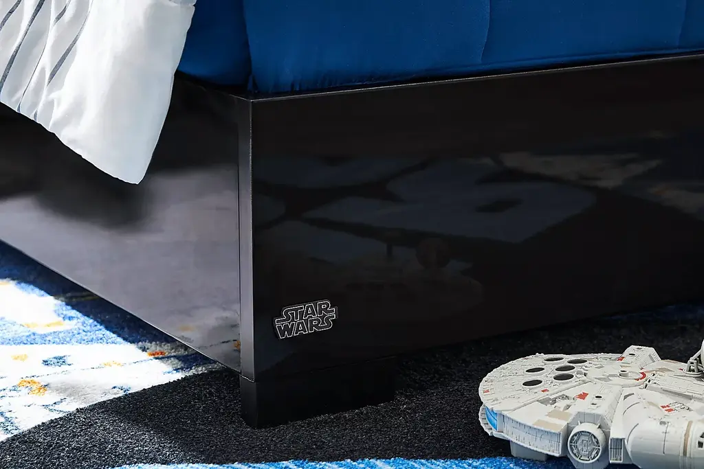 A STAR WARS™ bedroom without awesome furniture is like a Jedi without a Lightsaber™, the Millennium Falcon without hyperdrive or the Death Star without. well, you know. You'll be over the moon for the incredible glow effects produced by the remote touch, multi-color LED lights that surround the twin bed's two-tone headboard. Sleek, lacquered black finish on each piece plays alongside carbonite melamine to complement the galactic aesthetic perfectly. The chest's five drawers are made with concealed soft close drawer glides and feature oversized handles to pull. Organize books, decor and more with the nightstand's bookcase shelf OR utilize the bottom drawer. Equipped with sleek, LED lighting by Nanoleaf®, the TIE FIGHTER desk's smart panels can be paired with devices to sync it with the rhythm and time of your favorite music and sounds. All pieces are plated with the Star Wars name, letting you know this is officially licensed merchandise. Mattress and foundation (if required) sold separately.