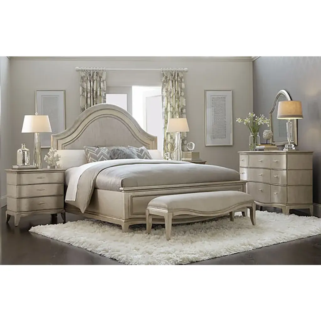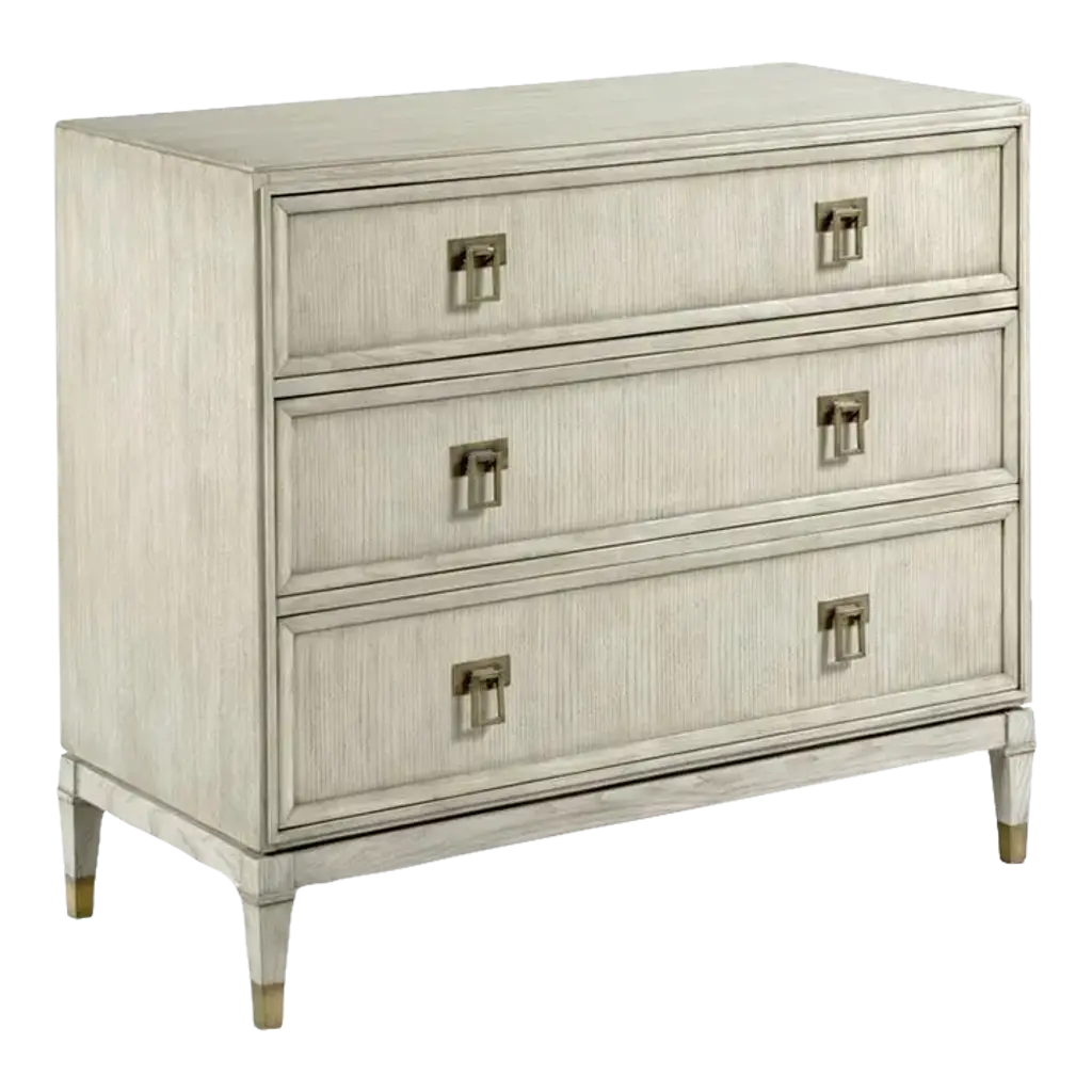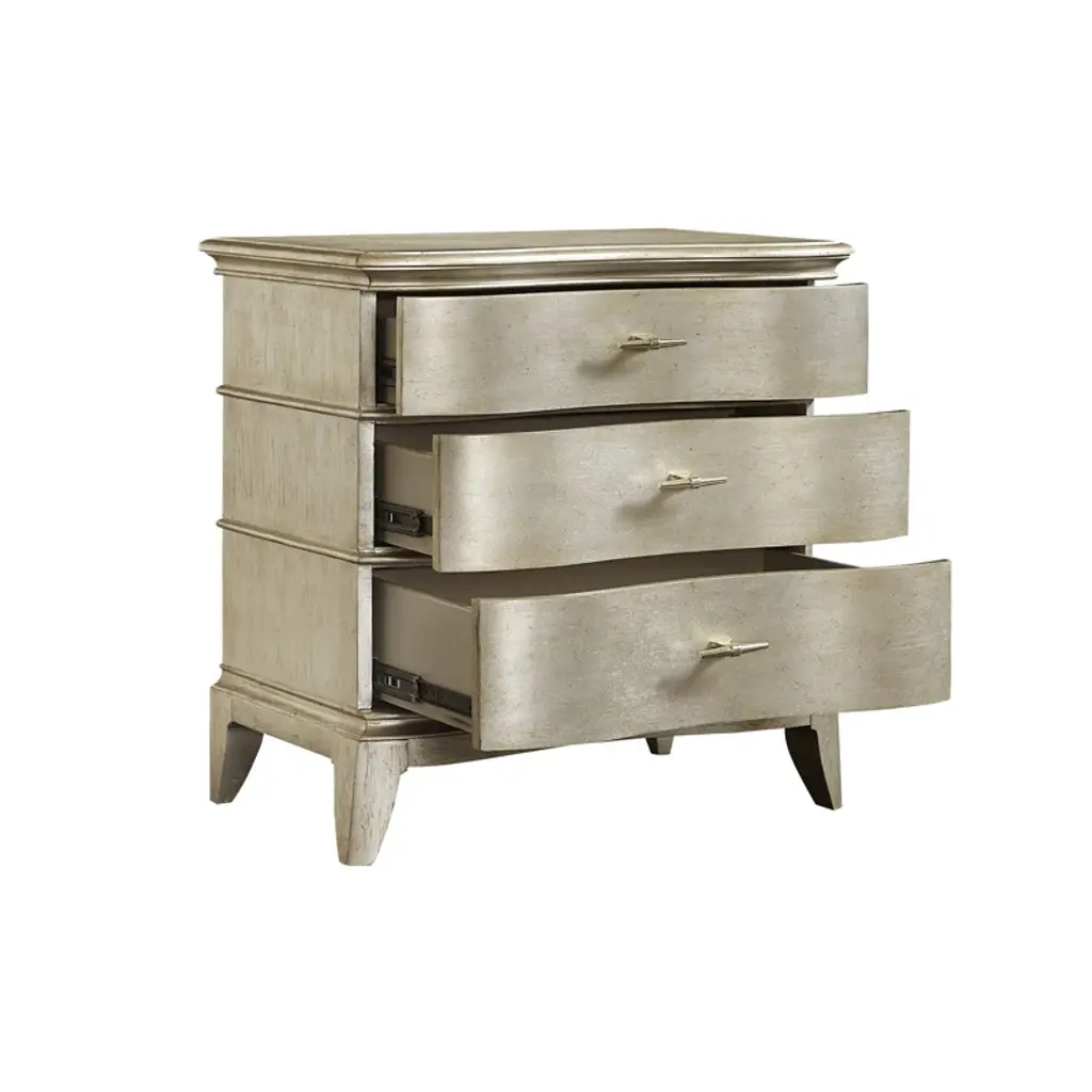 The glamorous little three-drawer Starlite nightstand sits on tapered legs and is finished with silver bezel paint that has been glazed and gently aged for a soft sheen.