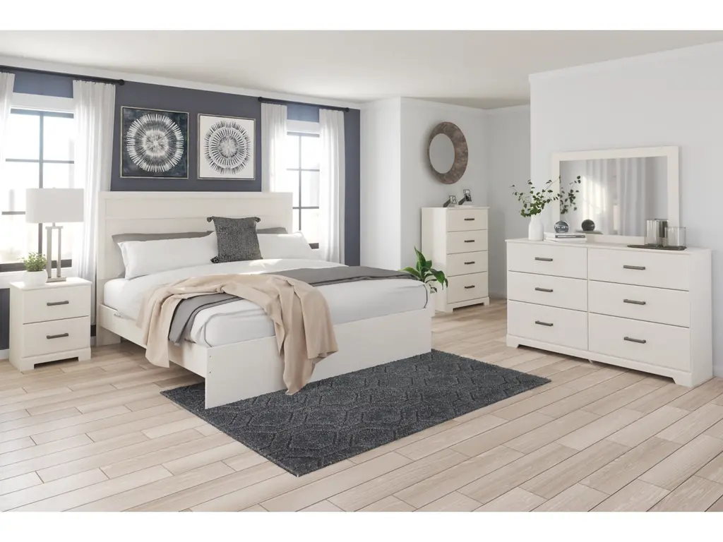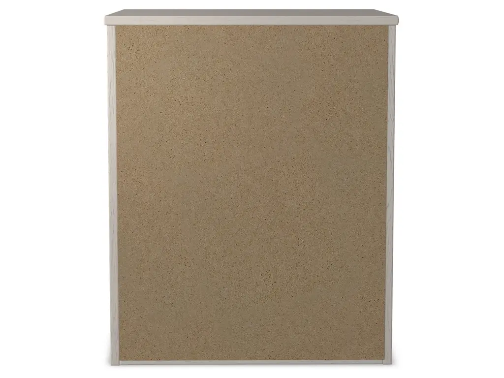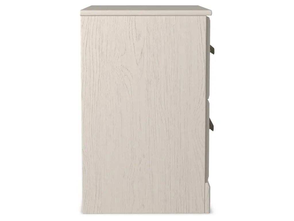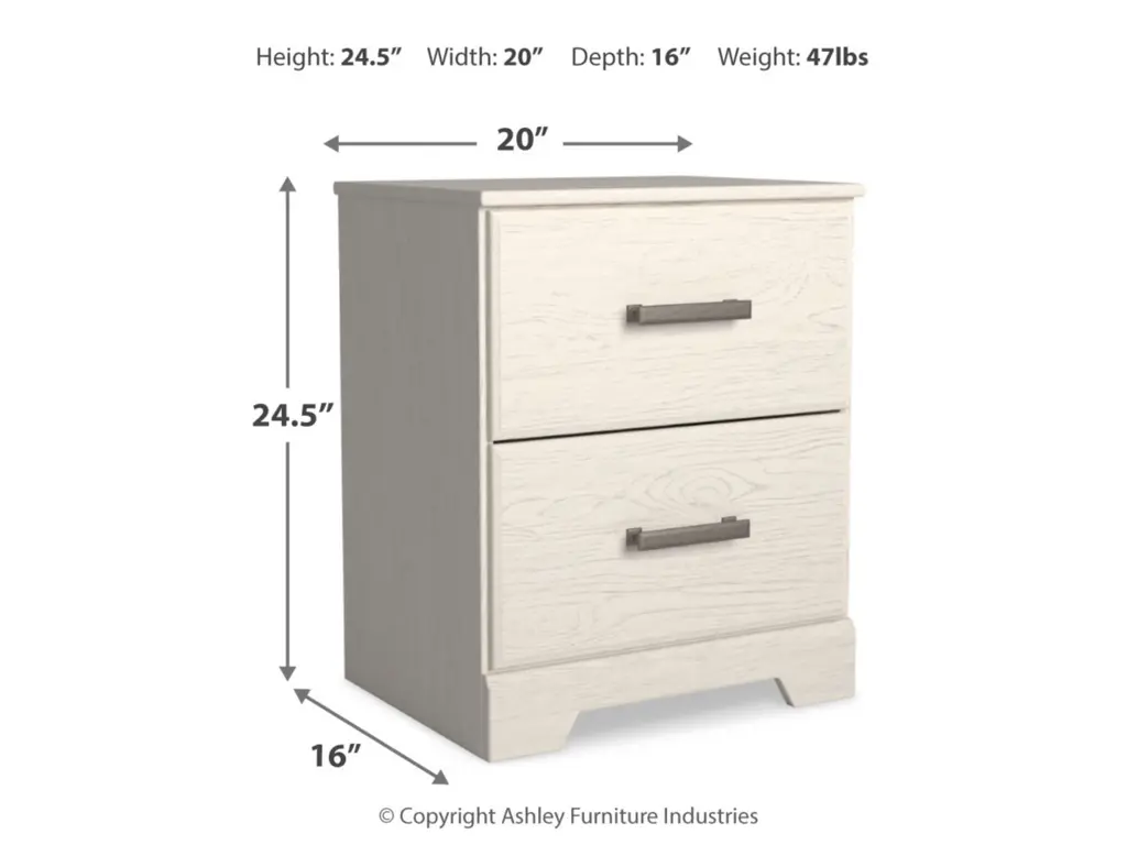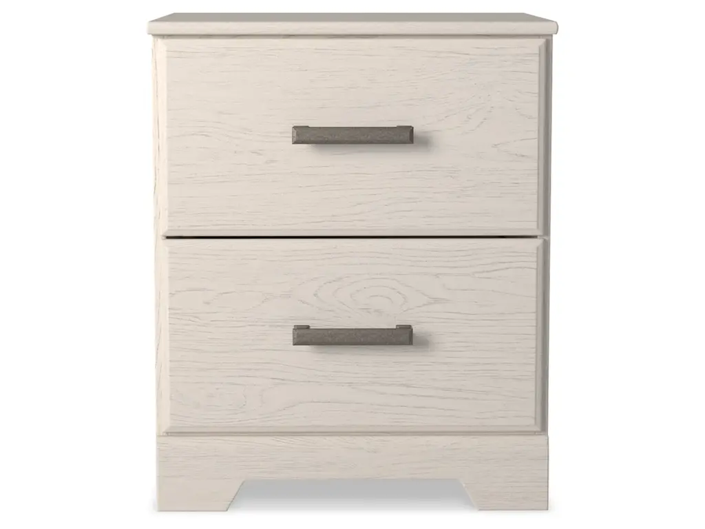 With its clean-lined look and modern attitude, the Stelsie nightstand is a fresh style awakening. A crisp, white hue over subtle replicated wood grain easily complements other furniture finishes. Smooth drawer fronts with antiqued pewter-tone handles complete the aesthetic.