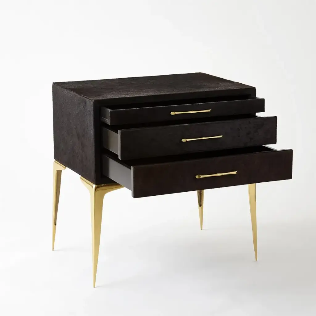 Held up by four shapely brass legs, our Stiletto Bedside Table in black hair on hide is a stunning piece that will dress up any bedroom. The bold brass legs, inspired by a high heel, are sharp and sleek. And the lined drawers are large enough to hold your essential bedside needs. Note- please place on a carpeted surface to avoid scratching your floors. From a fashion forward perspective, Global Views offers accessories, furniture, statement lighting, and an assortment of rugs and mirrors to add beauty and joy to your home.