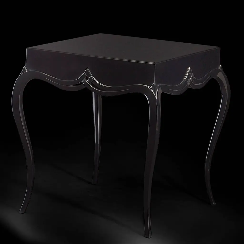 Side Table or nightstand Stormy made with solidmahogany wood. All black veneered finish. With subtle saber feet.Also available in white veenered.Also available in coffee table stormy.