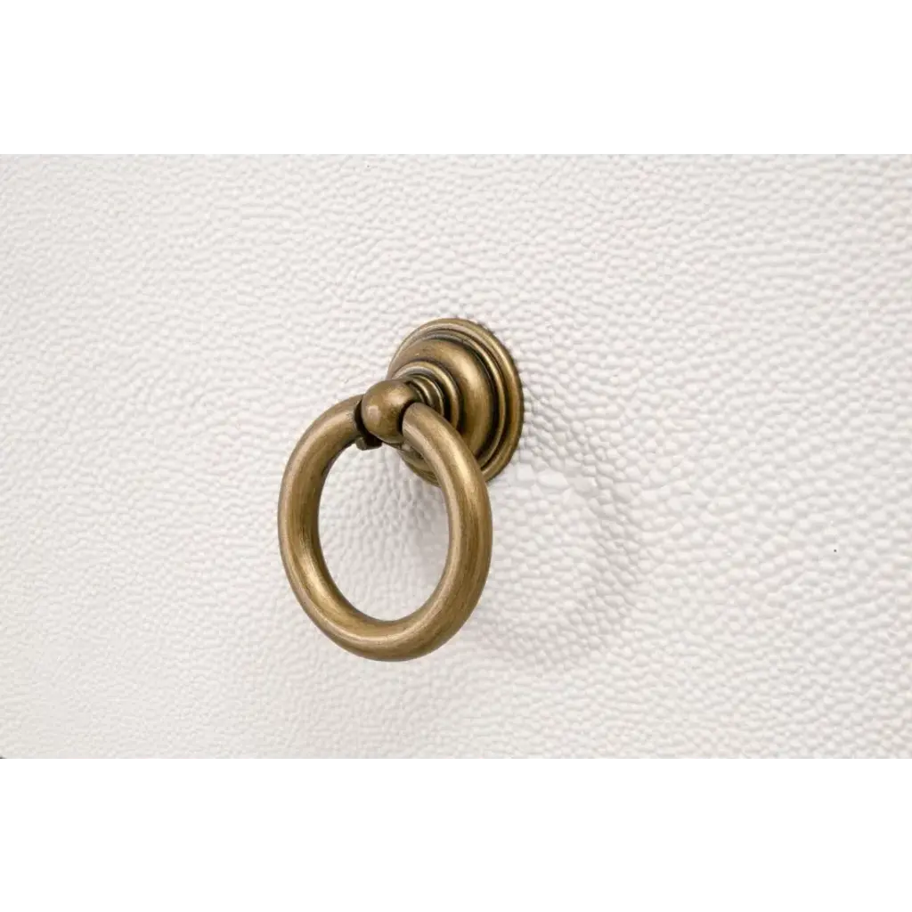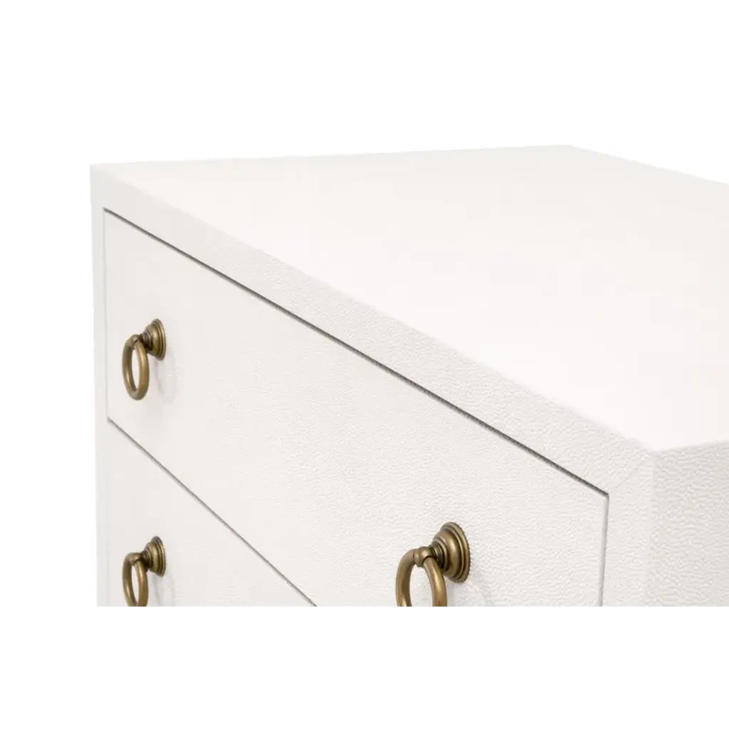 This gorgeous and one-of-a-kind Strand Shagreen Nightstand by Essentials for Living will brighten up your bedroom with its pearl white finish. This unique nightstand mimics natural shagreen skin. Its textured finish is made of a faux shagreen resin on top of acacia wood and plywood. The shagreen finish includes seams for a very natural look, just like real stingray skin. The base is constructed of steel shaped in an “X" design with an elegant, brushed gold finish. It measures 32†wide, 19†deep, and 30†high and features two storage drawers with matching brushed gold ring pulls for ample storage space. The light colors will complement many styles and interior designs, making this nightstand an ideal choice to complete your bedroom or guest room.