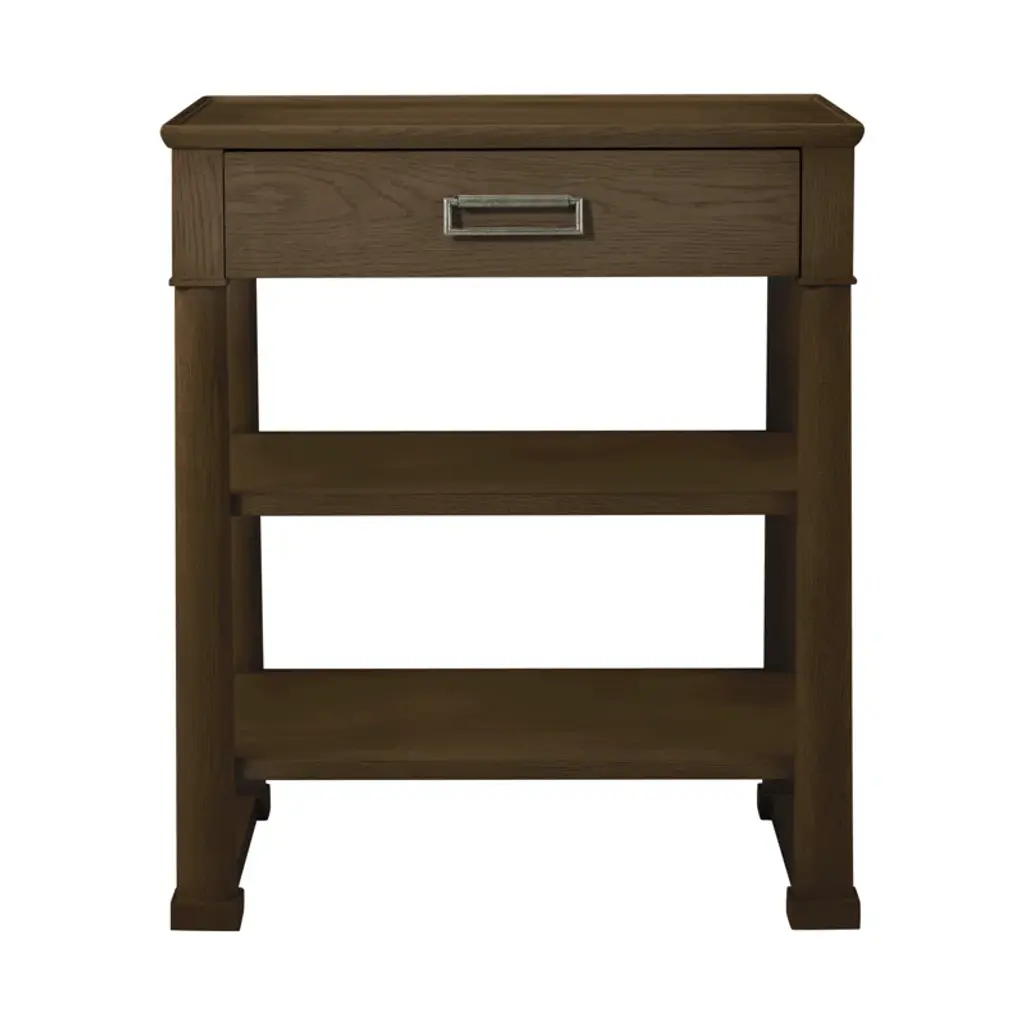 In the Surrey Nightstand, symmetrical lines seamlessly complement a rich oak surface and columns, with ends detailed in finely squared accents. In the center, one drawer and two exposed shelves offer an open feeling. Handcrafted in oak. Finished in Dover or Brownstone.