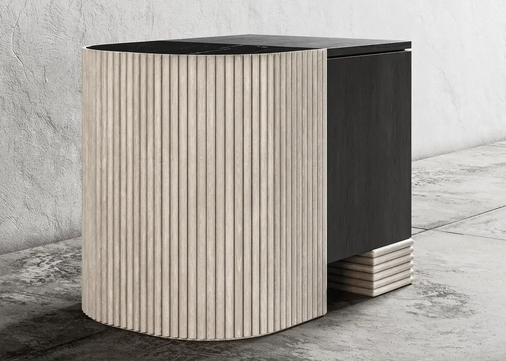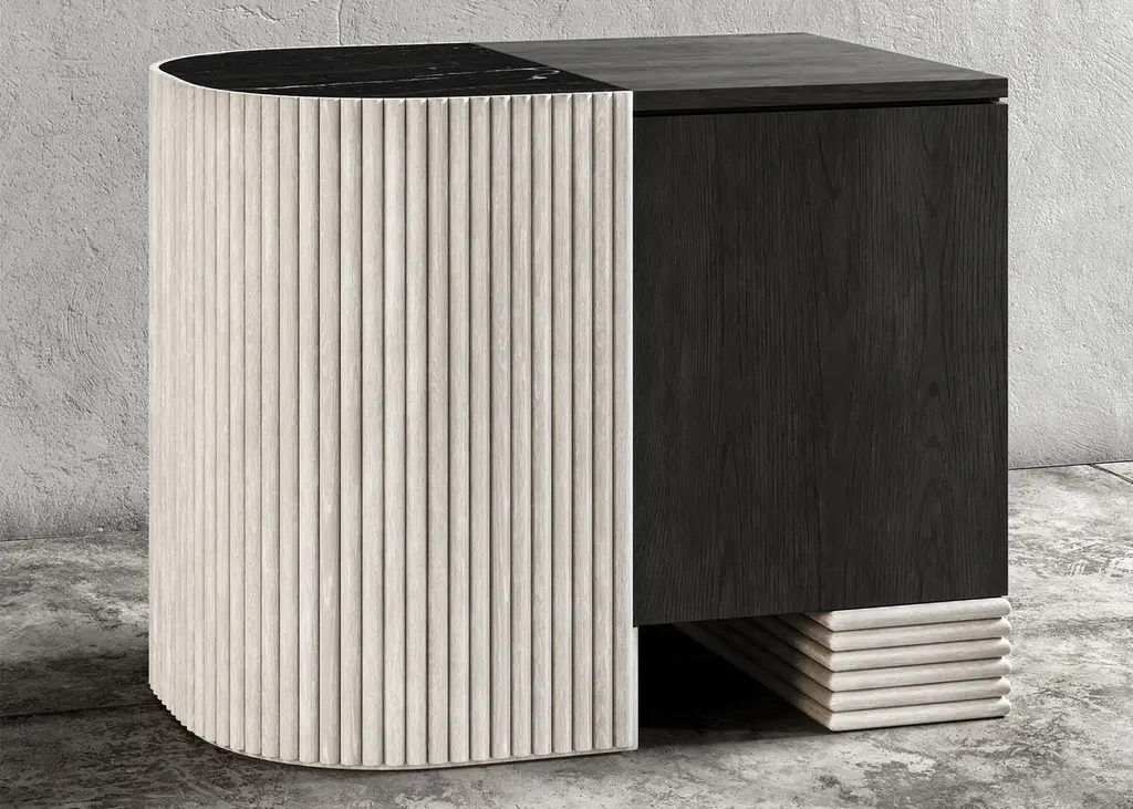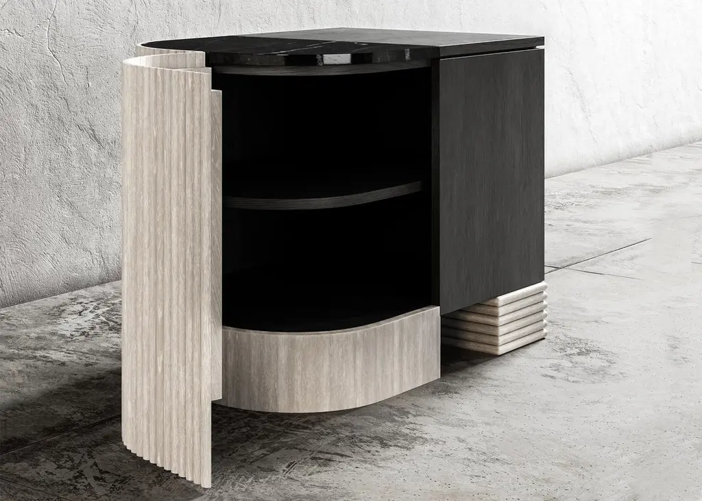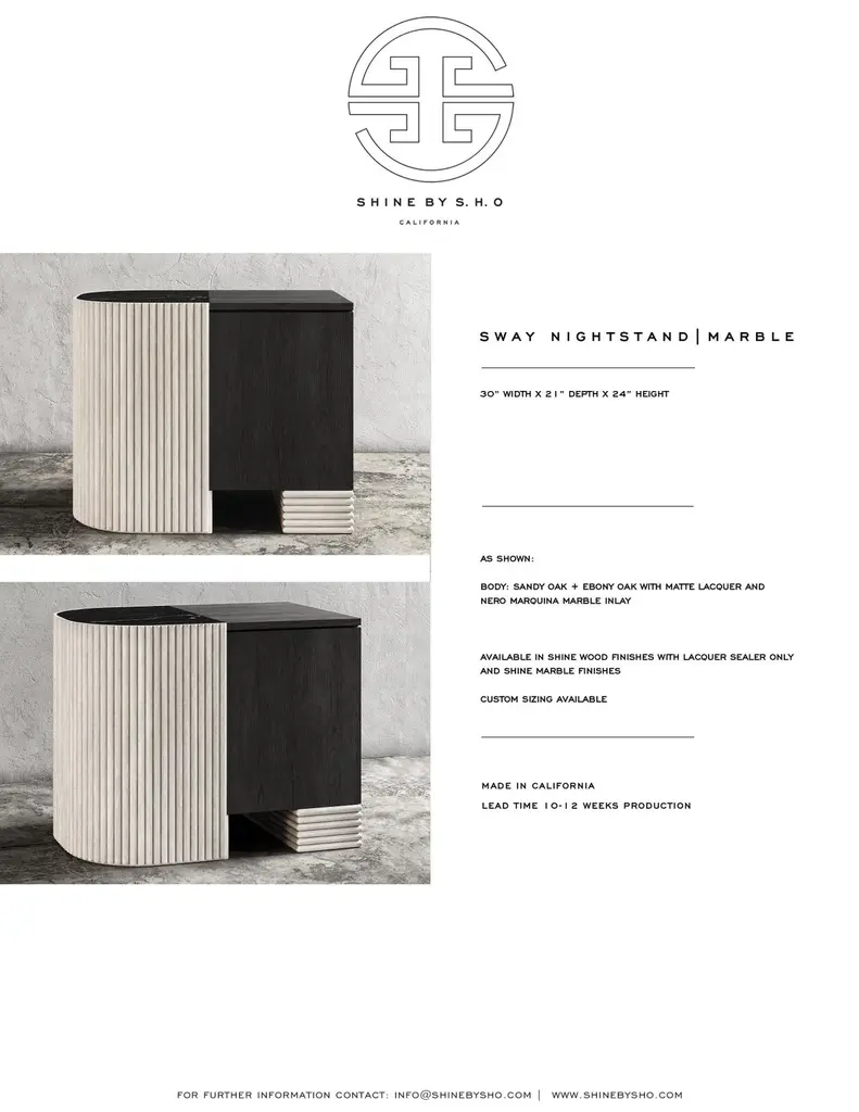 SWAY NIGHTSTAND - Modern Design with Sandy & Ebony Oak + Nero Marquina MarbleThe Sway Nightstand is a beautiful and modern piece of furniture that will elevate the style of any bedroom. Crafted from high-quality Sandy Oak and Ebony Oak wood, the nightstand features a stunning Nero Marquina marble top inset that provides a beautiful contrast to the wood finishes.The nightstand features a spacious cabinet bay that provides ample storage space for your bedroom essentials. The door is hidden and uses a touch latch to open and close, and it is fitted with a shelf to provide additional storage.The Sandy Oak and Ebony Oak wood frame of the Sway Nightstand is finished with a clear matte lacquer that enhances the natural wood grain and provides durability and protection. The design of the nightstand is both sleek and contemporary, with clean lines and a minimalist aesthetic that will complement any modern decor.The Nero Marquina marble top adds an element of sophistication and luxury to the piece. The combination of wood and marble in the Sway Nightstand creates a beautiful and unique look that is sure to impress.Overall, the Sway Nightstand is a functional and stylish piece of furniture that is perfect for any modern bedroom. Its high-quality materials, sleek design, and ample storage space make it a smart investment for any homeowner looking to elevate their bedroom decor.The Sway Nnightand can be customized as to size as well as the wood and marble combinations. As shown in Oak and Marble the list price is $8,590 and starts at $4,680 list.