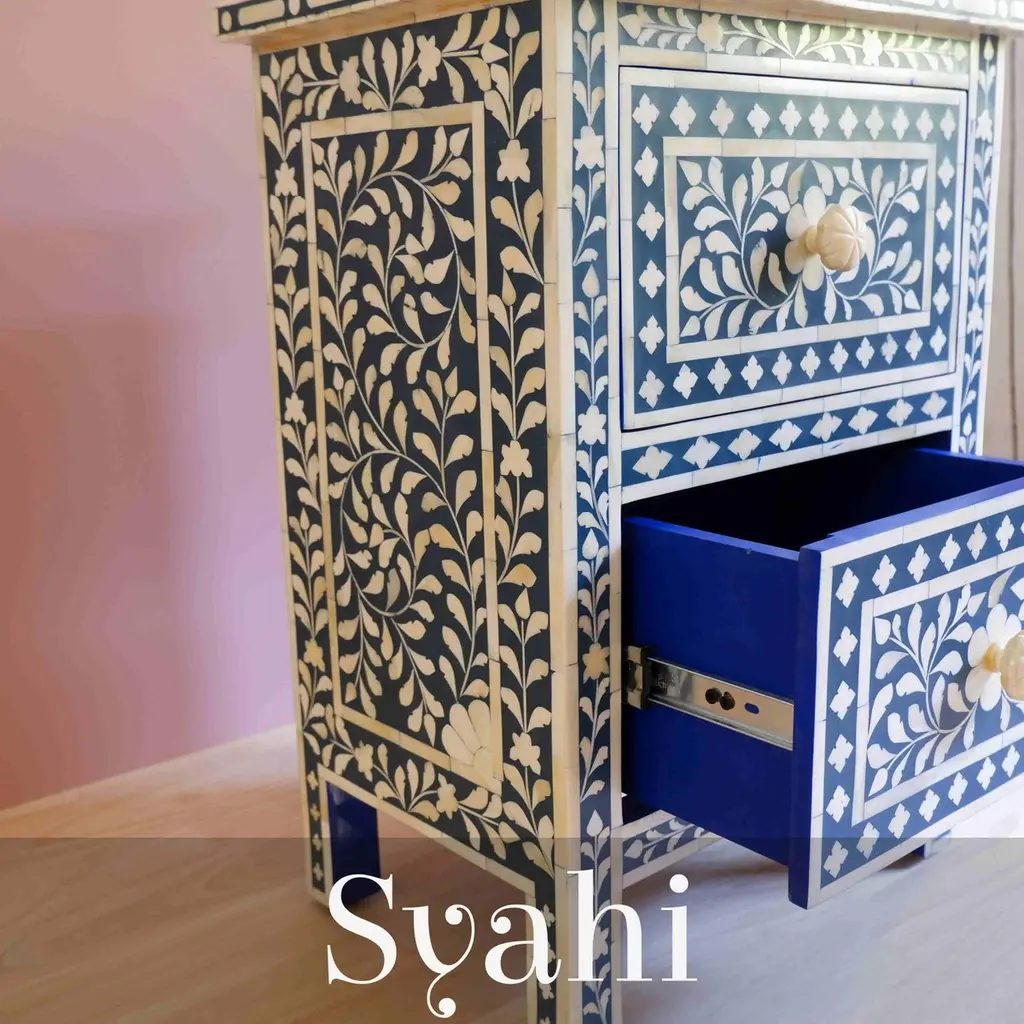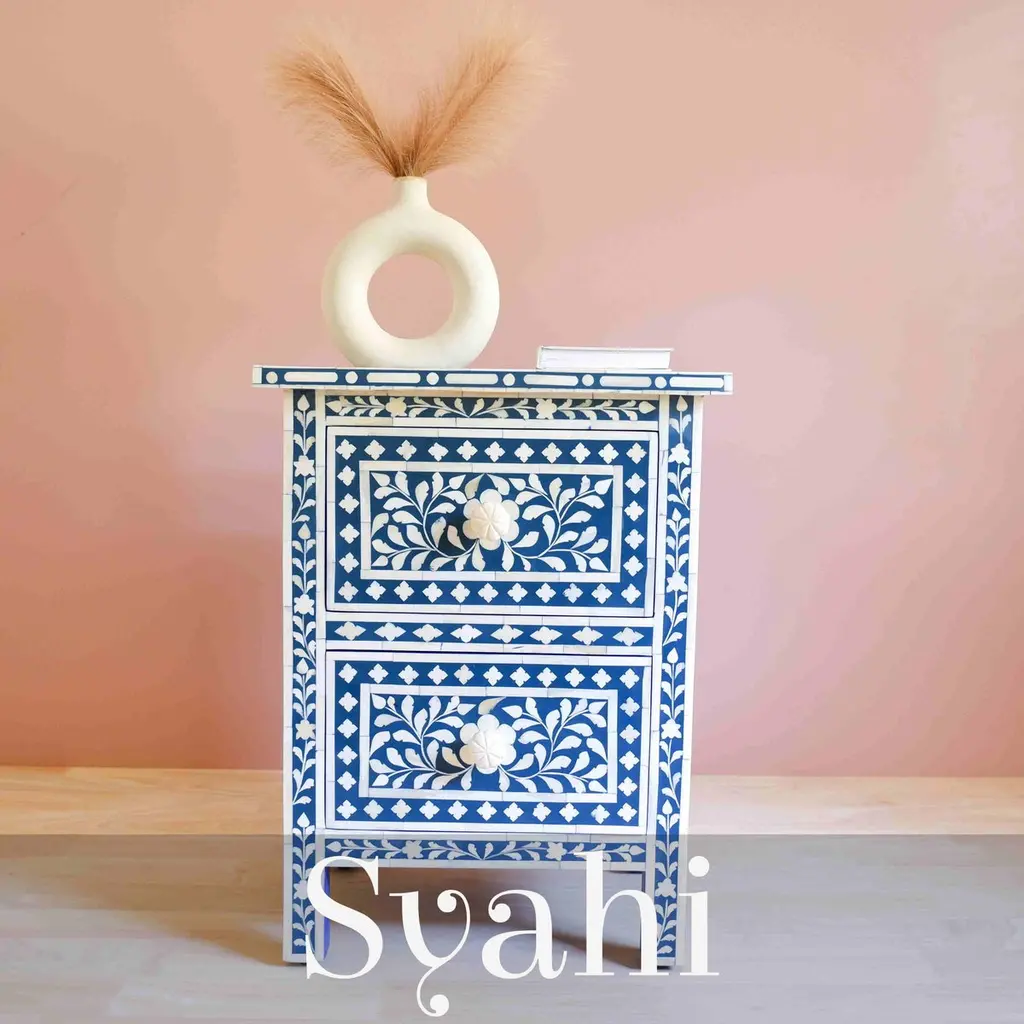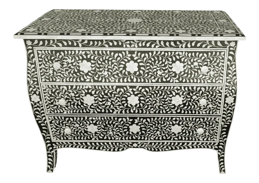 This stunning three-drawer dresser is entirely handmade, featuring intricate bone inlay spiral leaf patterns that are nothing short of breathtaking. The dresser is not only visually stunning but also highly functional with its spacious drawers, offering ample storage space for your clothing and accessories. Crafted to last for generations, this dresser is an heirloom piece that will be cherished for years to come. Add a touch of luxury to your home with our Bone Inlay Dresser! If you wish to customize the color of the dresser, inlay pattern, the drawer paint color please feel free to reach out to us. We would be happy to make a custom piece just for you.Details: 1. Materials used: Wood and Bone.2. Wipe with a damp cloth. Avoid chemical-based cleaning solutions.3. Avoid exposure to direct sunlight.4. Made in India.5. It will require minimal assembly of knobs. Assembly kit provided with the shipment.6. As the piece is handmade please expect slight colour variations.7. The texture and finish of the furniture are natural.8. Bone Knobs.9. Manufacturing time: 2-3 weeks. Shipping time: 1-2 weeks.10. Ships from India.