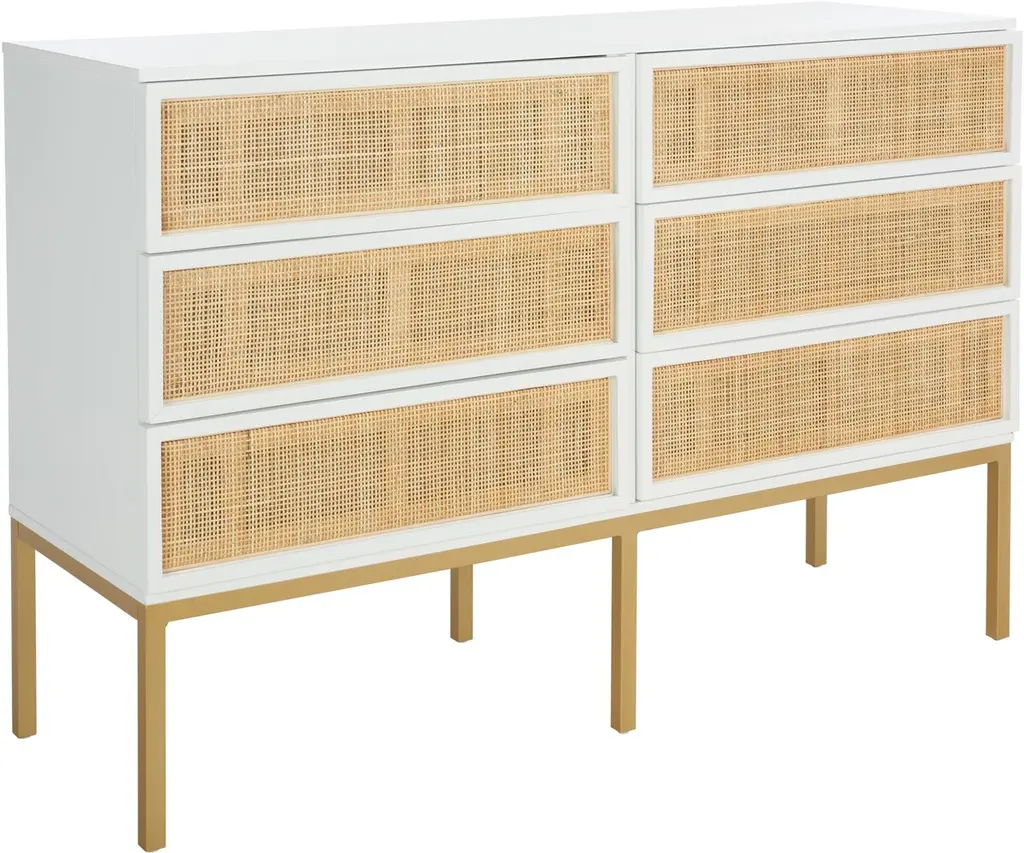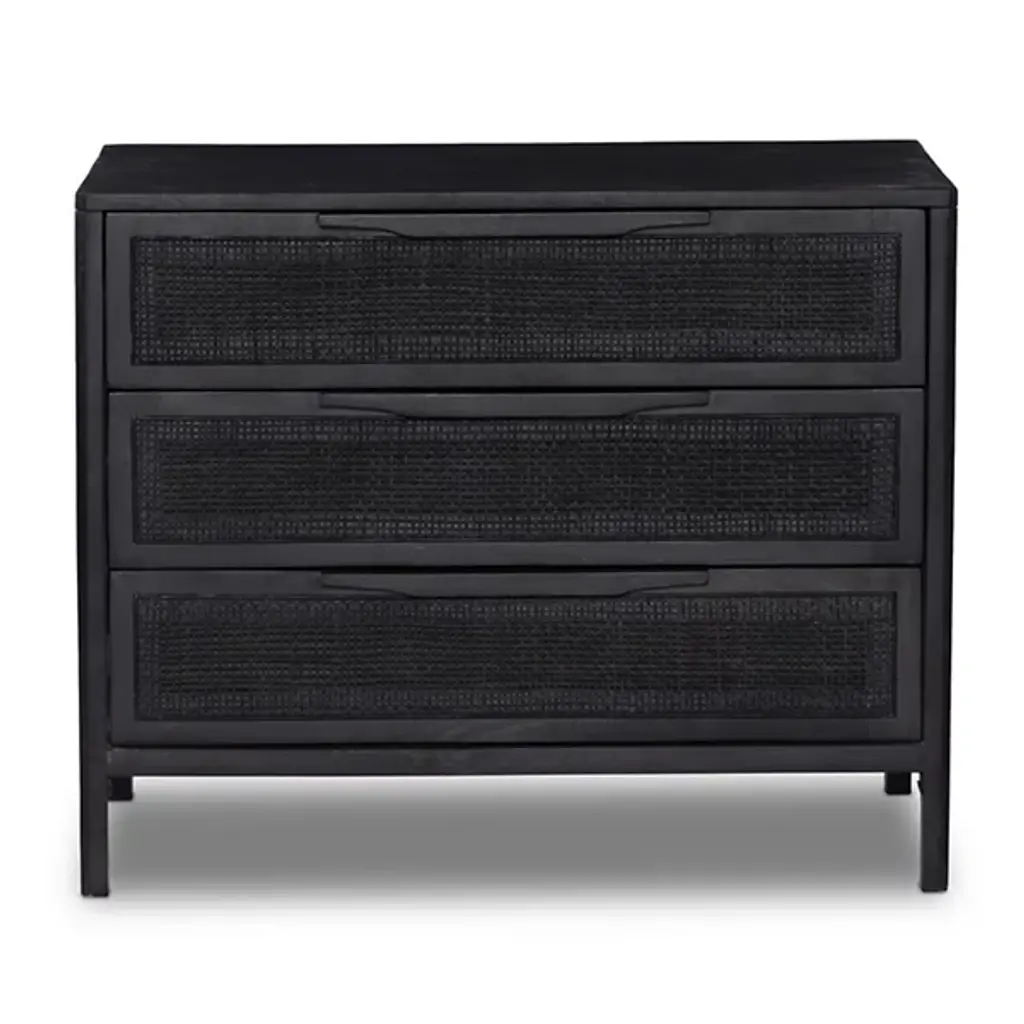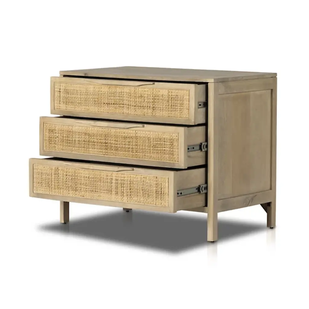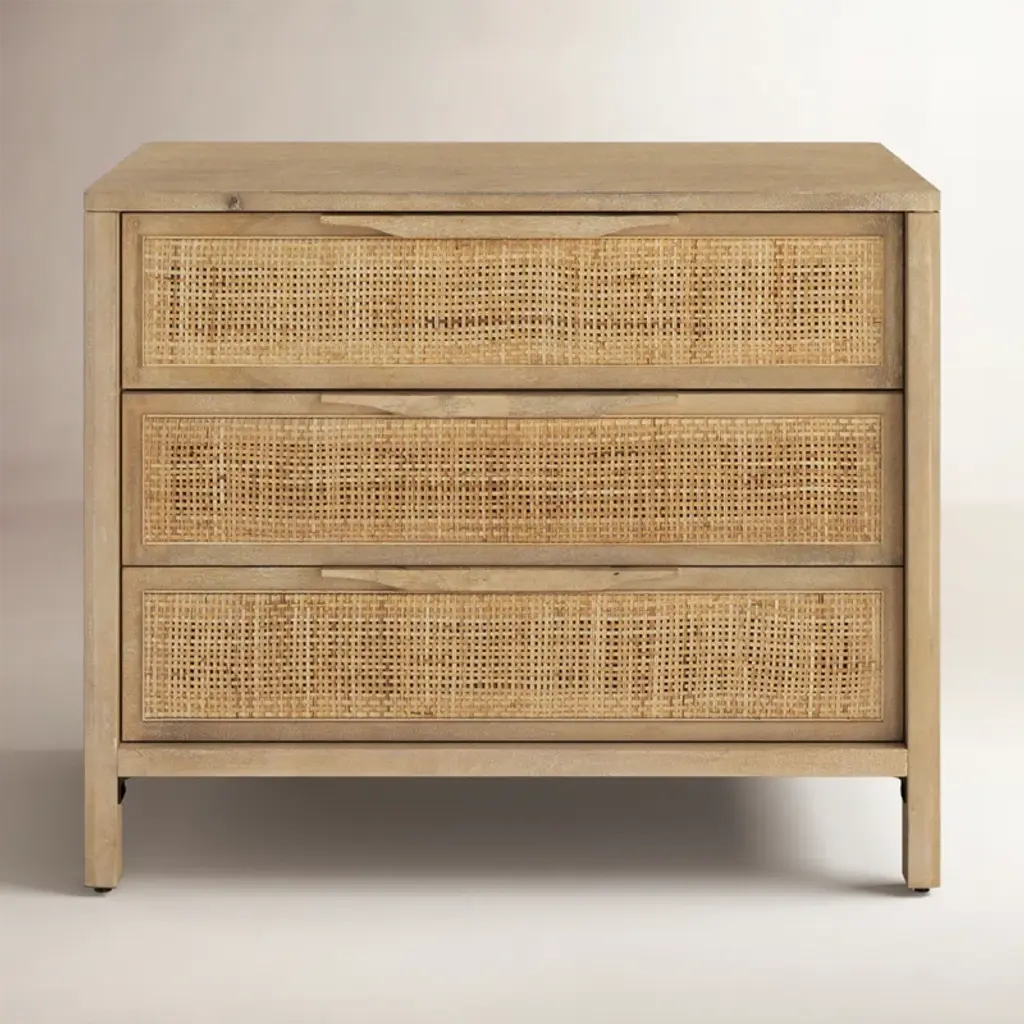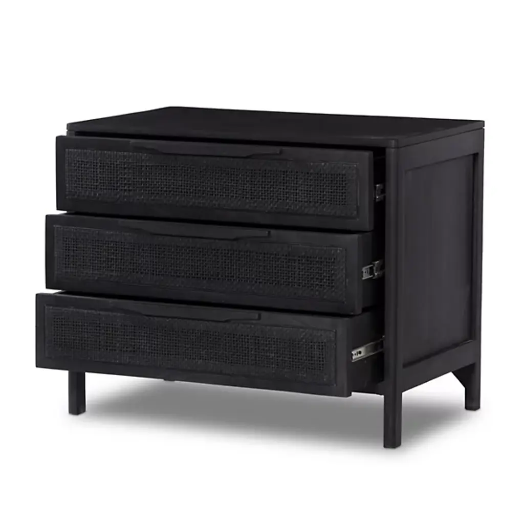 The Sydney Large Nightstand from Four Hands adds texture and convenience to one’s bedside with a refined coastal feel. The piece proudly showcases its craftsmanship and materials with a geometric design. Its framework is crafted from mango wood for a solid feel. The wood also shapes the comfortable pulls of each drawer. The facade of these drawers displays an intricate weave of natural cane for an extra dose of organic texture.