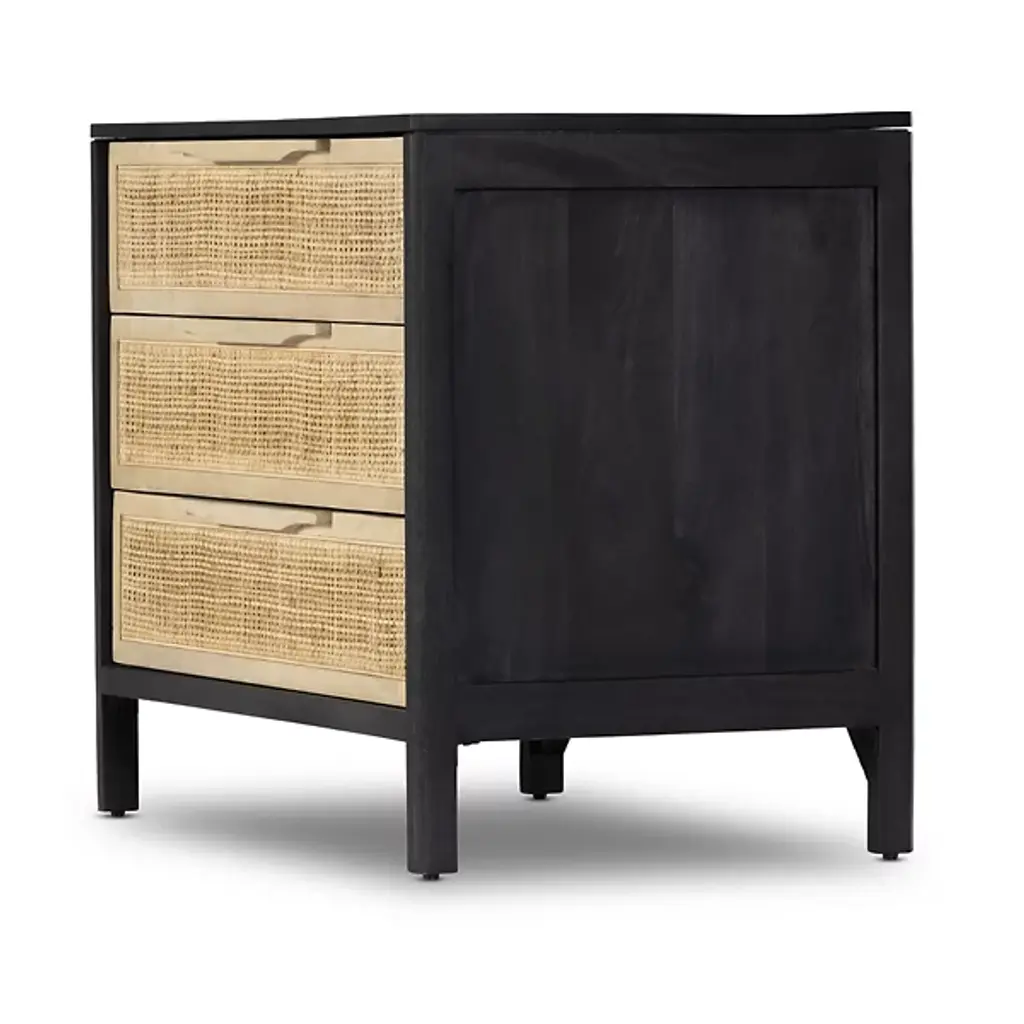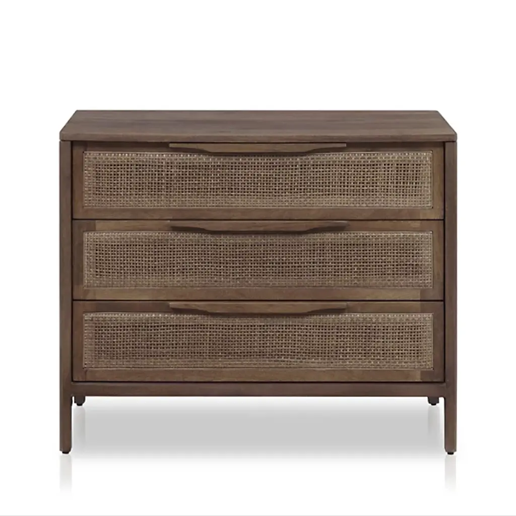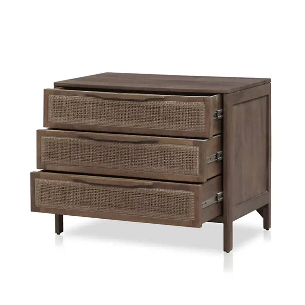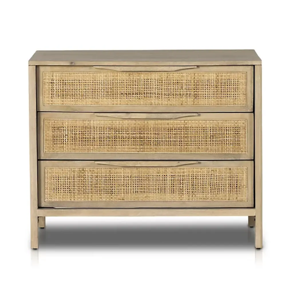 The Sydney Large Nightstand from Four Hands adds texture and convenience to one’s bedside with a refined coastal feel. The piece proudly showcases its craftsmanship and materials with a geometric design. Its framework is crafted from mango wood for a solid feel. The wood also shapes the comfortable pulls of each drawer. The facade of these drawers displays an intricate weave of natural cane for an extra dose of organic texture.
