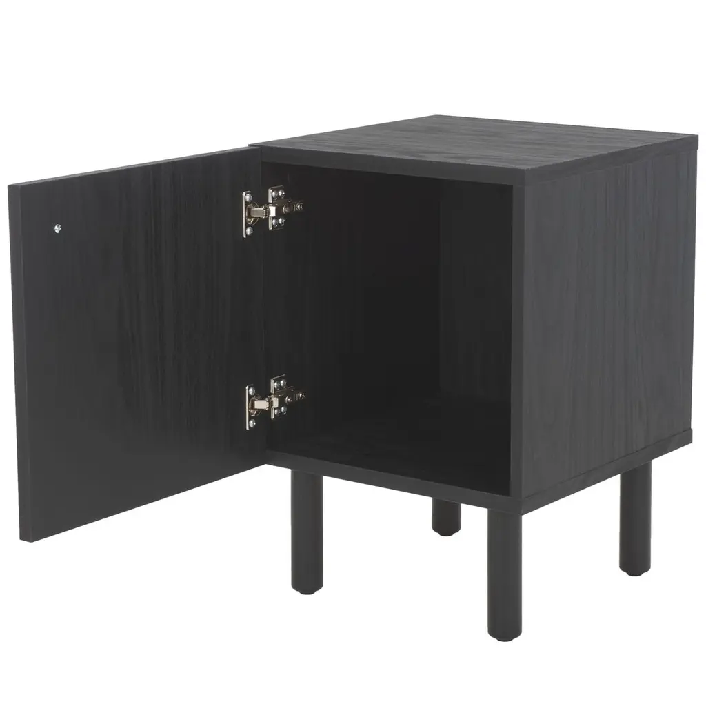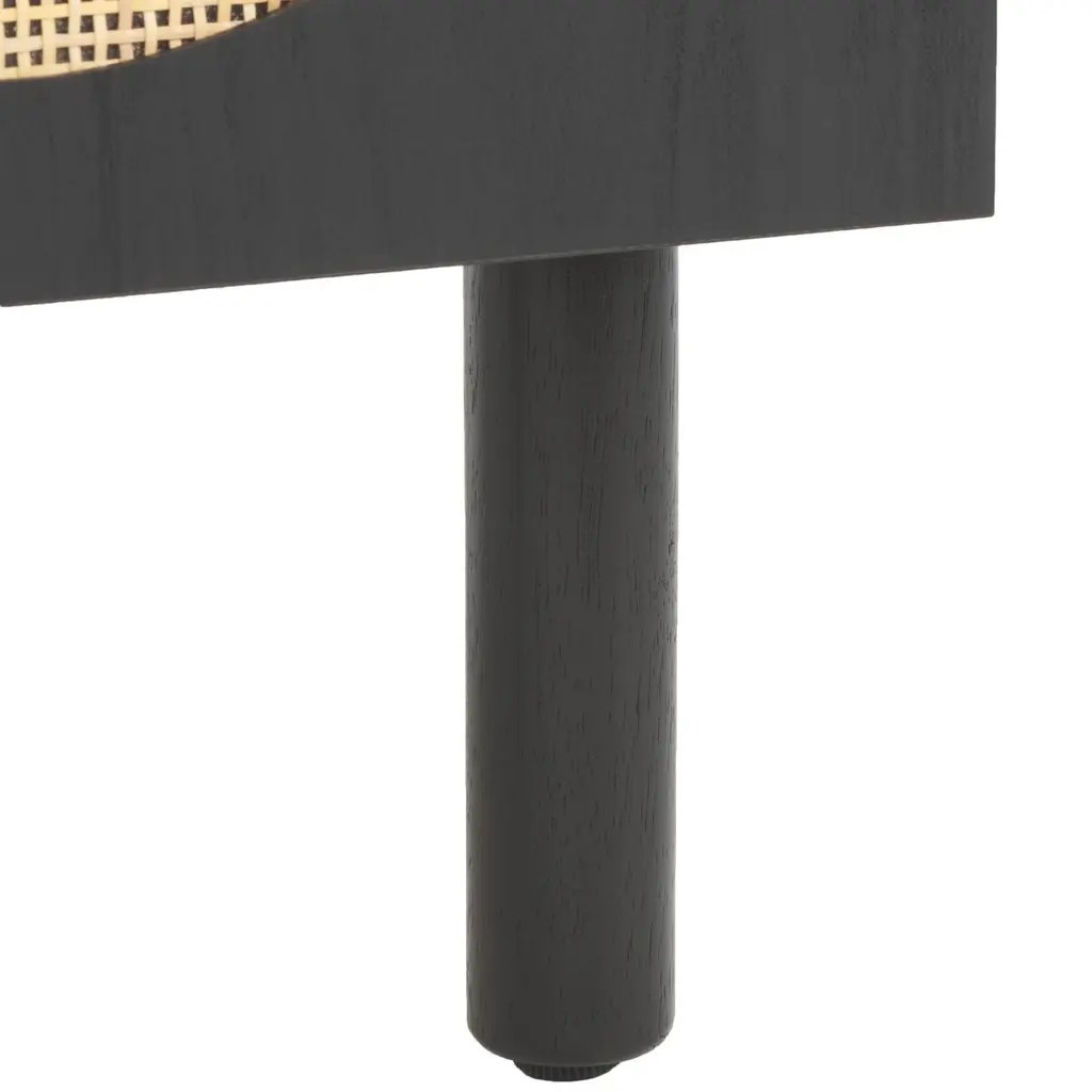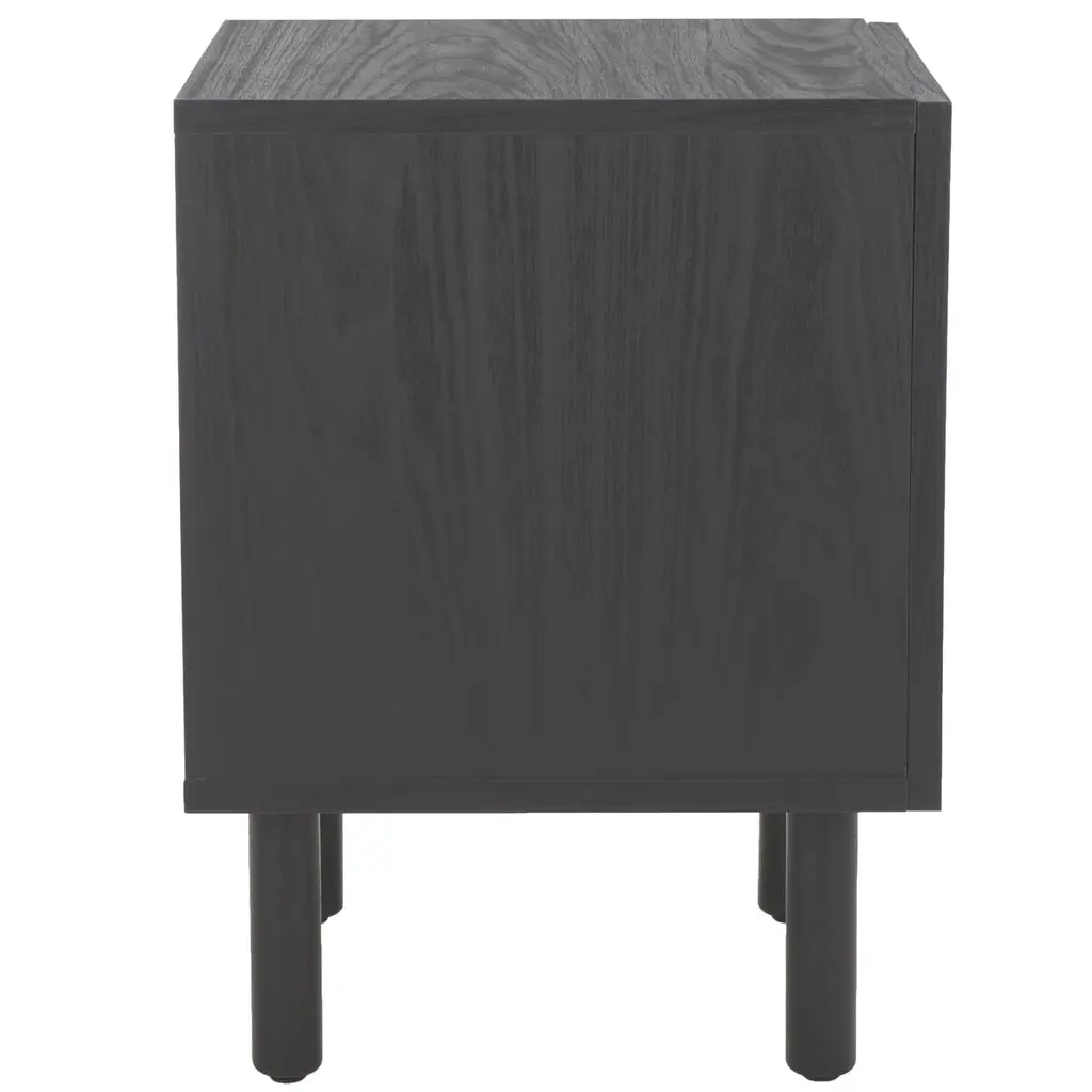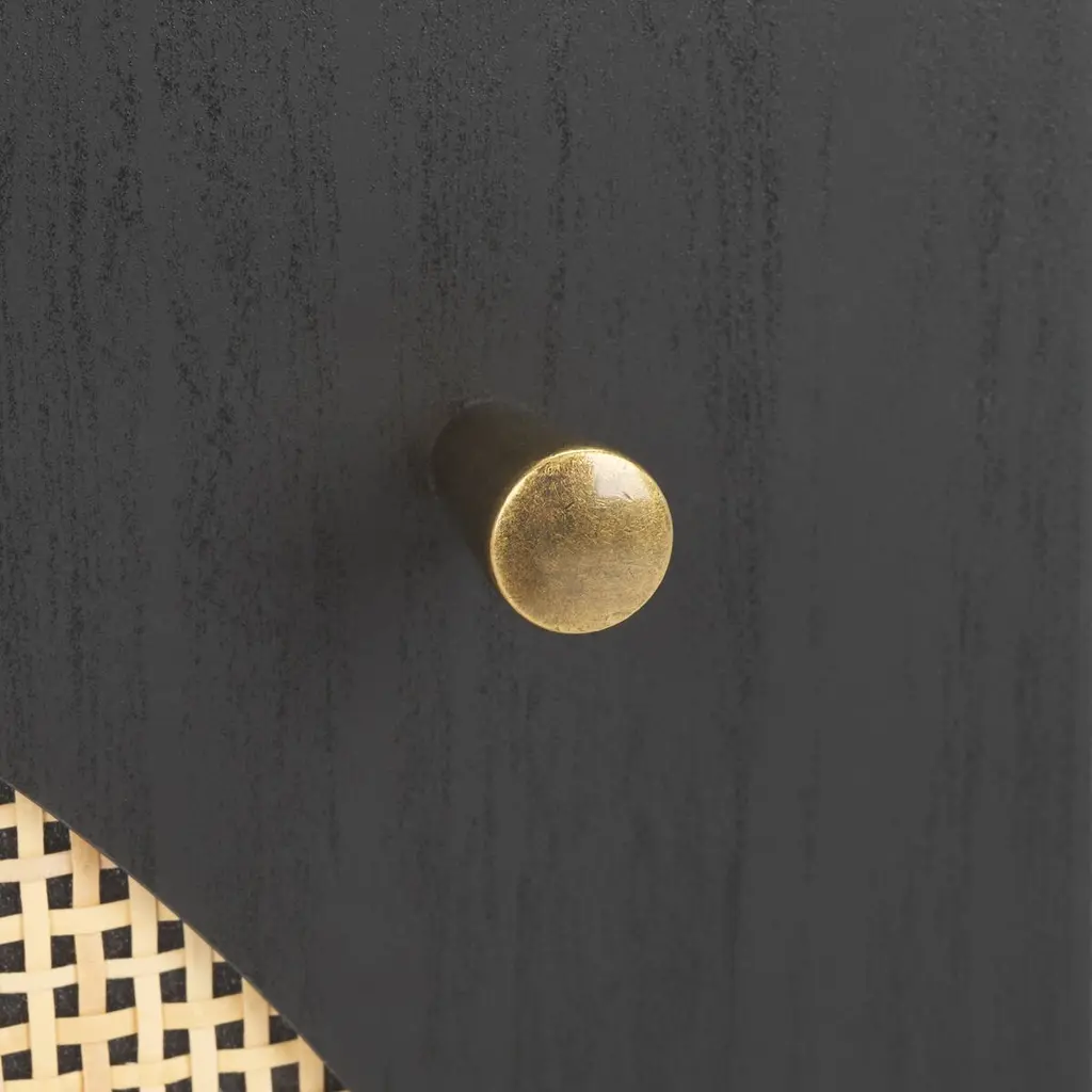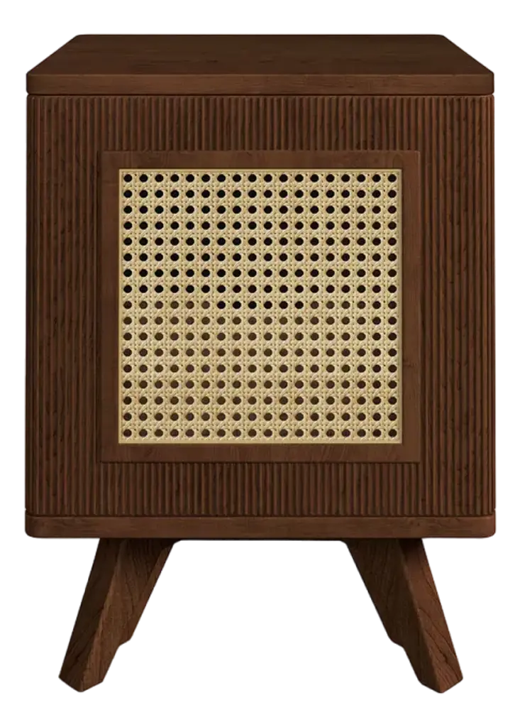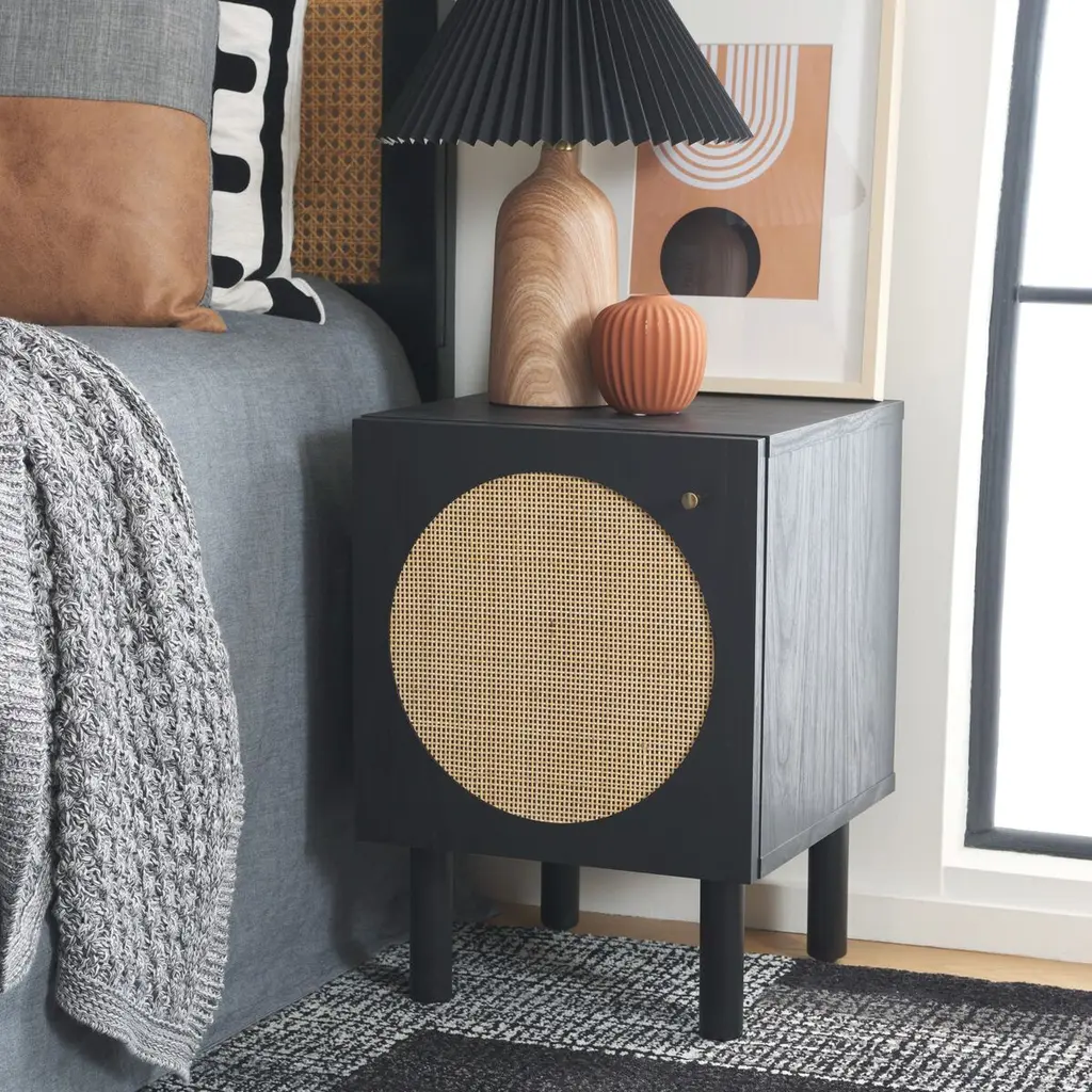 Embrace a modern and charming focal point with our Symmi Nightstand. Its sleek and clean-lined profile stands out with bold geometry and rich textures. The nightstand features a bold circular cut-out on each side, covered in rattan mesh to complement the rich wooden textures of the console. Lending a warm and breezy update to your home, our nightstand includes one roomy cabinet and open shelves to keep all your knick-knacks organized.