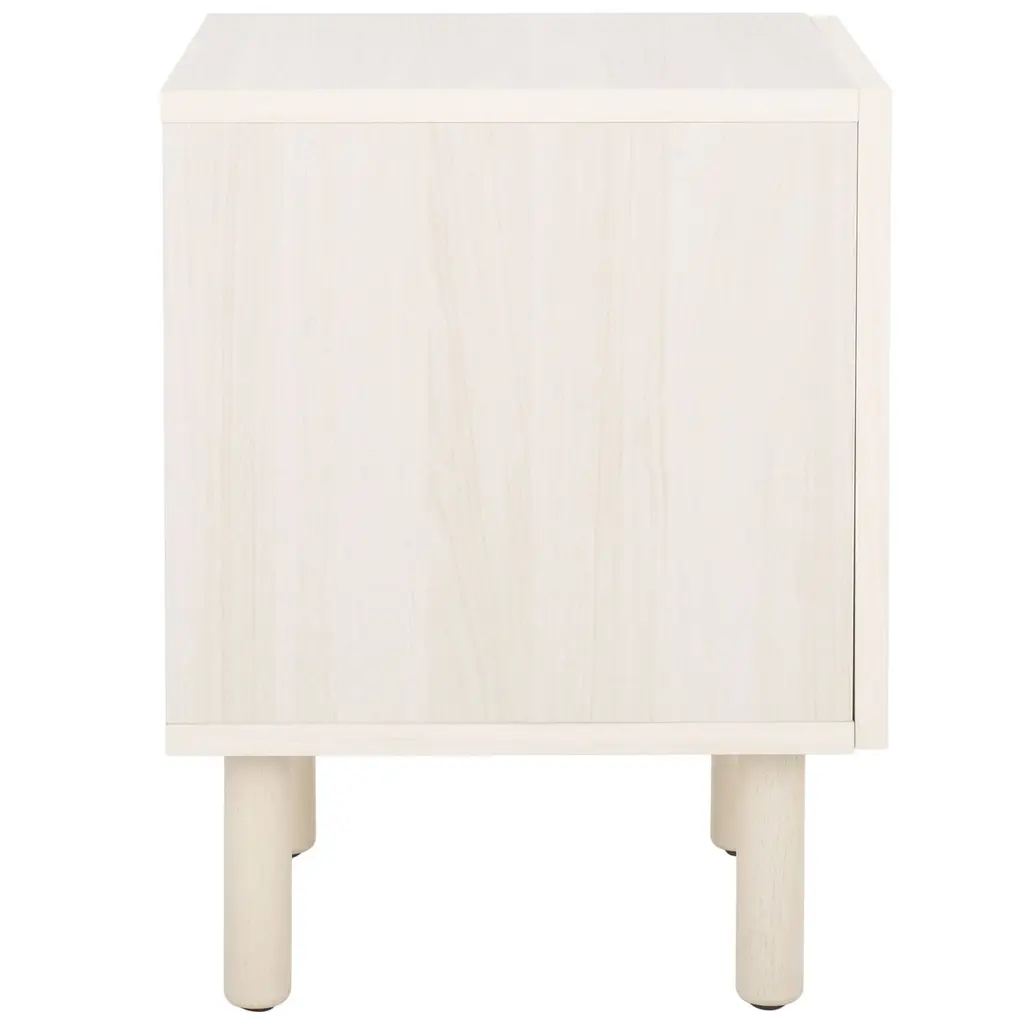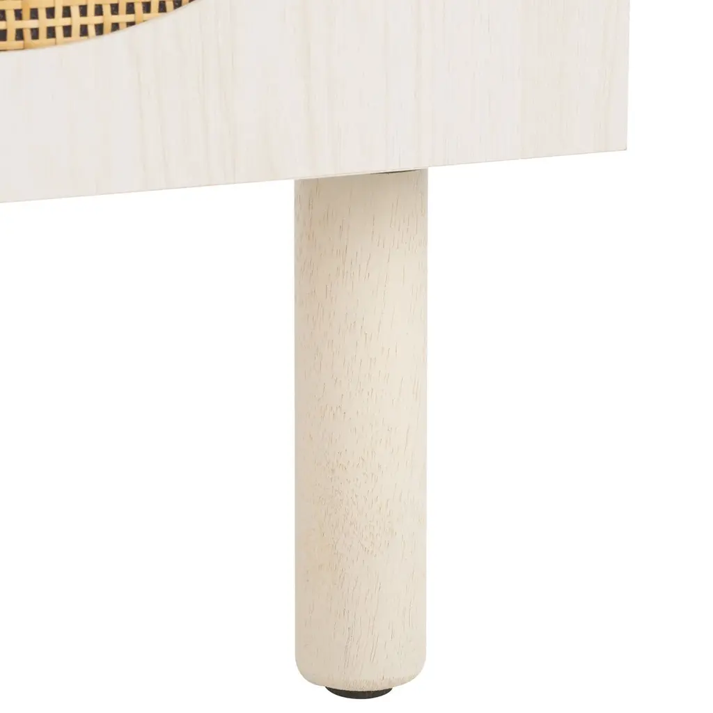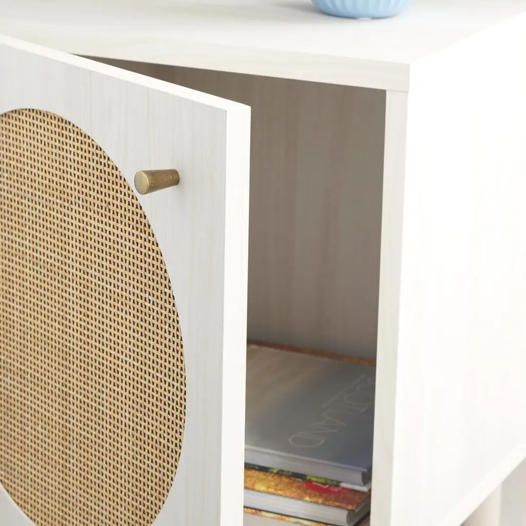 Embrace a modern and charming focal point with our Symmi Nightstand. Its sleek and clean-lined profile stands out with bold geometry and rich textures. The nightstand features a bold circular cut-out on each side, covered in rattan mesh to complement the rich wooden textures of the console. Lending a warm and breezy update to your home, our nightstand includes one roomy cabinet and open shelves to keep all your knick-knacks organized.