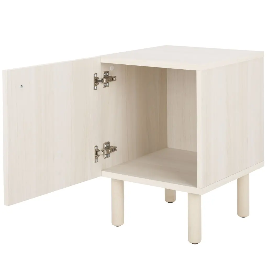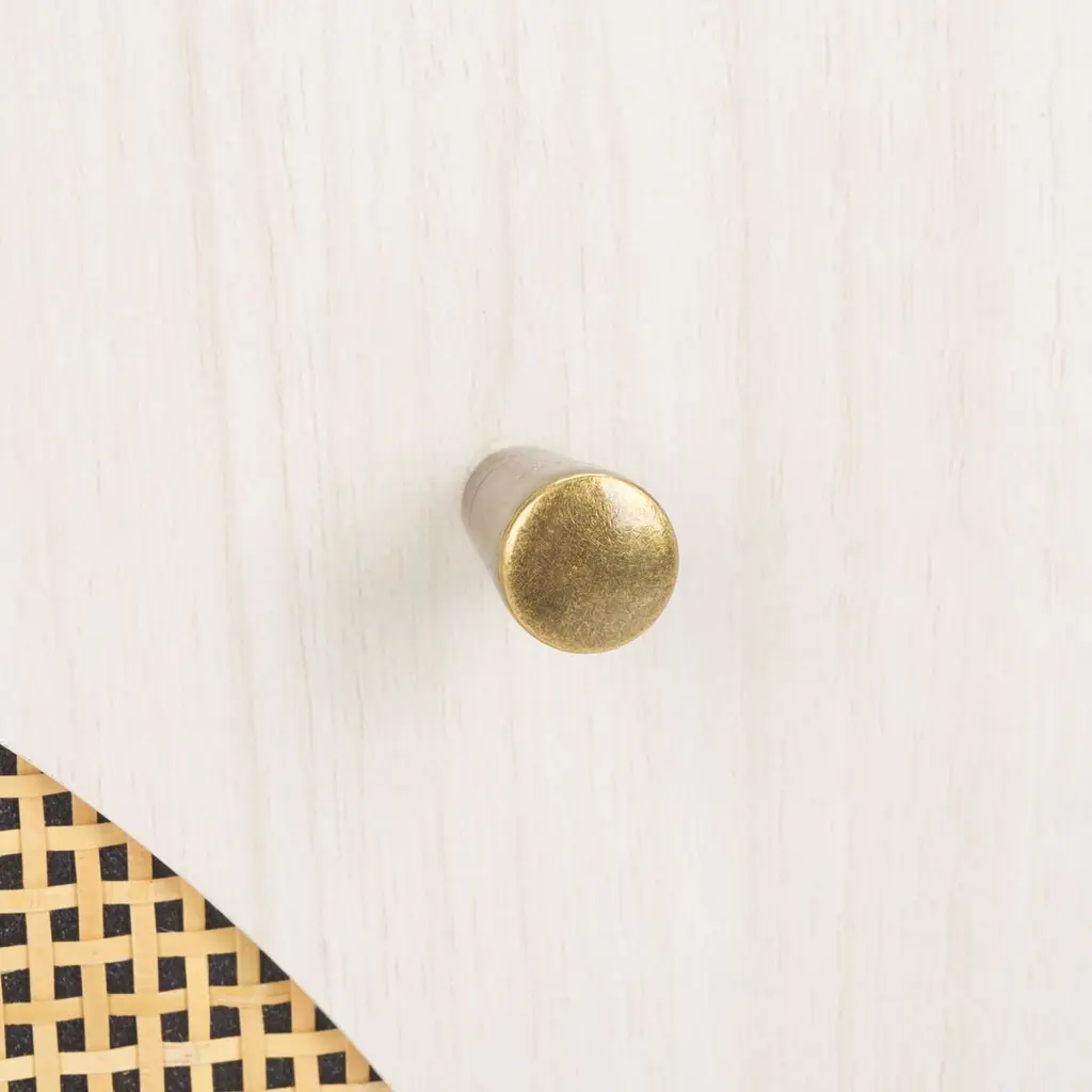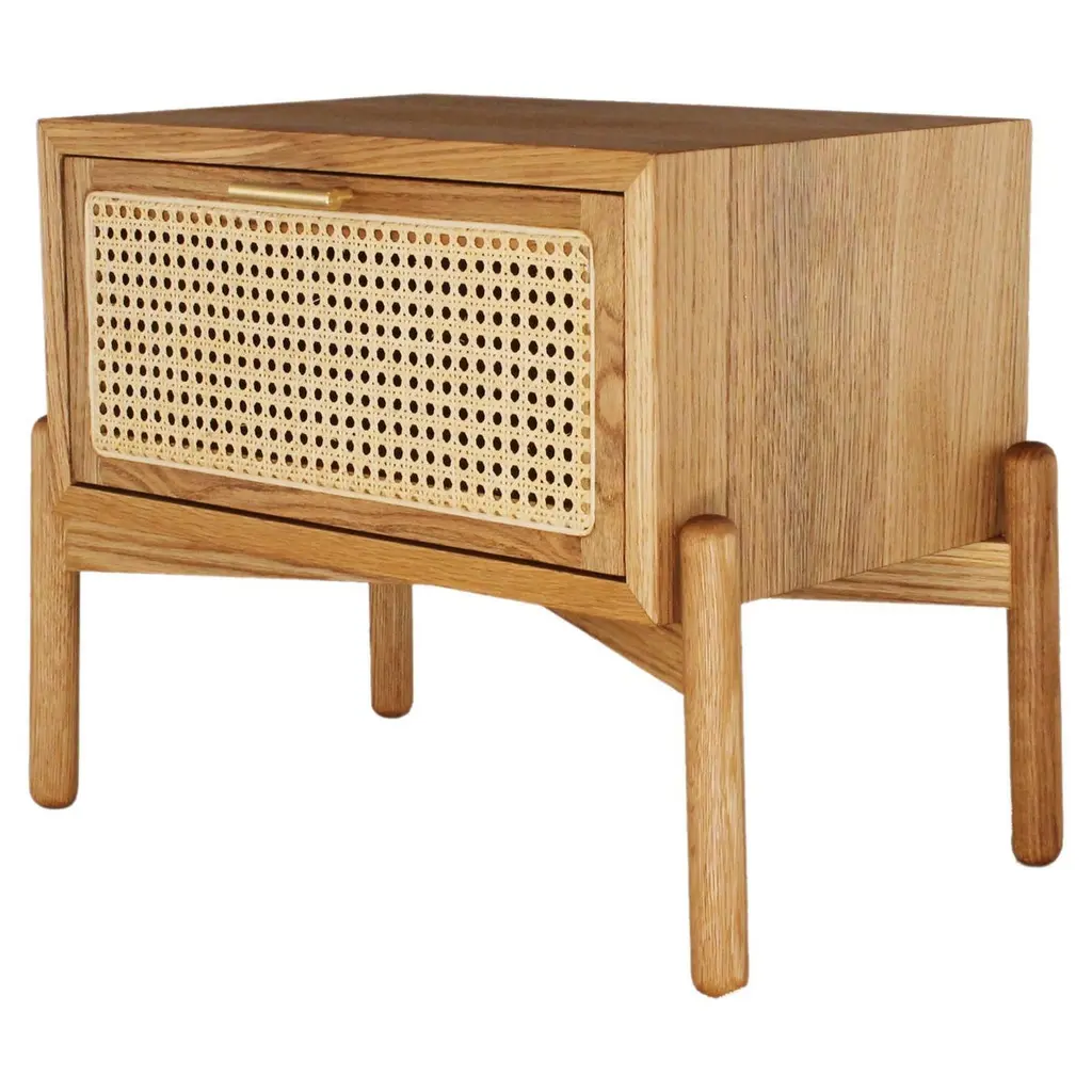 Embrace a modern and charming focal point with our Symmi Nightstand. Its sleek and clean-lined profile stands out with bold geometry and rich textures. The nightstand features a bold circular cut-out on each side, covered in rattan mesh to complement the rich wooden textures of the console. Lending a warm and breezy update to your home, our nightstand includes one roomy cabinet and open shelves to keep all your knick-knacks organized.