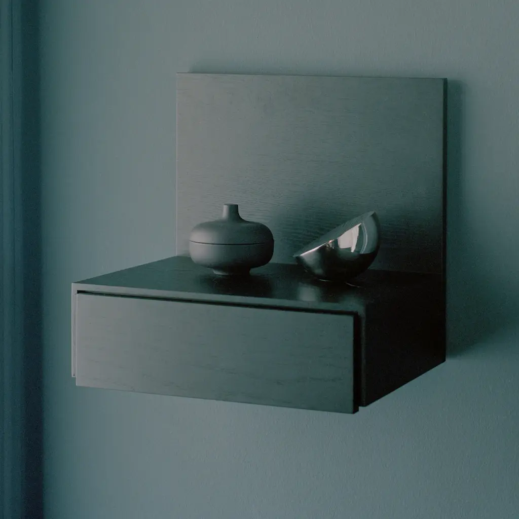 Enhance your bedroom with the Tana Wall Mounted Nightstand from New Works, designed by Rikke Rützou Arnved. This piece features a minimalist design with clean lines and no visible handles, maintaining a sleek appearance. Crafted from high-quality oak or walnut, it offers a floating surface perfect for essentials and a discreet drawer for additional storage. The horizontal surface provides a ledge for items, while the vertical panel frames them elegantly. Ideal for various settings, it serves as a stylish storage solution next to a bed, sofa, or in an entryway.