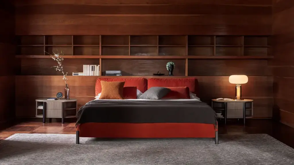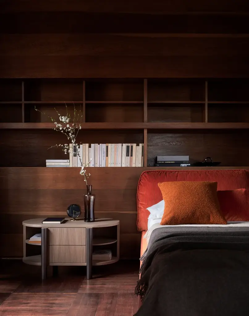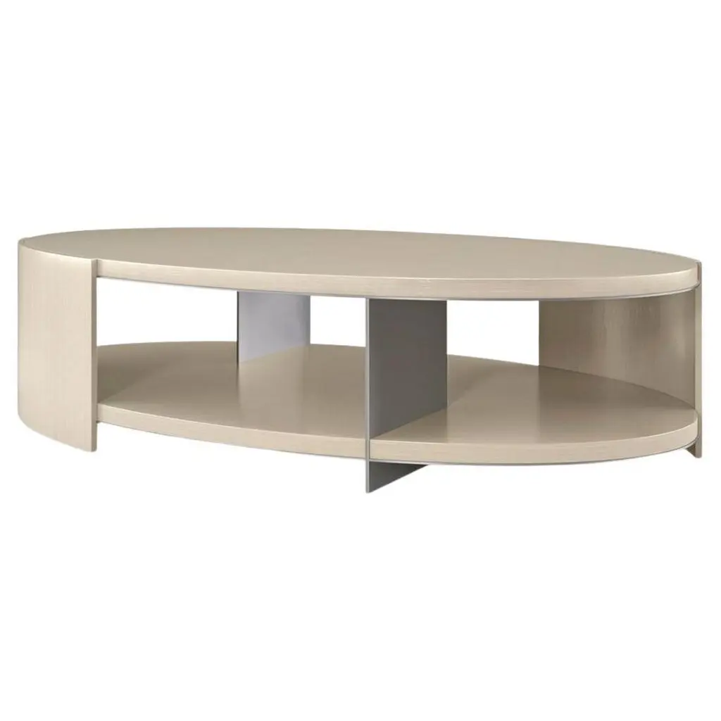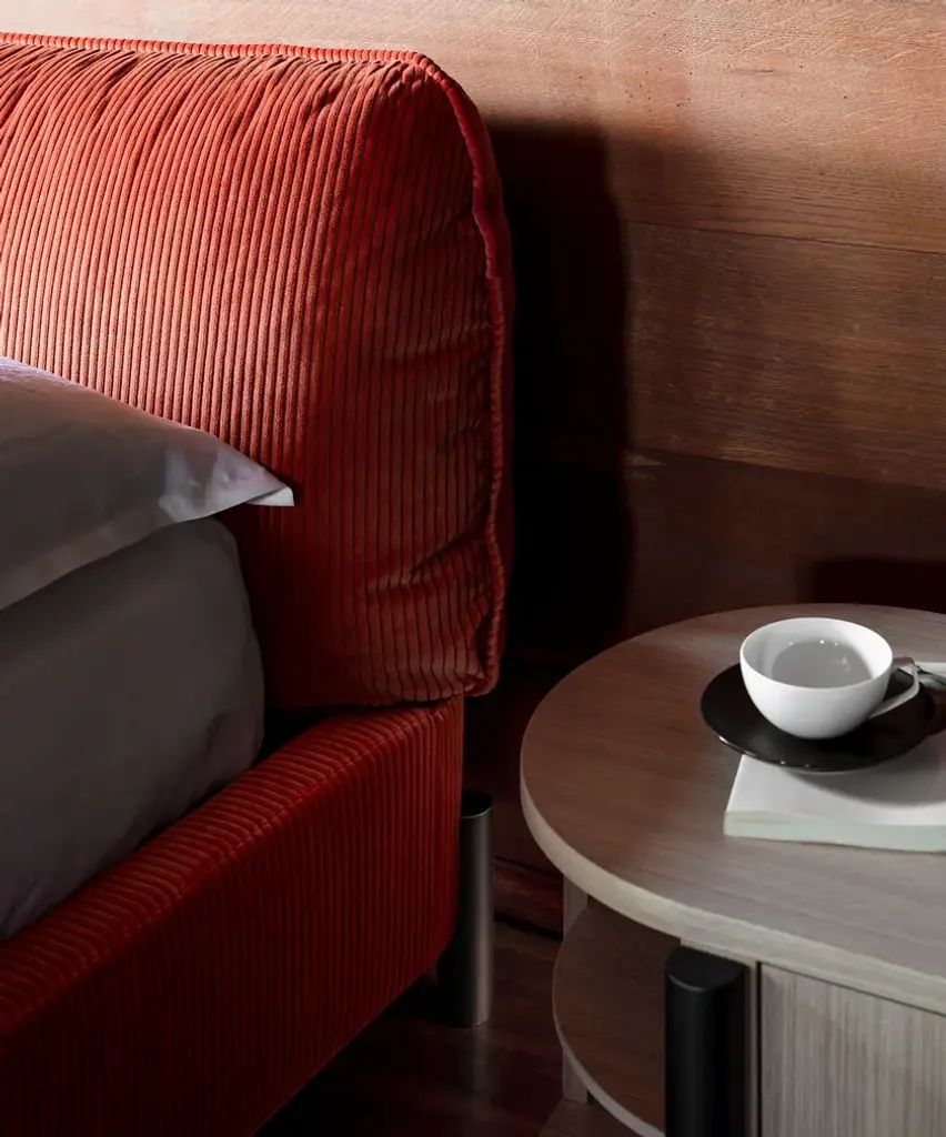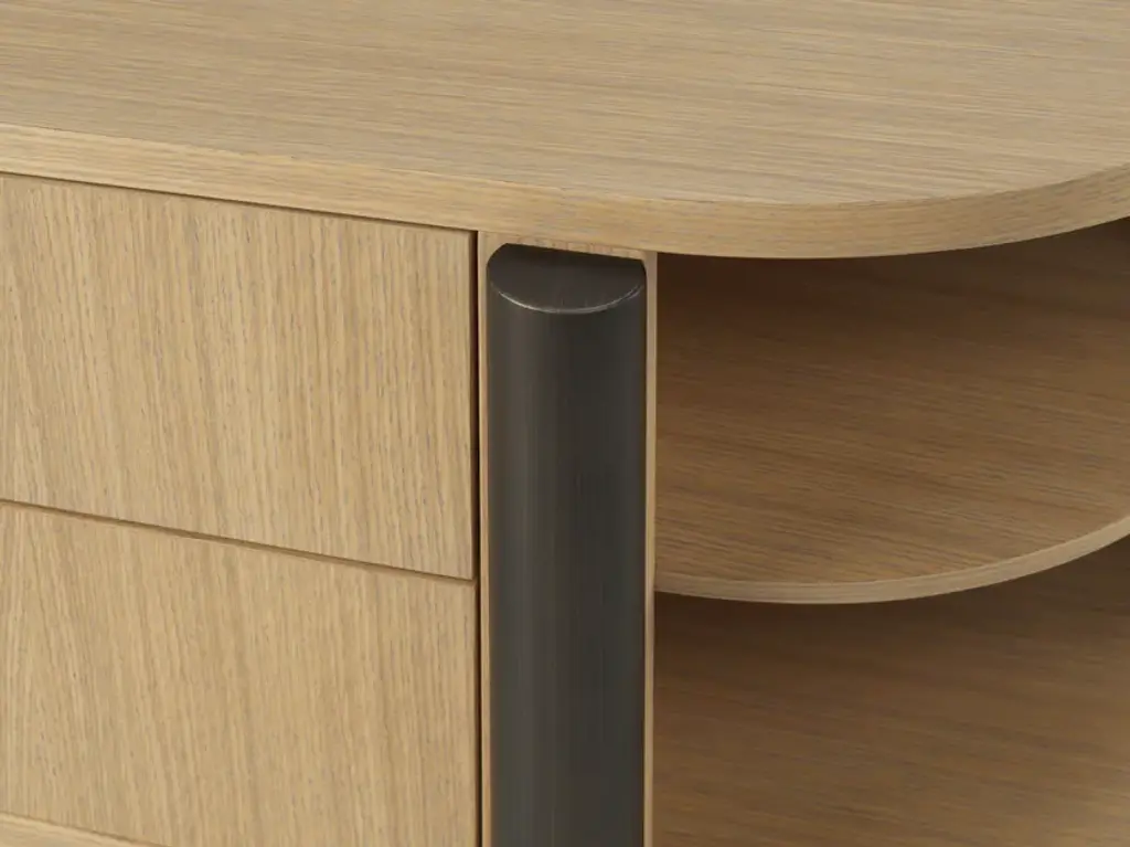 The Tarantino chest of drawers and bedside table feature curved and delicate lines that reference those of the bed, which they complement naturally.Perfect ovals formed through impeccable craftsmanship, these bedside tables feature a main body in oak with side shelving, and casted aluminum structure that works both as handle and as supporting foot.