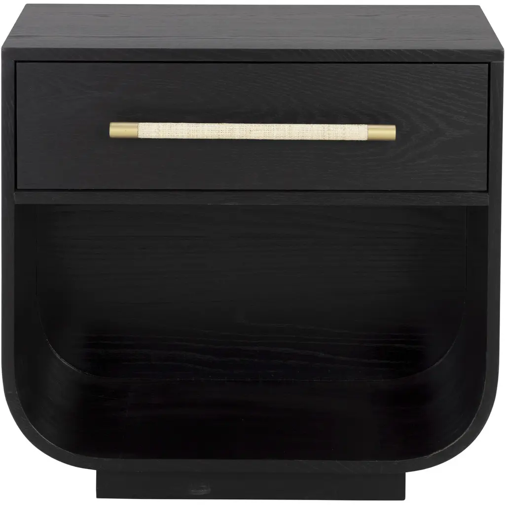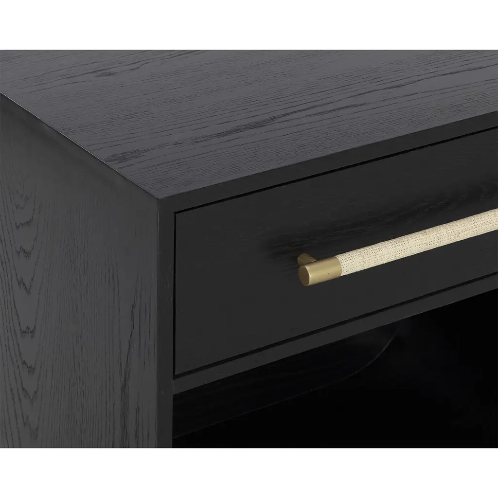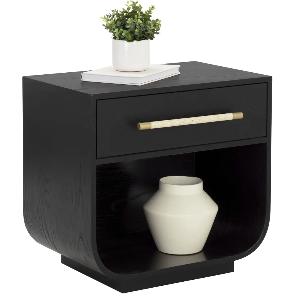 Fluid lines and gentle curves make up the modern silhouette of the Tarrant Nightstand. The raffia wrapped drawer handle adds an understated touch to the black oak veneer base. Handle With Care: This design has been crafted with raffia. Each item will exhibit unique traits such as texture and thickness variations that add to the natural character of this finely woven material. Visit our Product Care page for more information on how to ensure the lasting beauty of this piece.