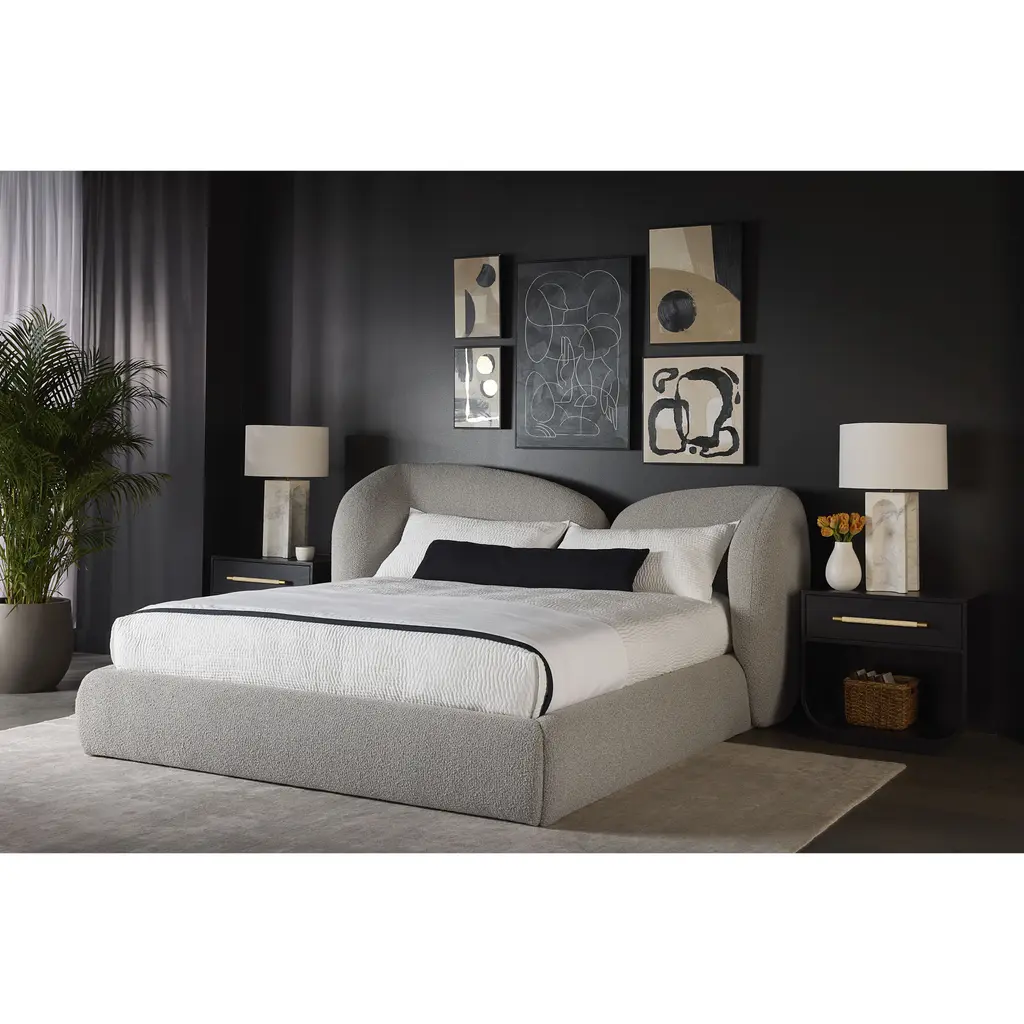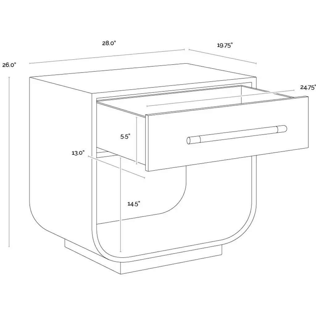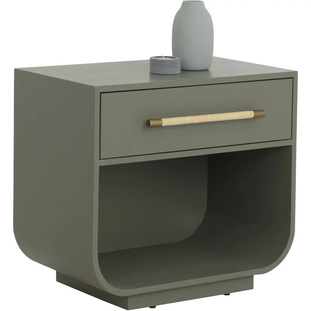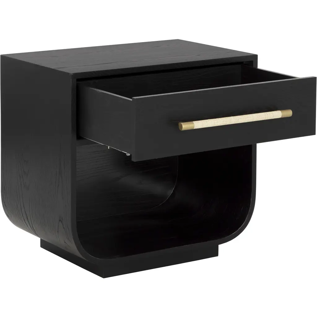 Fluid lines and gentle curves make up the modern silhouette of the Tarrant Nightstand. The raffia wrapped drawer handle adds an understated touch to the black oak veneer base. Handle With Care: This design has been crafted with raffia. Each item will exhibit unique traits such as texture and thickness variations that add to the natural character of this finely woven material. Visit our Product Care page for more information on how to ensure the lasting beauty of this piece.
