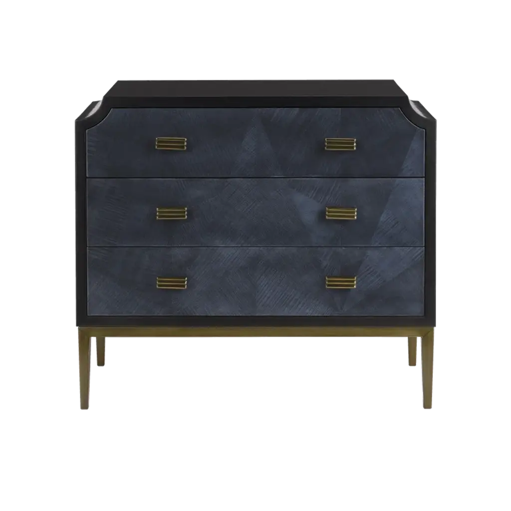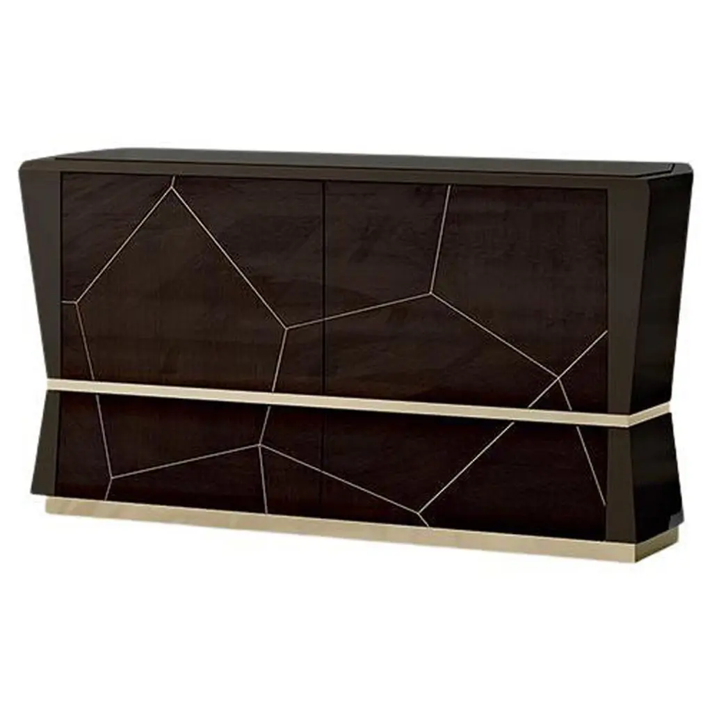 This nightstand feature three drawers with brass details and a matte brown wooden top. With its iconic shape almost like a diamond, enriched by the use of "Lati" exotic wood on the drawers. The irregular decorations are hand-engraved, fulfilled with liquid brass metal finishing. All is completed by a central and base strip in galvanic gold metal. Please ask Concierge for customization options.