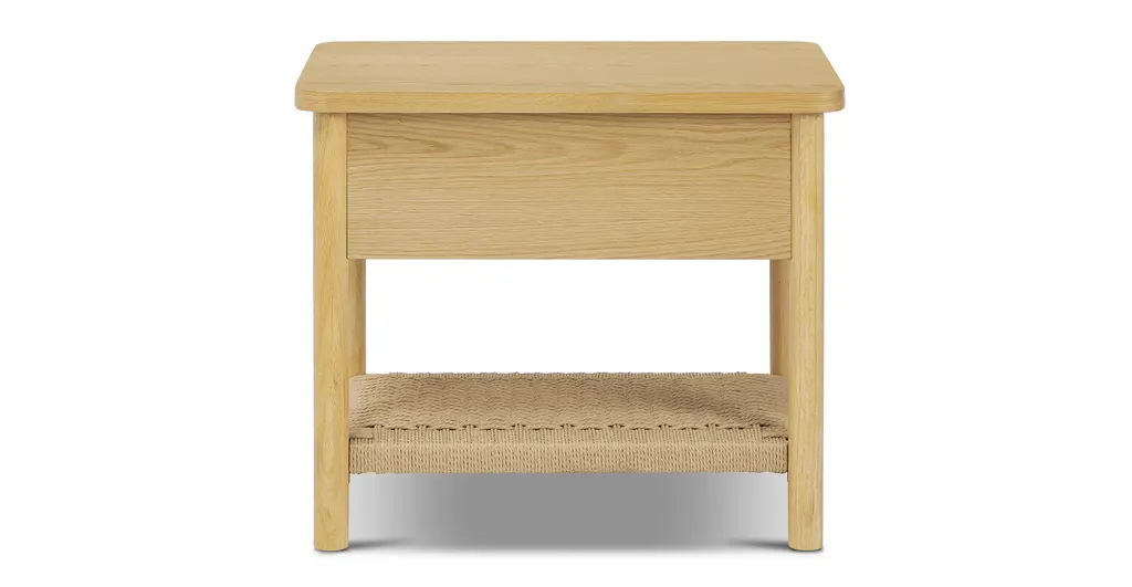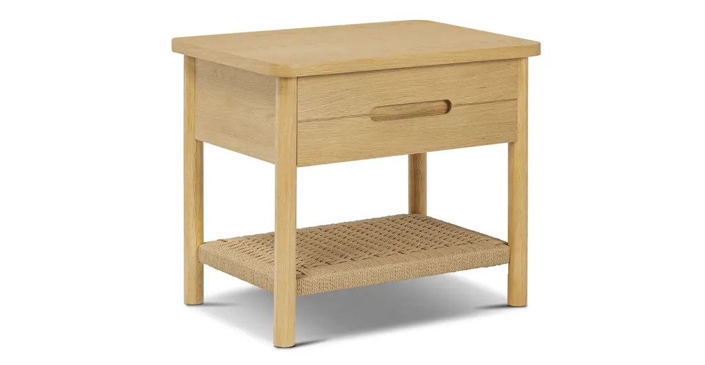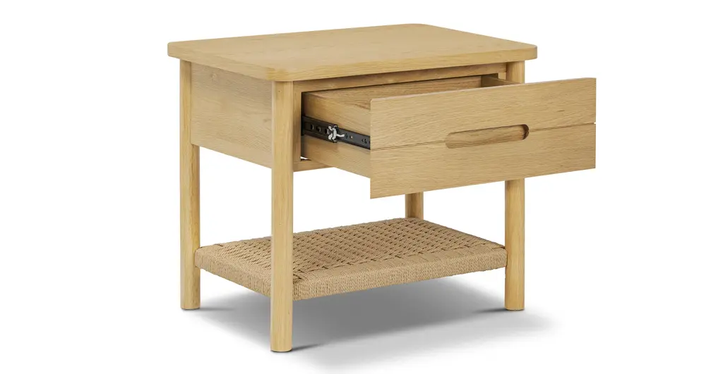 Meet your new bedside sidekick—a nightstand that’s as clever as it is charming. With a handwoven cord shelf adding artisanal flair and a drawer that glides open on sleek metal tracks to hide your nighttime treasures, it’s built from solid and veneered wood for durability and style. Perfect for keeping your space clutter-free and full of character.