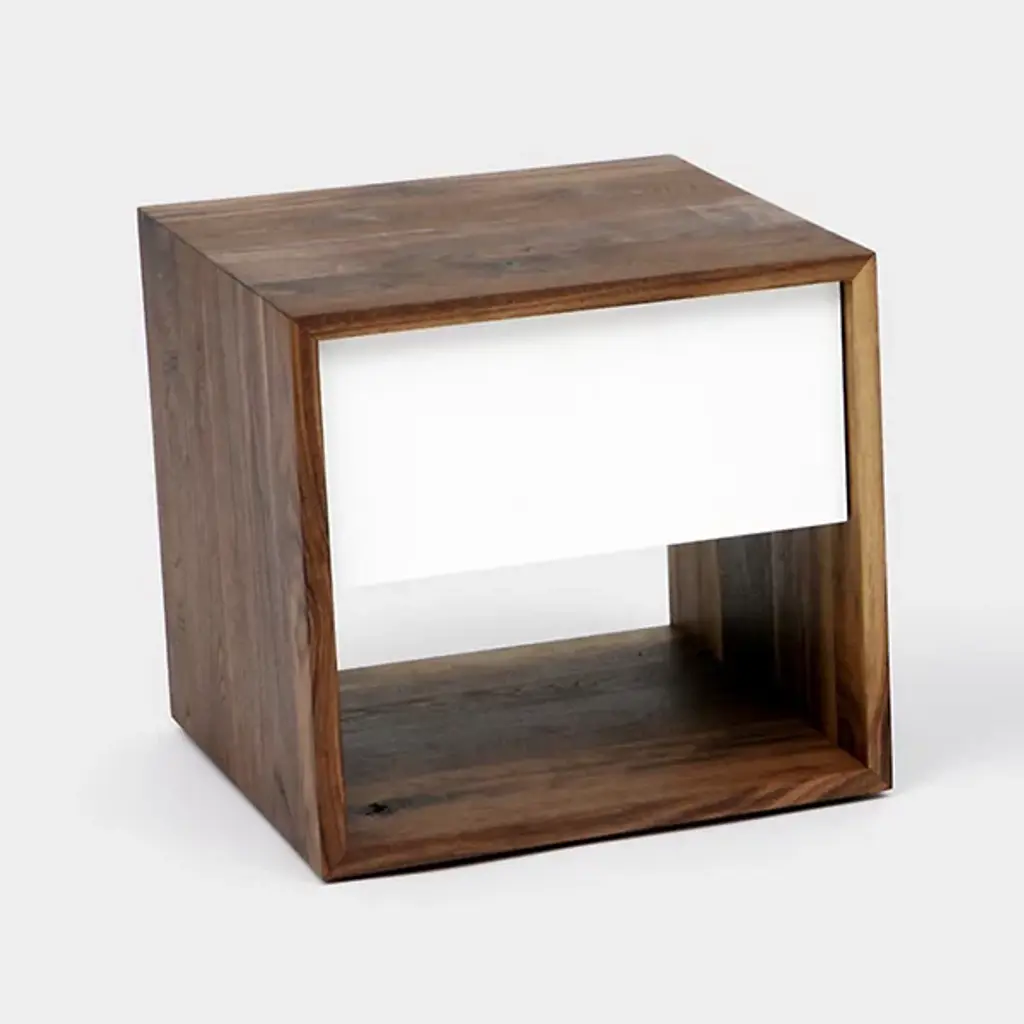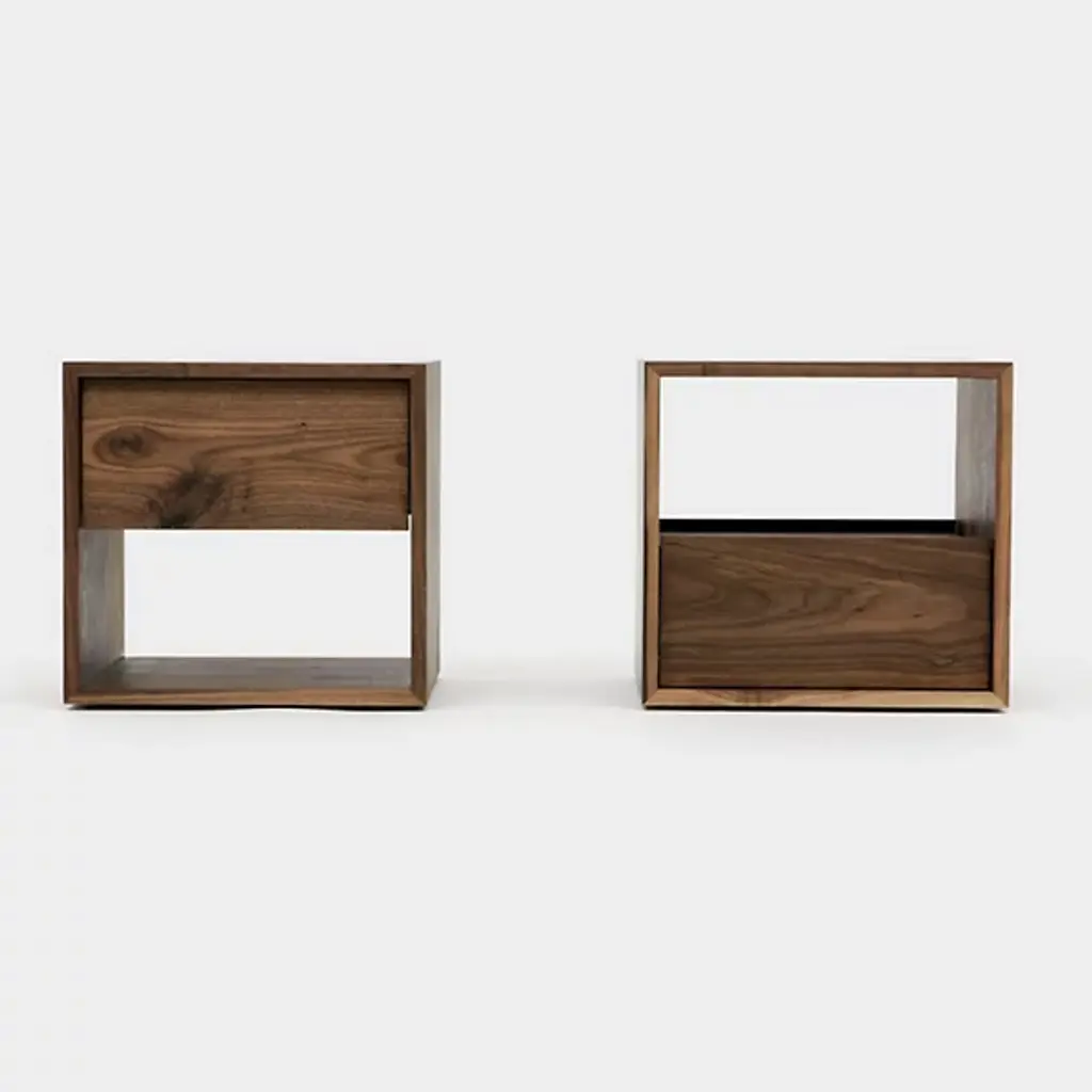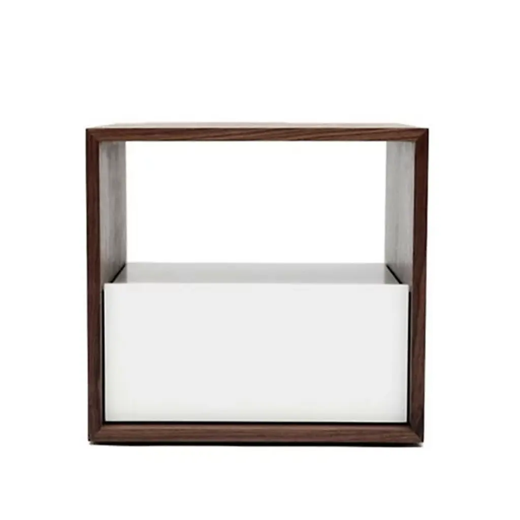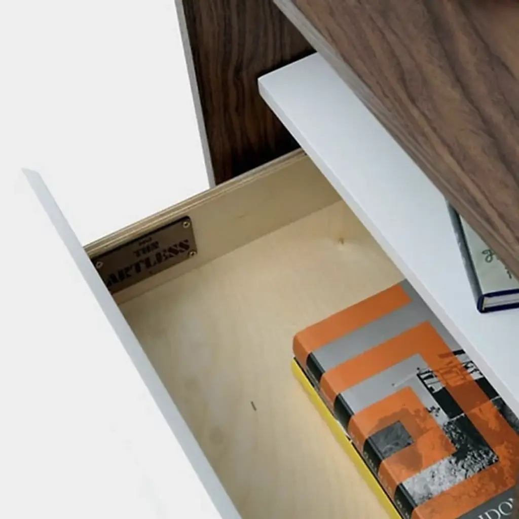 The THN .75 Nightstand speaks to the minimalist style that is found at the heart of all ARTLESS designs. Standing at 17 inches high, this low nightstand features the combination of solid walnut and contrasting white lacquer. The drawer sits low to the floor, allowing the open space to act as a functional shelf. THN .75 Nightstand is crafted with a 1-inch walnut frame, lacquered drawer box, Baltic birch plywood drawer, and an easy close drawer. The Nightstand comes in two options, with either a drawer on the top or the bottom. ARTLESS strives to keep the wood used in our products in its most natural state, solid wood may exhibit slight variations in color and texture. Each piece is unique.