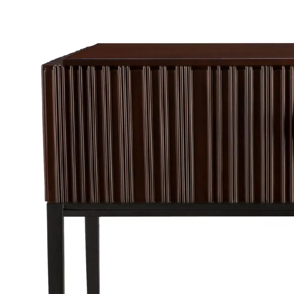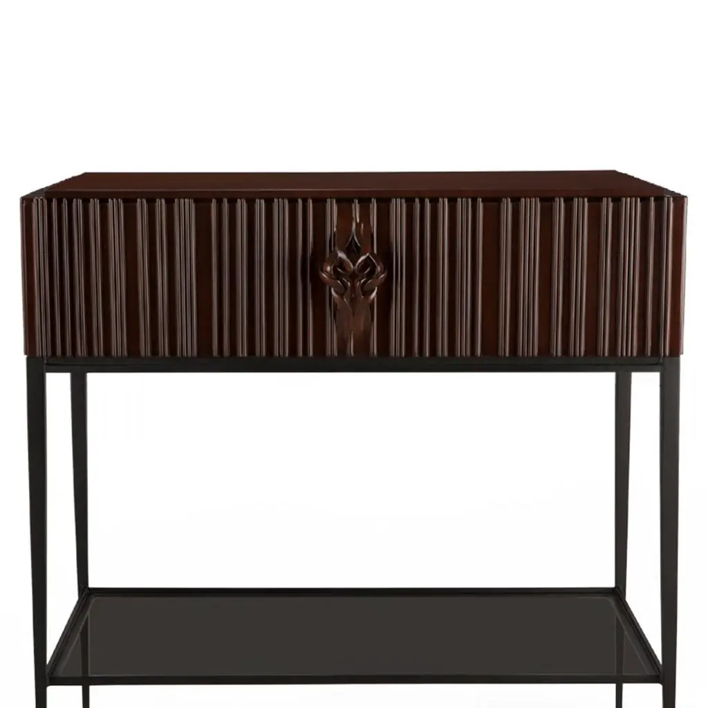 Nightstand or side table Thomas in solid hand-carved mahogany wood. With forged iron base and with black tempered glass shelf. One drawer with ultra-Suede easy slide system.In natural tabac and black satin finish.Also available with other finishes.