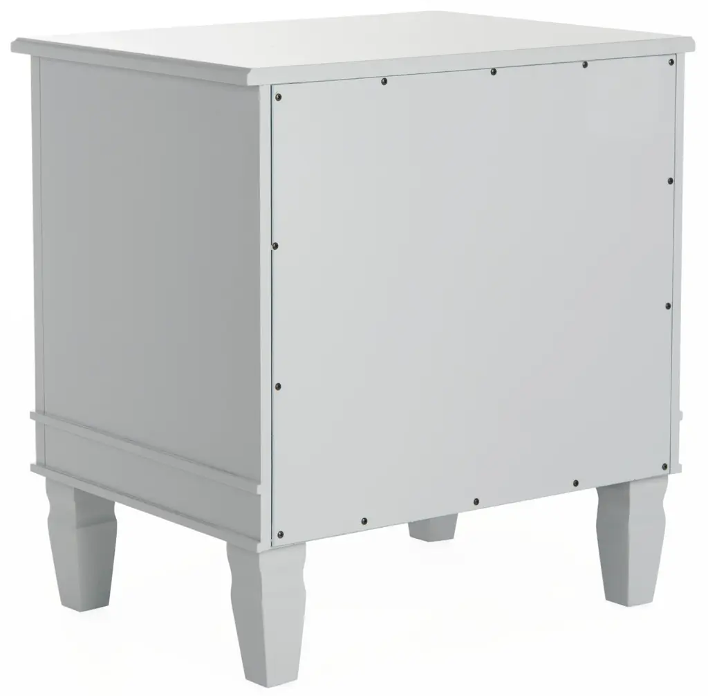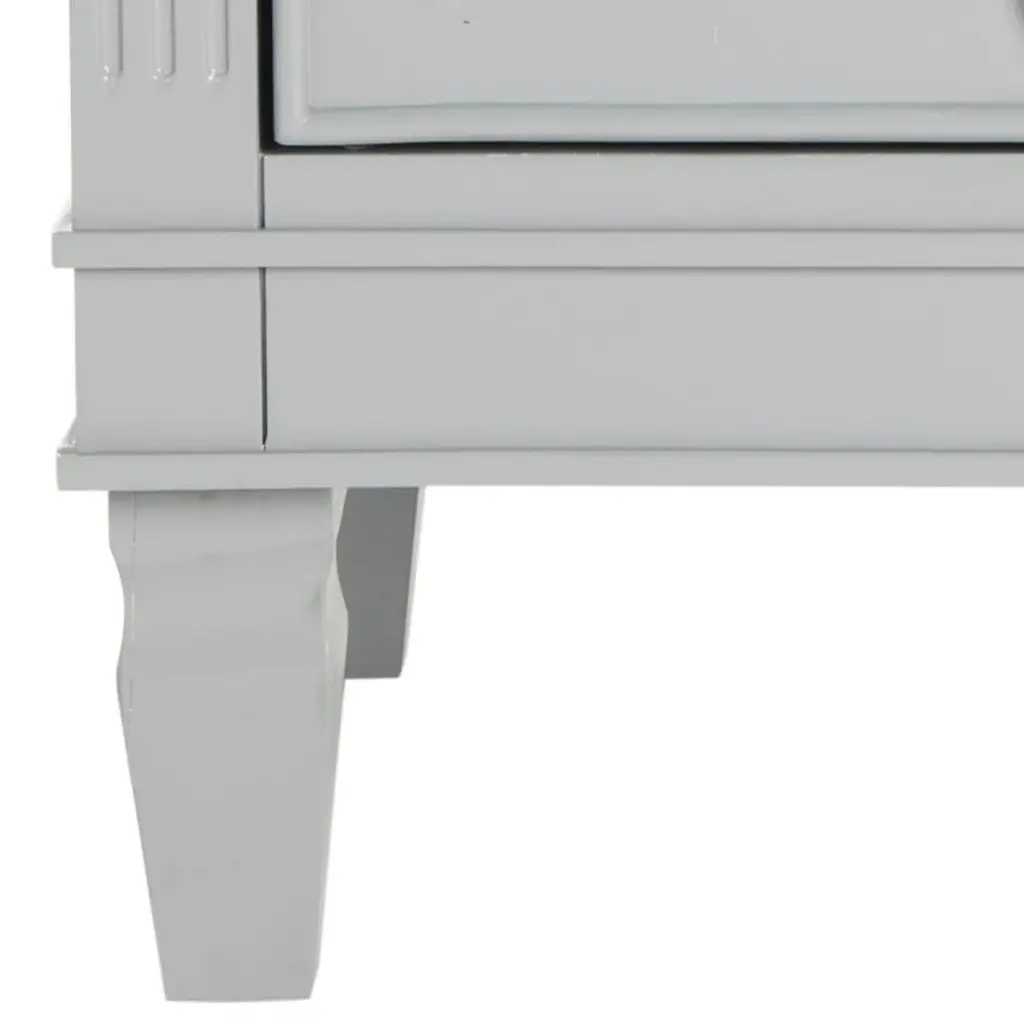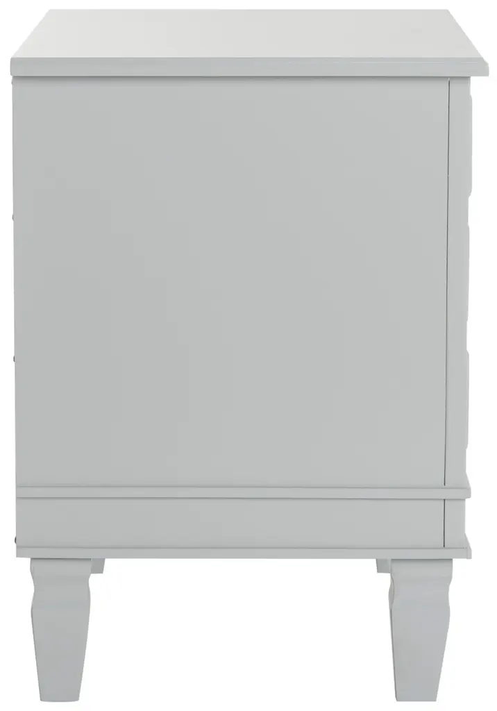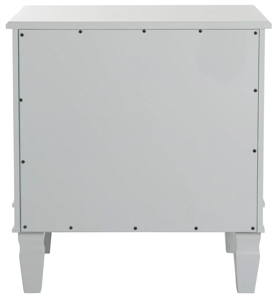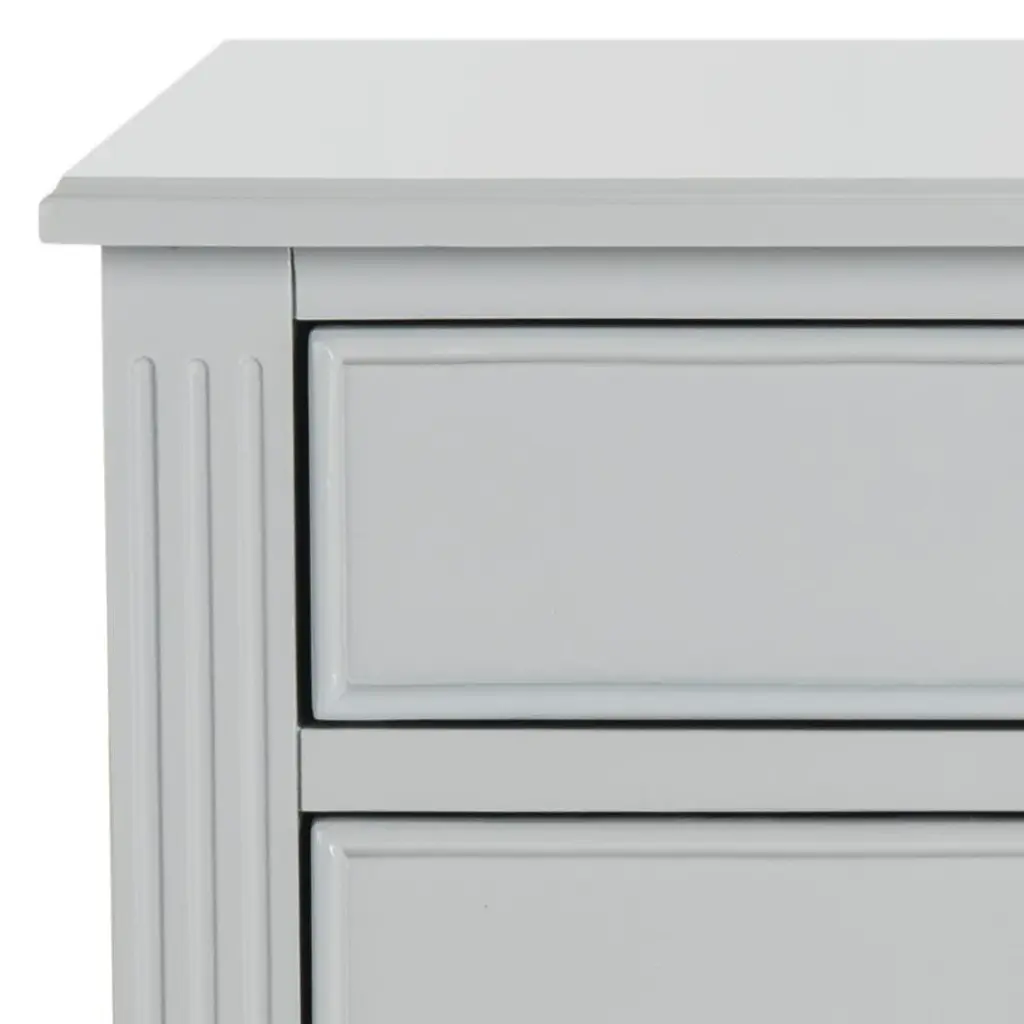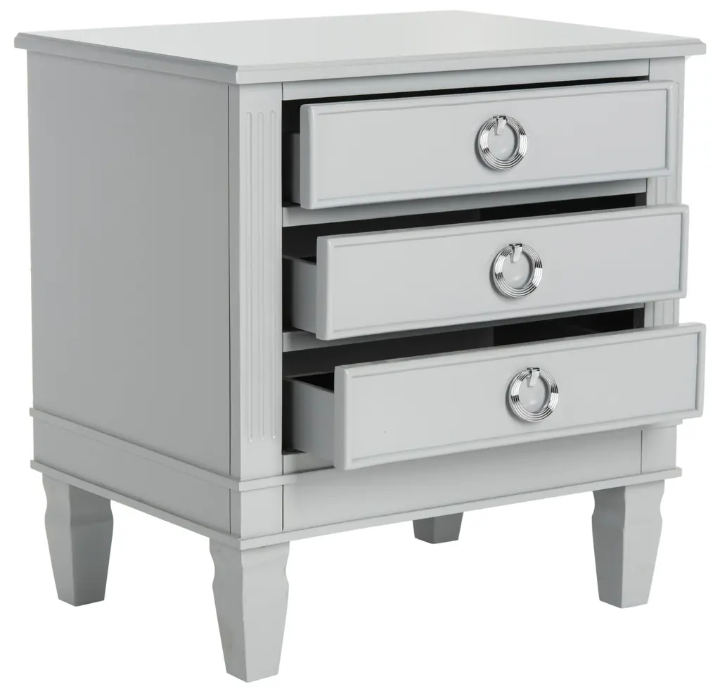 Bring the charm of the legendary Paris’ brocantes to any space with this classic nightstand. Crafted with French style wood details and chic silver pulls on it's ample three drawers, it's quintessential grey hue makes a graceful statement in any boudoir. Dust regularly with a soft, dry cloth. Never use oiled or treated cloths on lacquered finishes. Some finishes can be wiped with a damp (not wet) cloth, followed at once by rubbing with a dry cloth to remove fingerprints and smudges. For persistent spots, gently clean with a soft cloth and a solution of water and mild soap, make sure to wipe dry. Use adhesive felt pads, coasters and placemats to protect your furniture. Some assembly required.