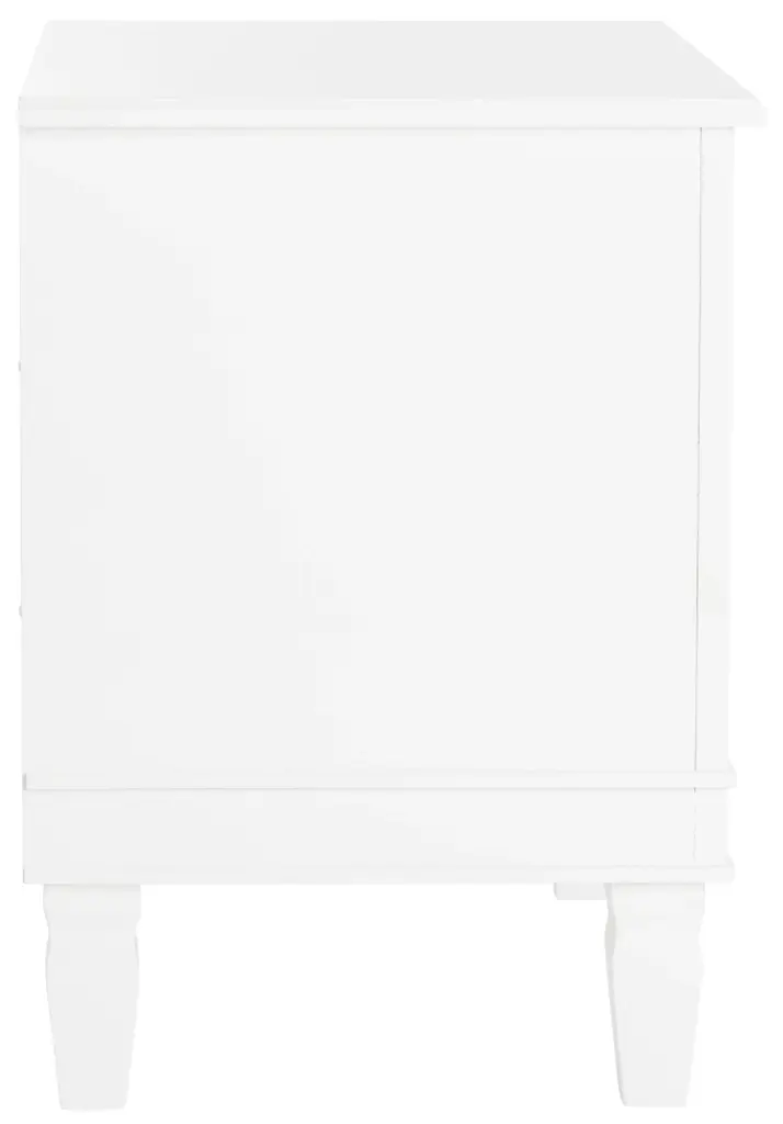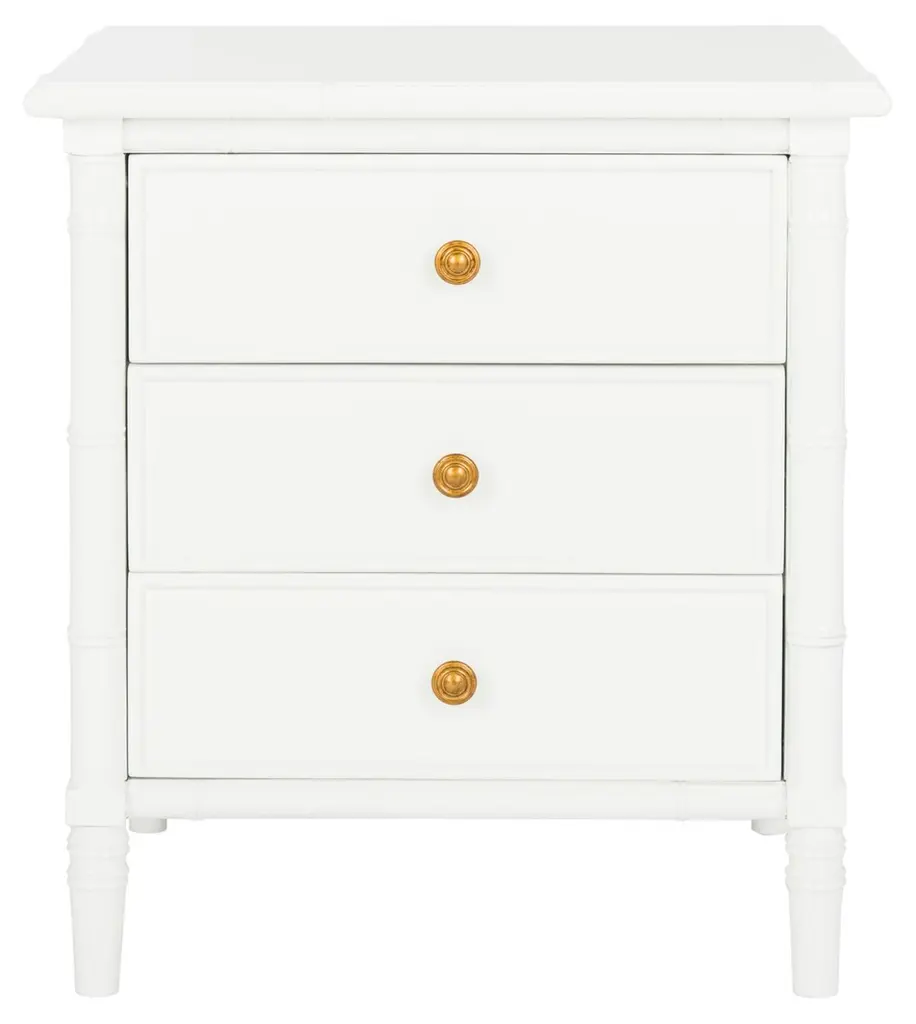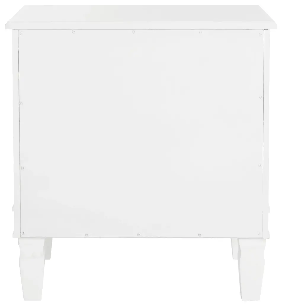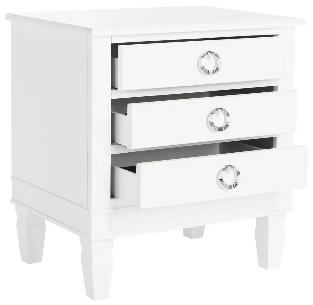 Bring the charm of the legendary Paris’ brocantes to any space with this classic nightstand. Crafted with French style wood details and chic silver pulls on it's ample three drawers, it's quintessential white hue makes a graceful statement in any boudoir. Dust regularly with a soft, dry cloth. Never use oiled or treated cloths on lacquered finishes. Some finishes can be wiped with a damp (not wet) cloth, followed at once by rubbing with a dry cloth to remove fingerprints and smudges. For persistent spots, gently clean with a soft cloth and a solution of water and mild soap, make sure to wipe dry. Use adhesive felt pads, coasters and placemats to protect your furniture. Some assembly required.