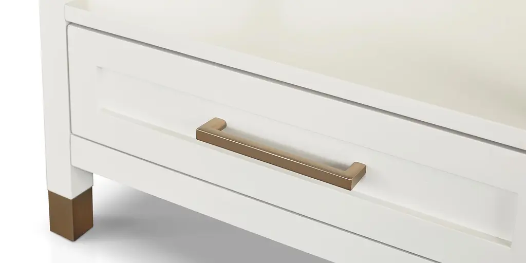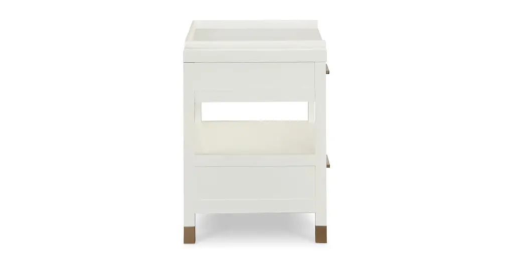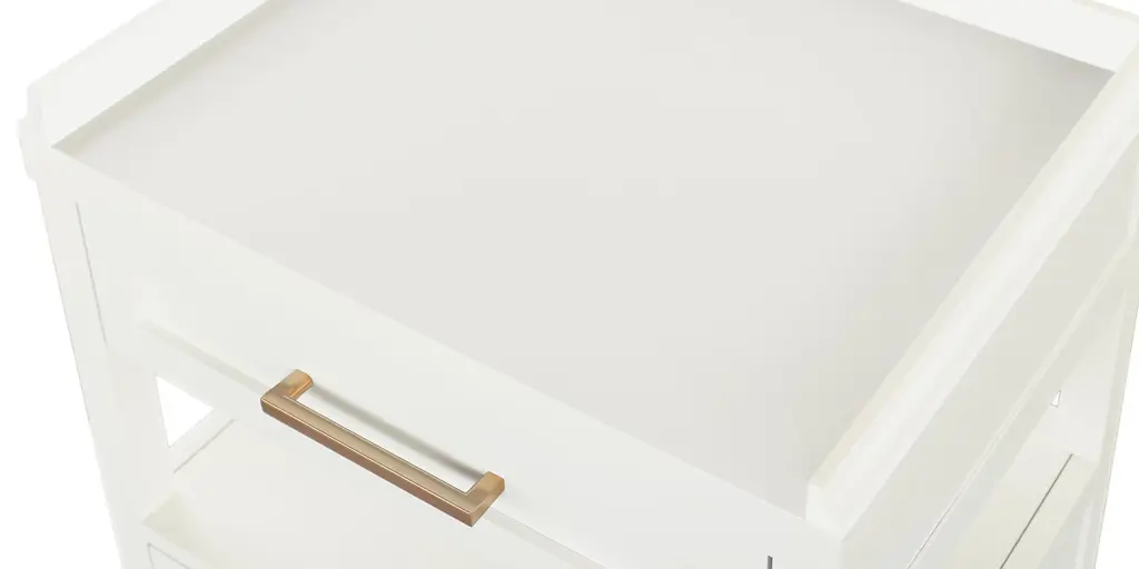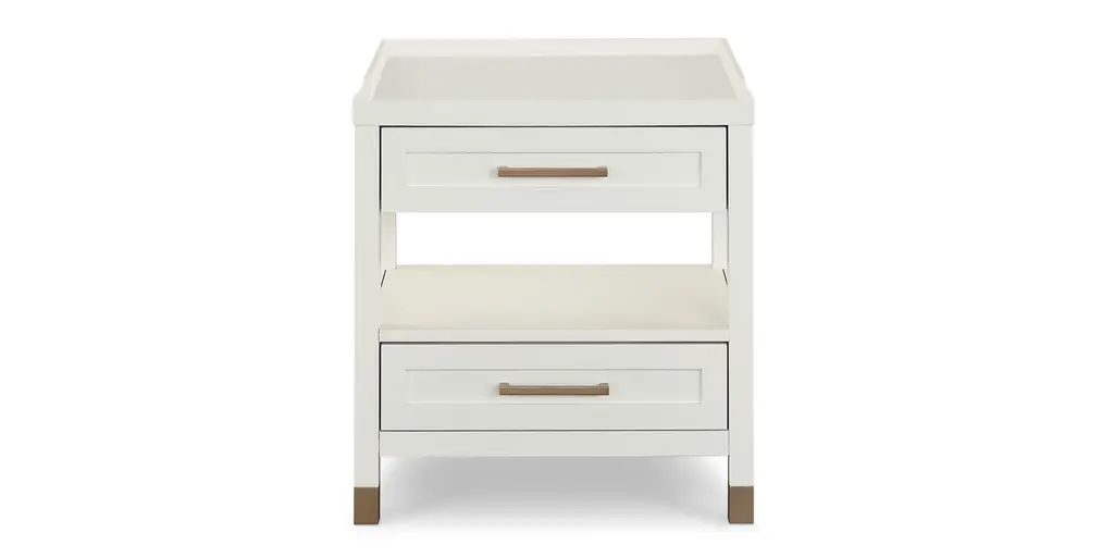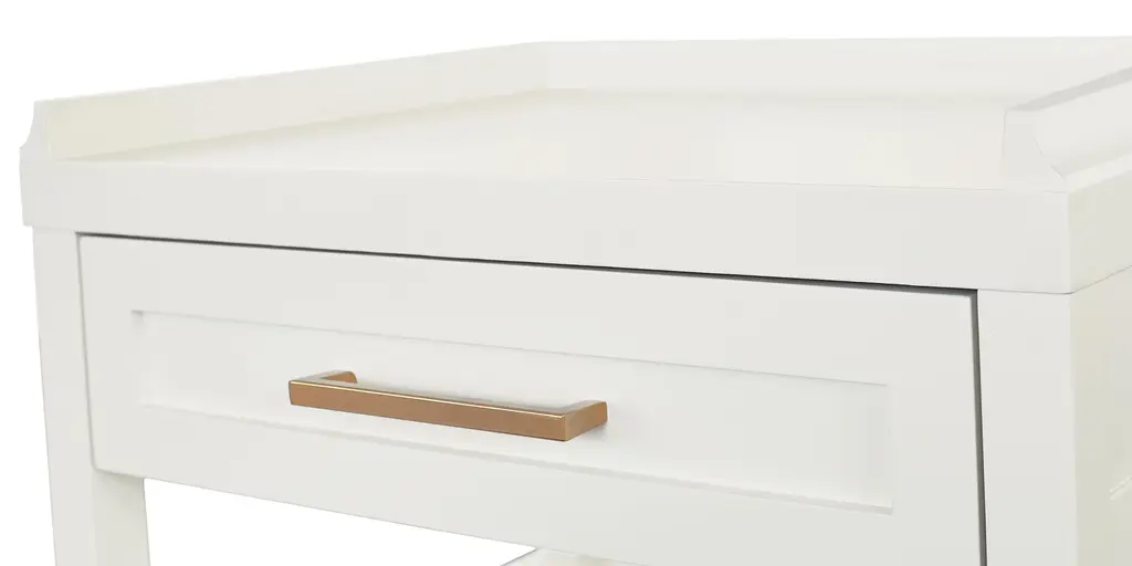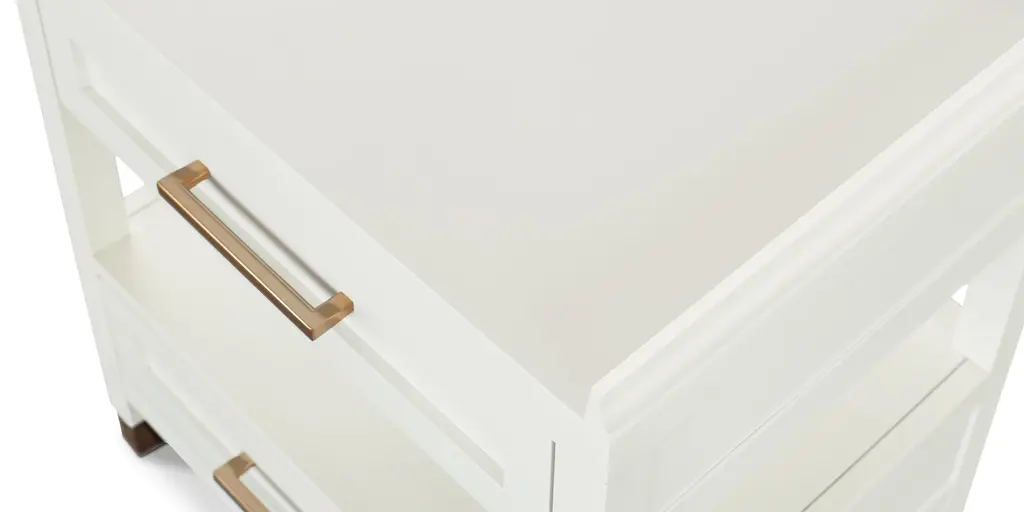 Details matter, and the details are what give the Tidewater Bedside Table its unmistakable charm. Start with the smooth, opaque Hampton White finish that is both modern and timeless at once. Metal bar pulls and leg ferrules in a satin brass finish add a touch of class.The top of the table is bordered with a gallery rail, a traditional detail to keep books and decor from sliding off, while the finished shelf below offers additional open storage and display space. Each of the two drawers shows the craftsmanship of English dovetail joinery, with a soft close drawer guide system mounted under the drawer. A built-in power strip gives a nod to modern convenience with 2 USB ports and electrical outlets.With its 24-inch width, this Bedside Table fits perfectly alongside the bed, just as comfortable in an elegant boudoir as it is in a coastal getaway.