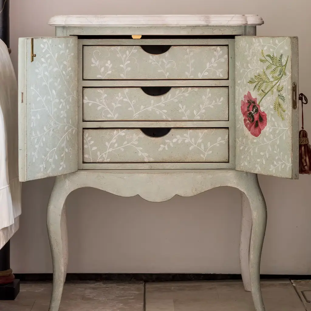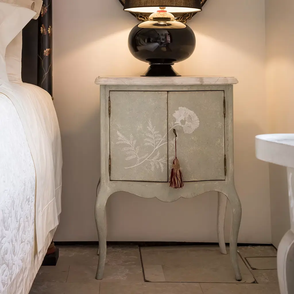 This classic, Venetian-style nightstand offers an eye-catching appeal for a master bedroom among traditional furnishing. It is also possible to request size, color, and decoration variations. On request, extra protection can be applied to the top. Please, ask the Concierge for further details.
