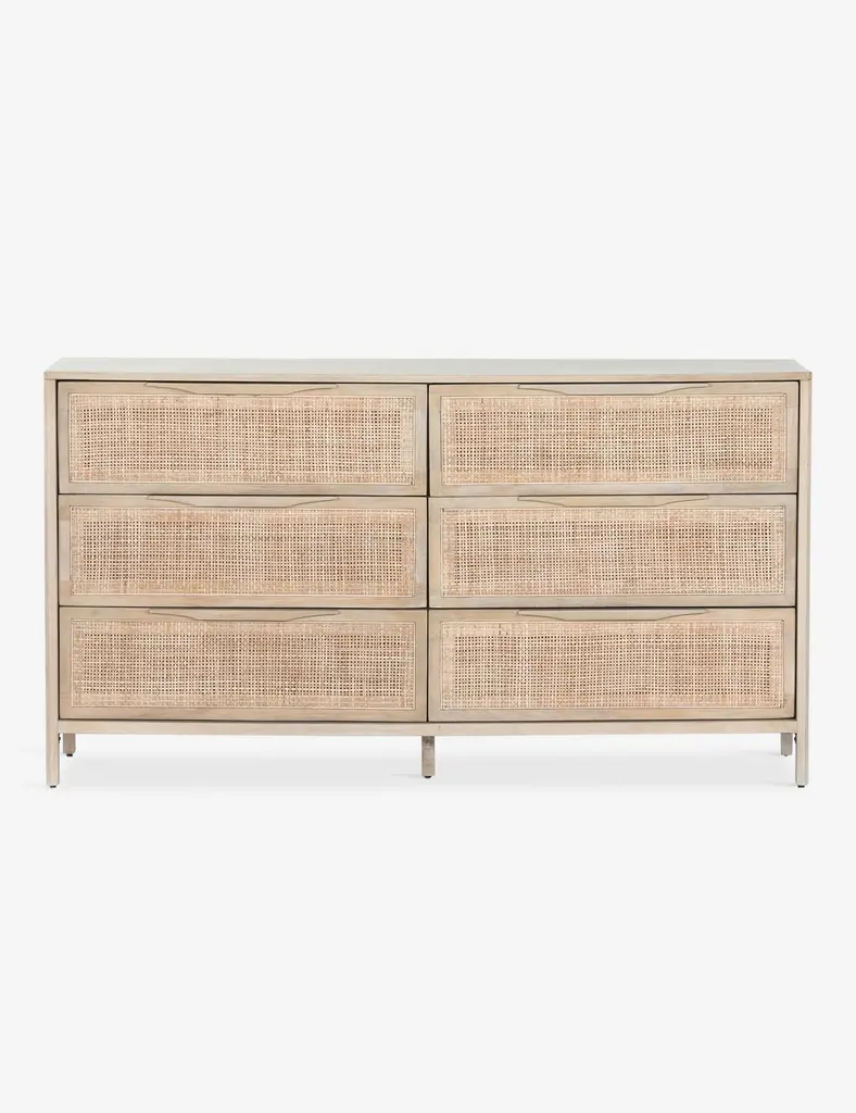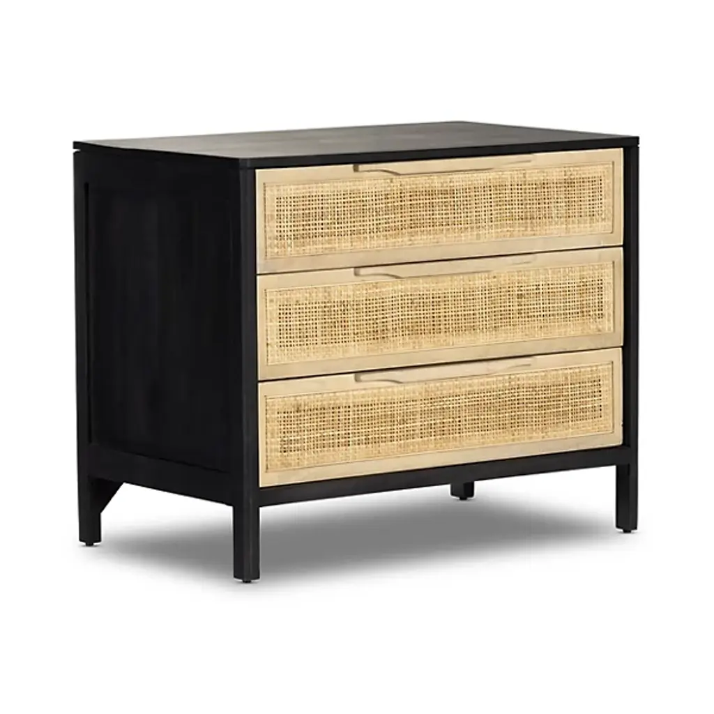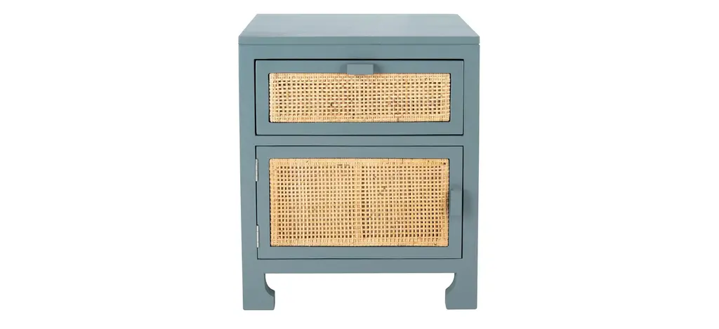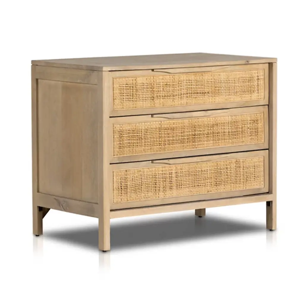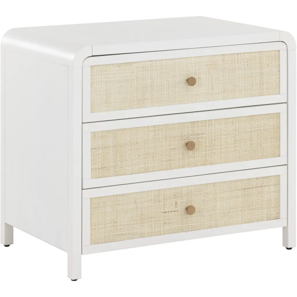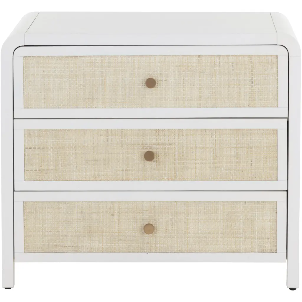 Boasting a stylish design with coastal influence, this beautiful nightstand features a clean-cut silhouette. Features an antique white wood frame with natural rattan detailing on three spacious drawers. Completed with minted copper steel hardware. Handle With Care: This design has been crafted with rattan. This artisan-crafted material features intricate weaving that results in natural variations where no two pieces are alike. Colour and texture differences are to be expected and embraced with this natural material. Due to the weaving process used, the fibres in this material may display shorter or longer lengths where the weaving ends. Visit our Product Care page for more information on how to ensure the lasting beauty of this piece. As wood is an organic, porous material, these pieces will contain natural variation of texture and may also exhibit fine indentations and cracks. Wood pieces will also display a disparity of colour and grain, and visible knots and burls that add to the character of each piece.