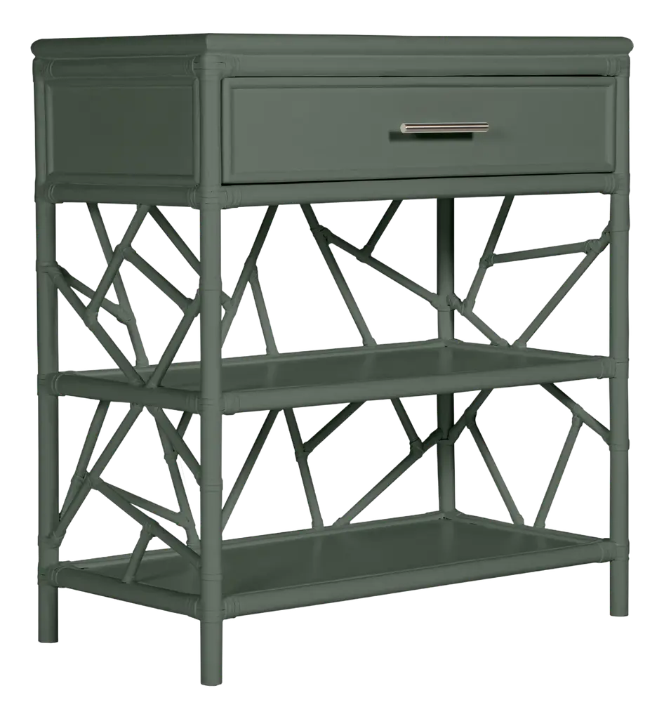 Whether you use it as a nightstand or a side table, this piece will command attention. The rattan detailing is applied by hand, and the table is painted by hand as well. Rawhide bindings and the sleek metal drawer pull add panache without distracting from the geometric design of the sides and back. Along with the drawer, the table has two wood shelves for added storage.