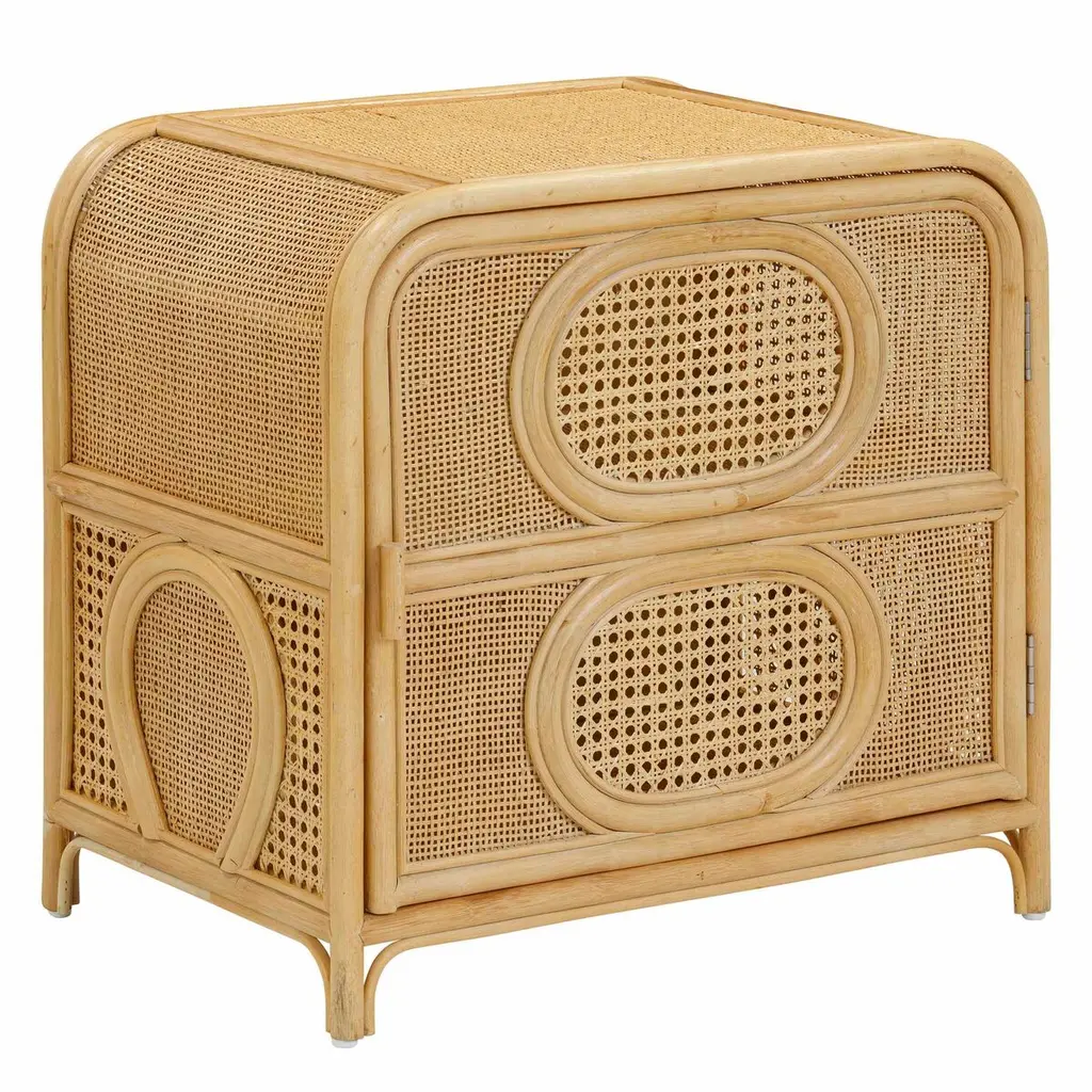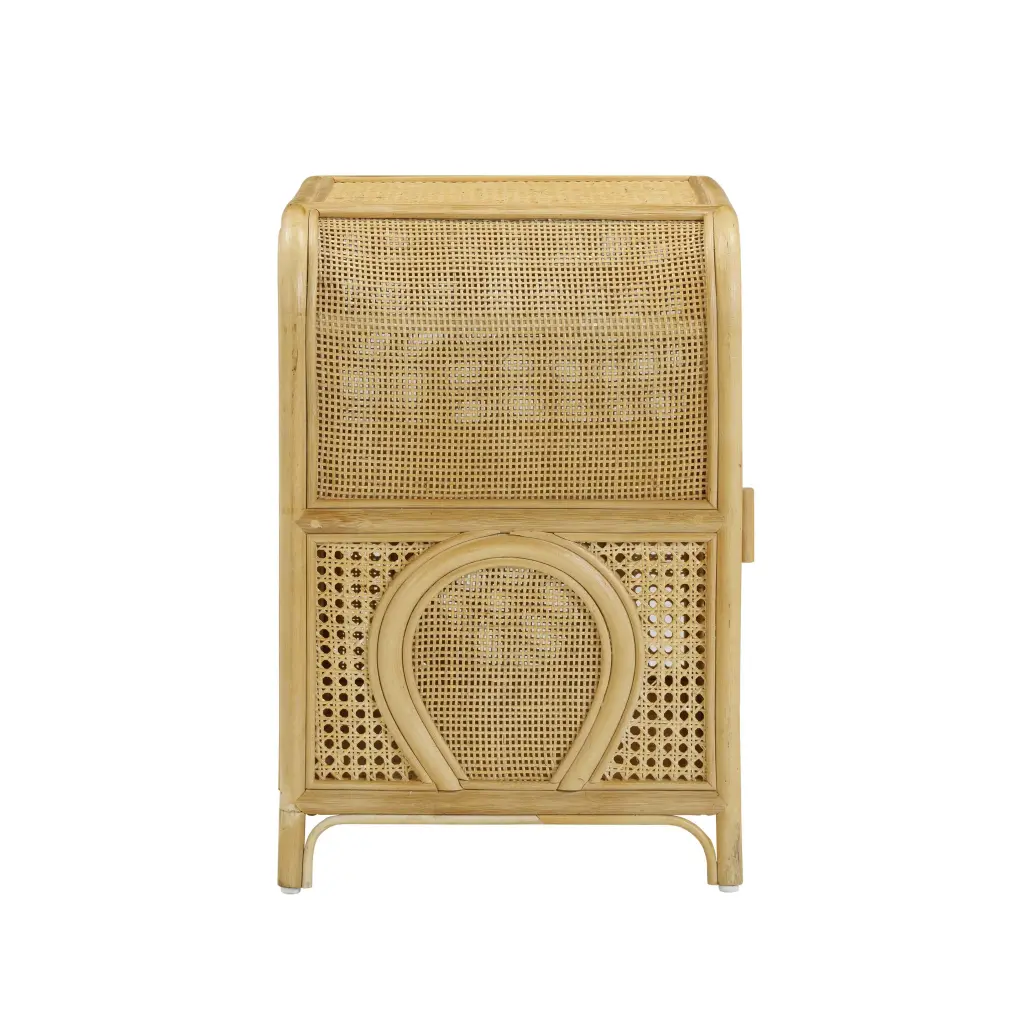 Introducing the Tina Rattan Nightstand, where the charm of natural raw rattan and cane combines to create the ultimate earthy, Boho vibe. Available in natural or black finishes, this piece features mixed styles of cane and a rounded, arched shape that's utterly trendy and perfect for adding a touch of organic style to your bedroom. Beyond its beauty, it boasts a magnetic-catch door revealing two spacious shelves inside, ideal for organizing your nighttime routine essentials with ease.