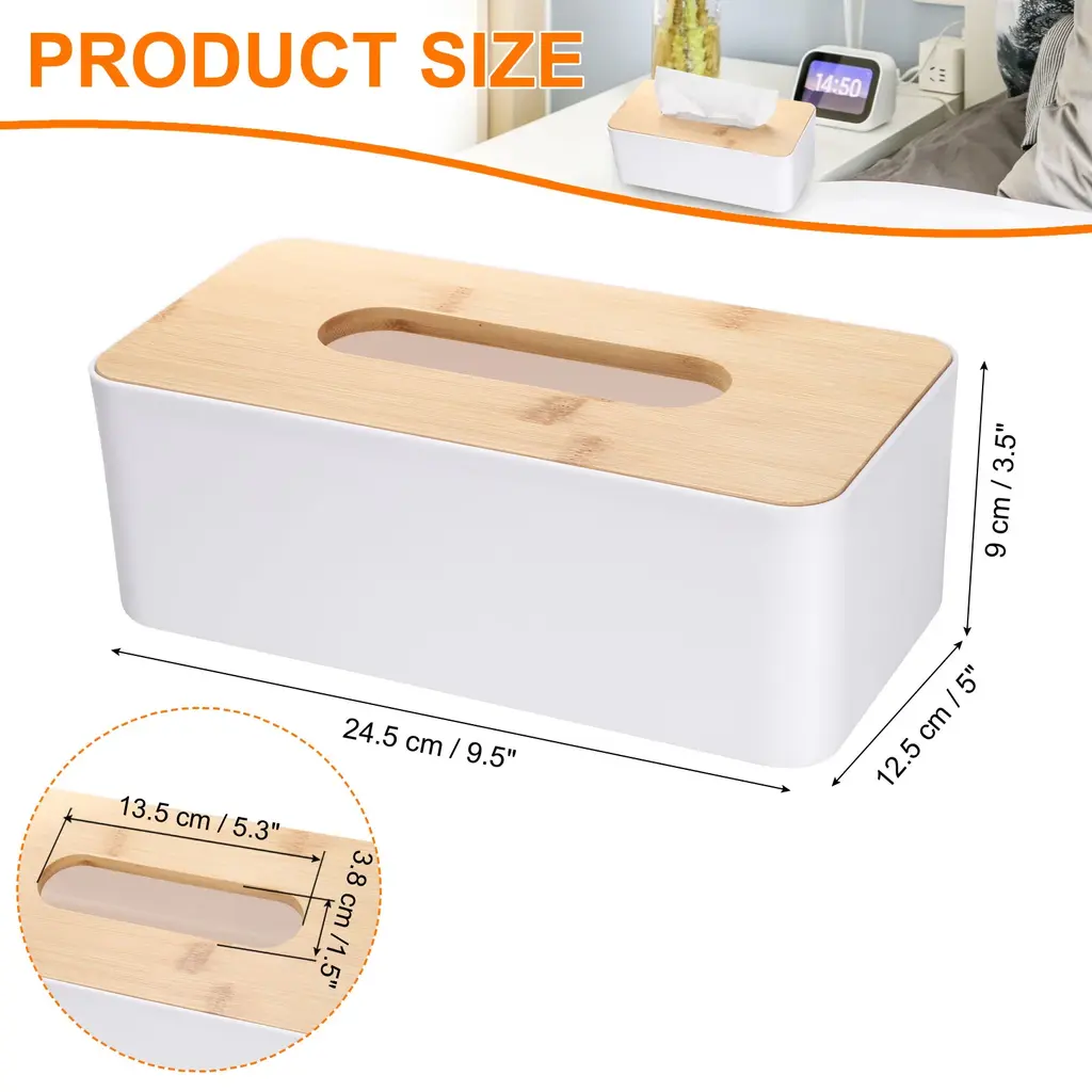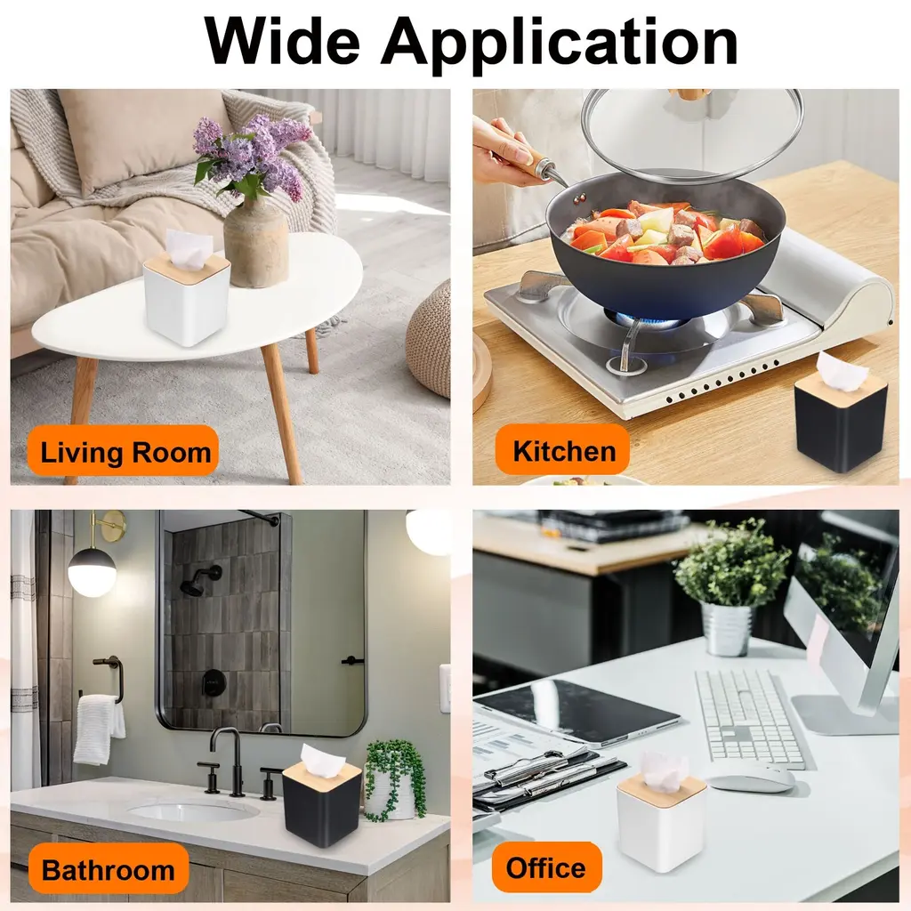 Description:Easy to Clean: The tissue box holder is made of PP and bamboo plate, sturdy, durable, and easy to clean with just a damp cloth, making your home or office more comfortable and beautifulRemovable Bamboo Lid: The tissue holder is designed in a sleek style with a removable bamboo lid to make it easier for you to take out the tissue, and it is easy to replace with a new one, against the tedious operationEasy to Use: Simply place the tissue inside the tissue box, ensuring that the opening is aligned with the dispenser slot for easy access to tissues, and attach the bamboo lidWide Application: This tissue holder box is a multipurpose tissue box that holds tissue, wipes, gloves, garbage bags, and more. This facial tissue holder is suitable for use in bathrooms, vanities, sinks, nightstands, and office tables, providing an aesthetic storage solutionNote: Manual measurement, please allow slight errors in size. The color may have a slight difference due to different screen displays.Specification:Material: PP, Bamboo PlateColor: BlackSize: 13 x 13 x 14 cm / 5.1 x 5.1 x 5.5 inch (L*W*H)Package Included: 1pcs x Tissue Box