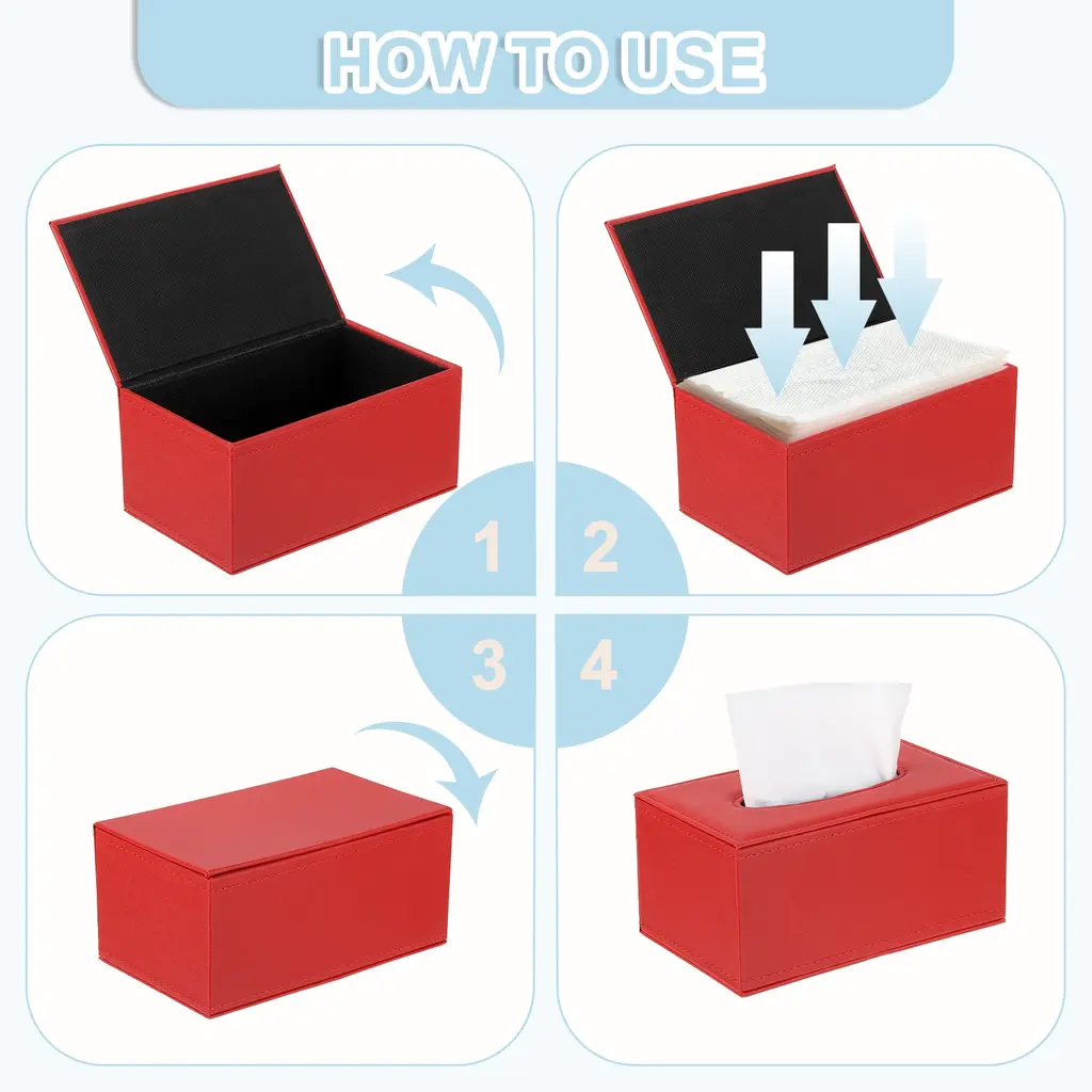 Description:Easy to Clean: The tissue box holder is made of acrylic, sturdy, durable, and easy to clean with just a damp cloth, making your home or office more comfortable and beautifulMagnetic Base: This finely crafted tissue box features a convenient magnetic closure at the bottom, allowing for easy opening. The magnetic closure ensures that napkins will not fall out when you move the box.Easy to Use: Simply place the tissue inside the tissue box, ensuring that the opening is aligned with the dispenser slot for easy access to tissues, and attach the baseWide Application: This tissue holder box is a multipurpose tissue box that holds tissue, wipes, gloves, garbage bags, and more. This facial tissue holder is suitable for use in bathrooms, vanities, sinks, nightstands, and office tables, providing an aesthetic storage solutionNote: Manual measurement, please allow slight errors in size. The color may have a slight difference due to different screen displays.Specification:Material: PU LeatherSize: 20 x 12 x 9.5cm/7.9 x 4.7 x 3.7 inches (L*W*H)Open Mouth Size: 11.6cm/4.6inchPackage Included: 1 pc x Tissue Box