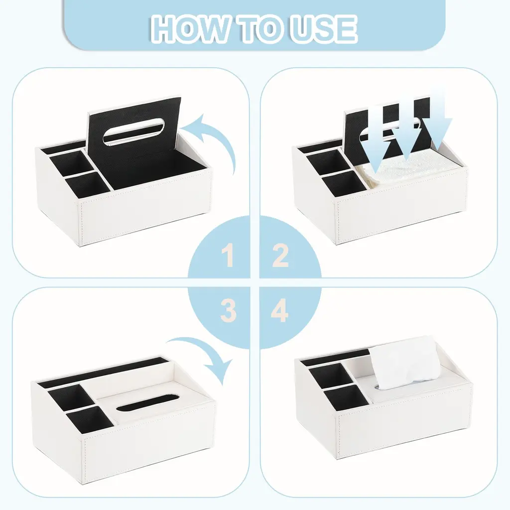 Description:Easy to Clean: The tissue box holder is made of acrylic, sturdy, durable, and easy to clean with just a damp cloth, making your home or office more comfortable and beautifulMagnetic Base: This finely crafted tissue box features a convenient magnetic closure at the bottom, allowing for easy opening. The magnetic closure ensures that napkins will not fall out when you move the box.Easy to Use: Simply place the tissue inside the tissue box, ensuring that the opening is aligned with the dispenser slot for easy access to tissues, and attach the baseWide Application: This tissue holder box is a multipurpose tissue box that holds tissue, wipes, gloves, garbage bags, and more. This facial tissue holder is suitable for use in bathrooms, vanities, sinks, nightstands, and office tables, providing an aesthetic storage solutionNote: Manual measurement, please allow slight errors in size. The color may have a slight difference due to different screen displays.Specification:Material: PU LeatherSize: 26.5 x 16.5 x 12cm/10.4 x 6.5 x 4.7 inches (L*W*H)Open Mouth Size: 12.2cm/4.8inchPackage Included: 1 pc x Tissue Box
