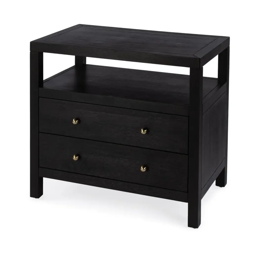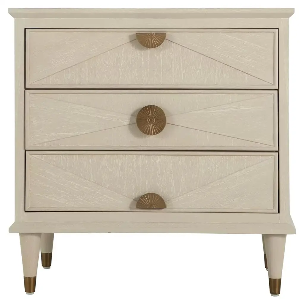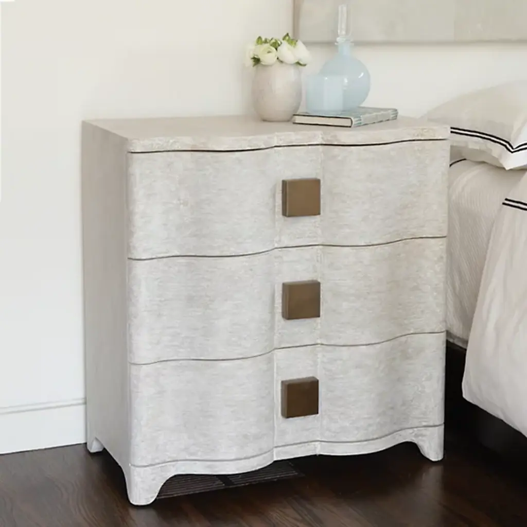 A simple, flowing gesture makes a stunning addition to a bedroom. The Toile Bedside Chest by Global Views enhances spaces through its unique aesthetic and everyday functionality. Crafted from solid oak and hand-wrapped in fine Belgian linen, this bedside credenza features a graceful shape with three spacious drawers curving into an elegant wave. Square brass hardware contrasts sharply against the softness of the piece, adding a modern intrigue while remaining simple enough to fit in seamlessly.