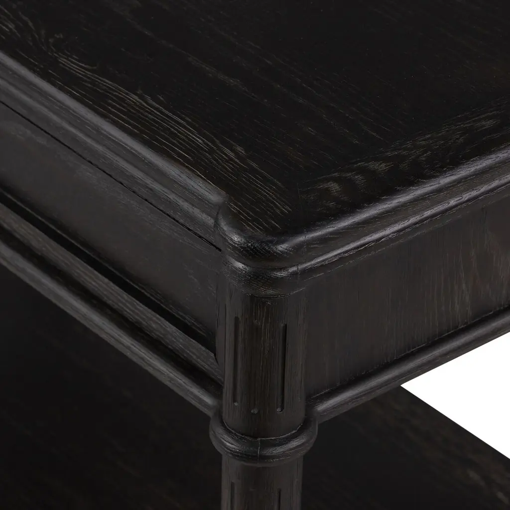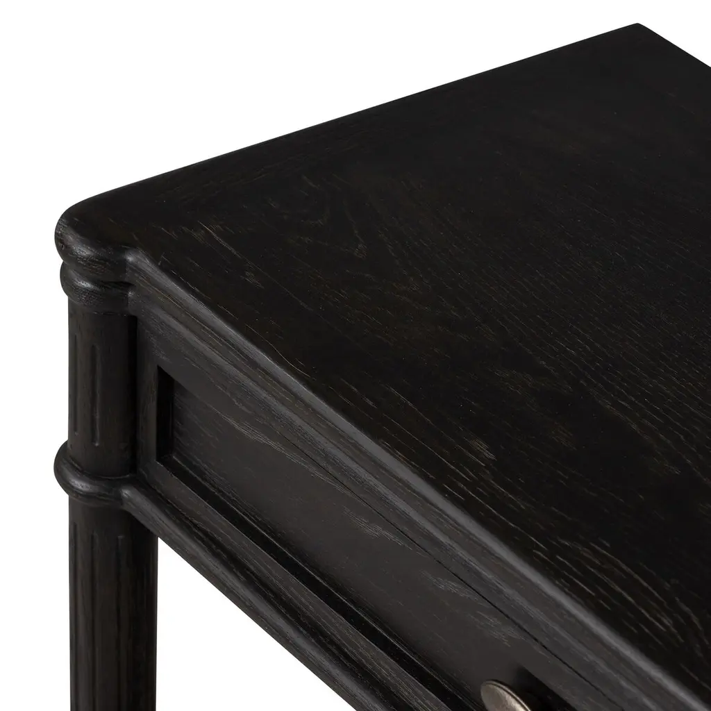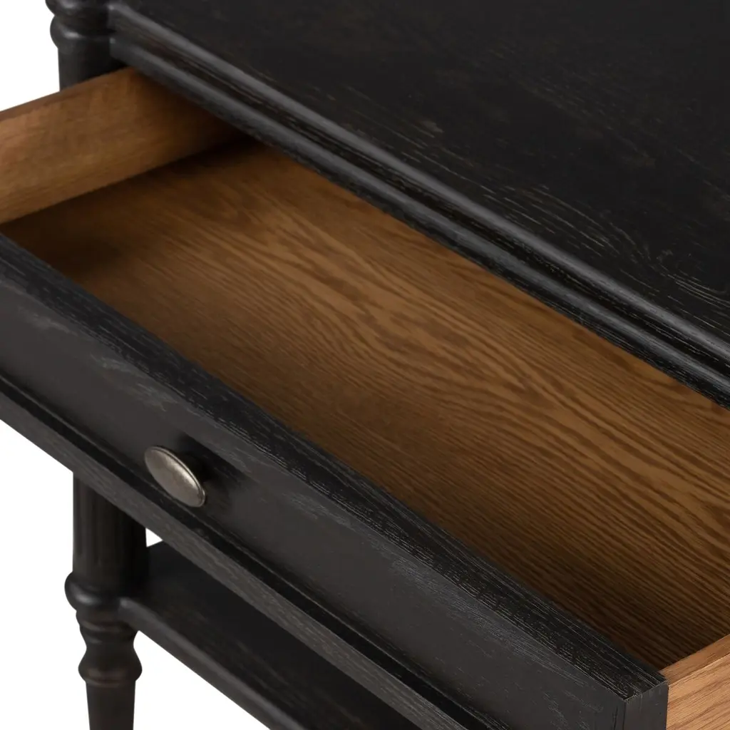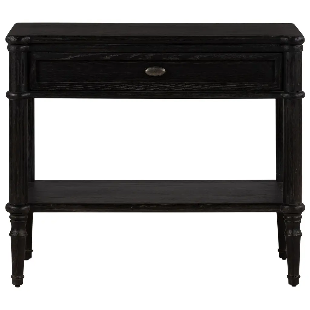 With its framed panels and tapered turned legs, this oak nightstand is rich in refined details. Below the drawer is an open shelf for additional storage or display space.