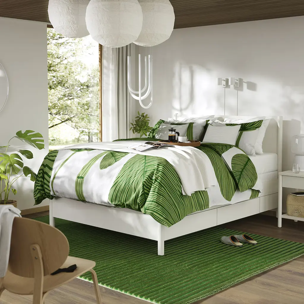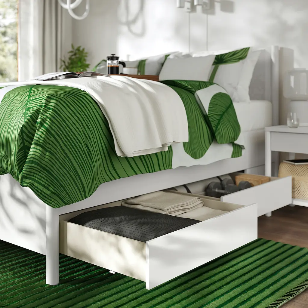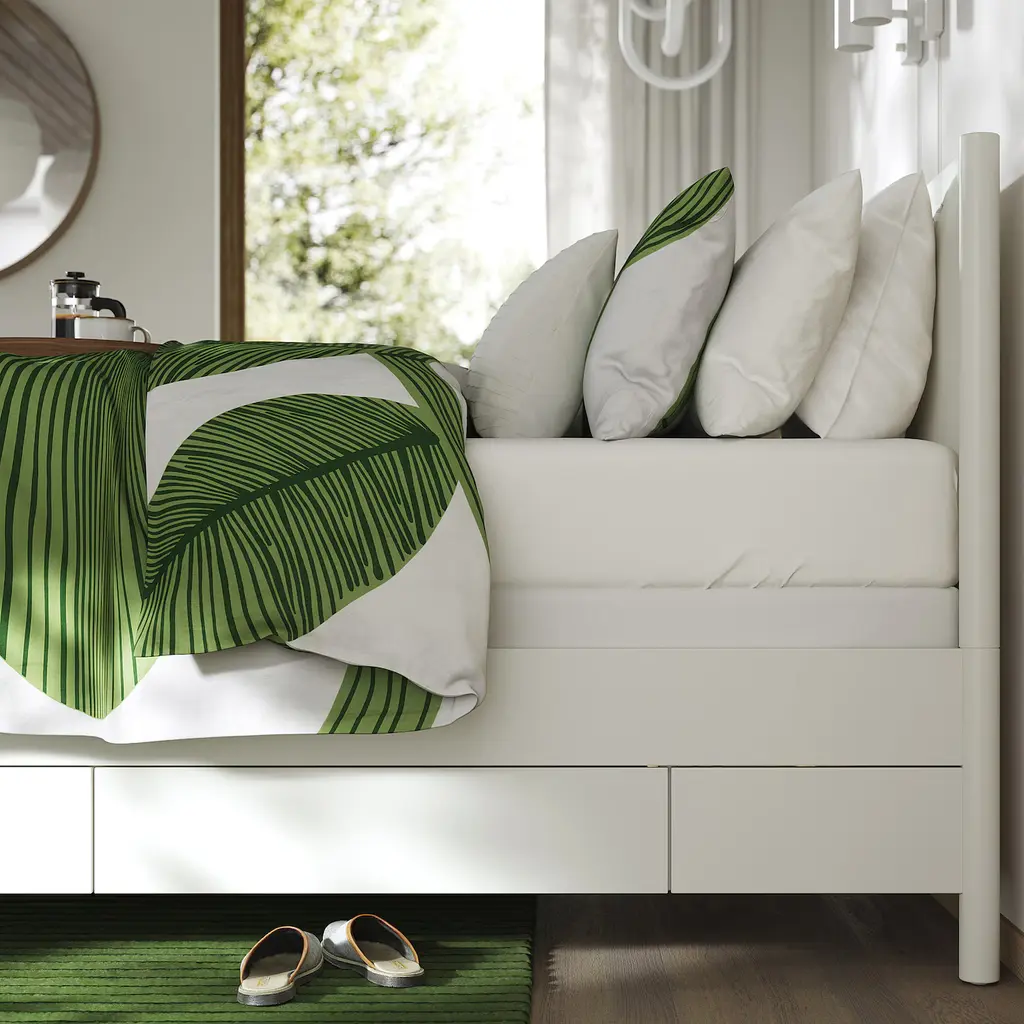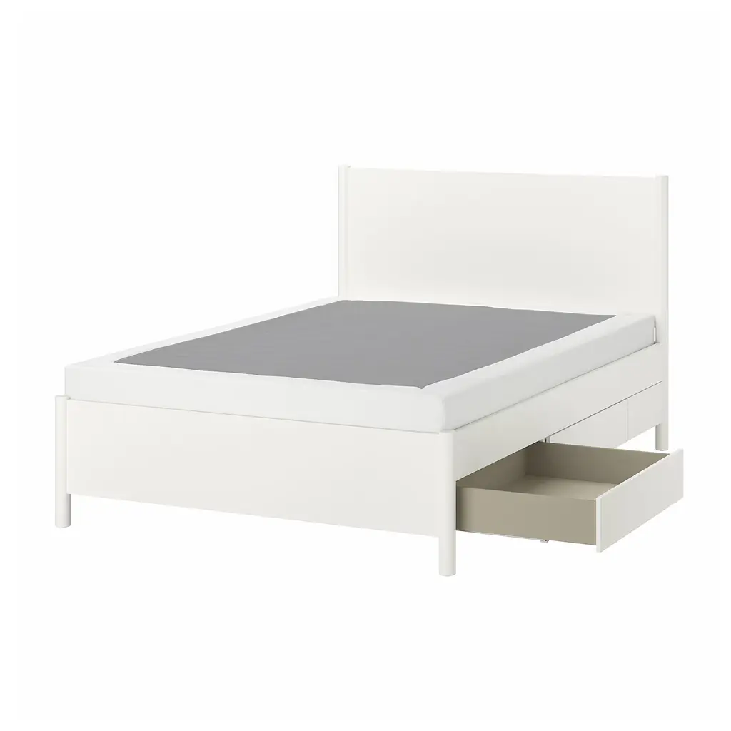 TONSTAD Bed frame with storage - off-white/Lyngör white Queen. The bed has a strong and sturdy construction that allows you to use it for many years. The design of the bed frame with a dedicated space for a bedside table means the drawers are always easily accessible.