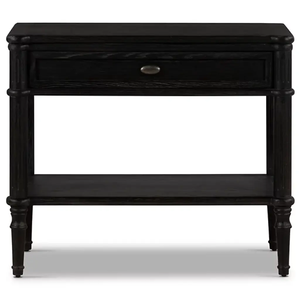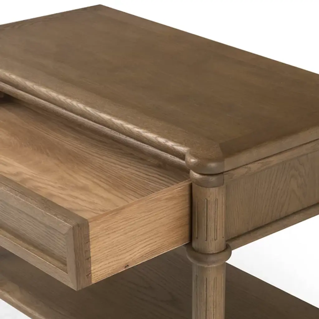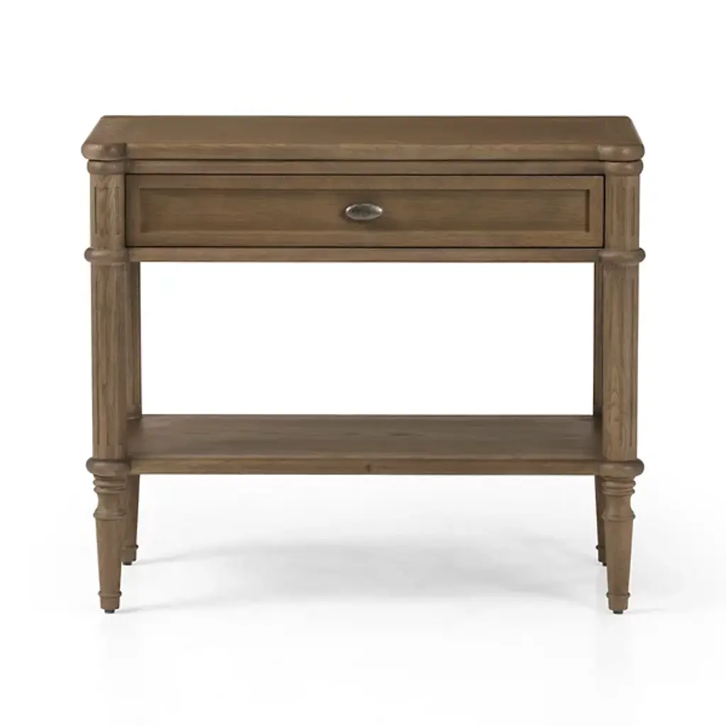Add an open, expressive character to spaces with the Toulouse Nightstand from Four Hands. Able to serve well at a bedside or next to a couch or chair in a living space, its four-legged columnar construction supports a lower shelf, extending contoured legs to a slim drawer with different textures highlighting an oval metal pull. The clean-surfaced wood veneer contrasts well with the antiqued metal pull, adding a rustic modern presence to its surroundings.