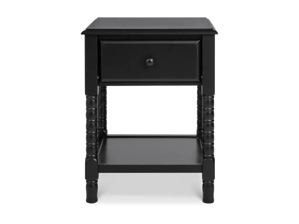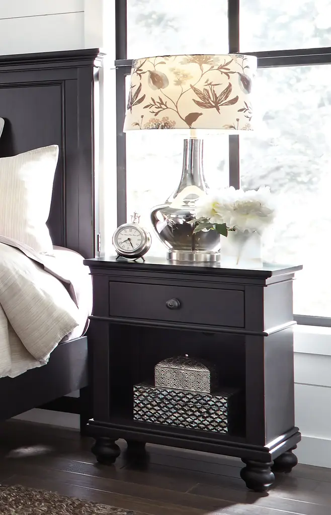 With a stunning appearance and a nod to traditional style, this 1-drawer nightstand offers the convenience of open and drawer storage. Featuring a felt-lined top drawer, you can safely store jewelry or other sensitive belongings with a confidence that they will remain in their beauty. The elegant black finish and gunmetal hardware put a sophisticated look to this piece. Use it as a nightstand, or even a statement piece in your living room!