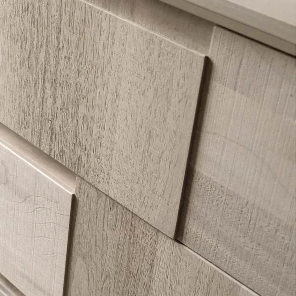 The M-619 chest of drawers and M-620 bedside table are the expressions of an innovative, original style, founded in the refined working of the drawers.The surface of this piece is characterised by lines, with alternating rectangular elements animating the wood.Bedside table in walnut veneer blockboard. Two drawers in sawn effect solid walnut.• Colour: Natural grey walnut• Finish: Oil