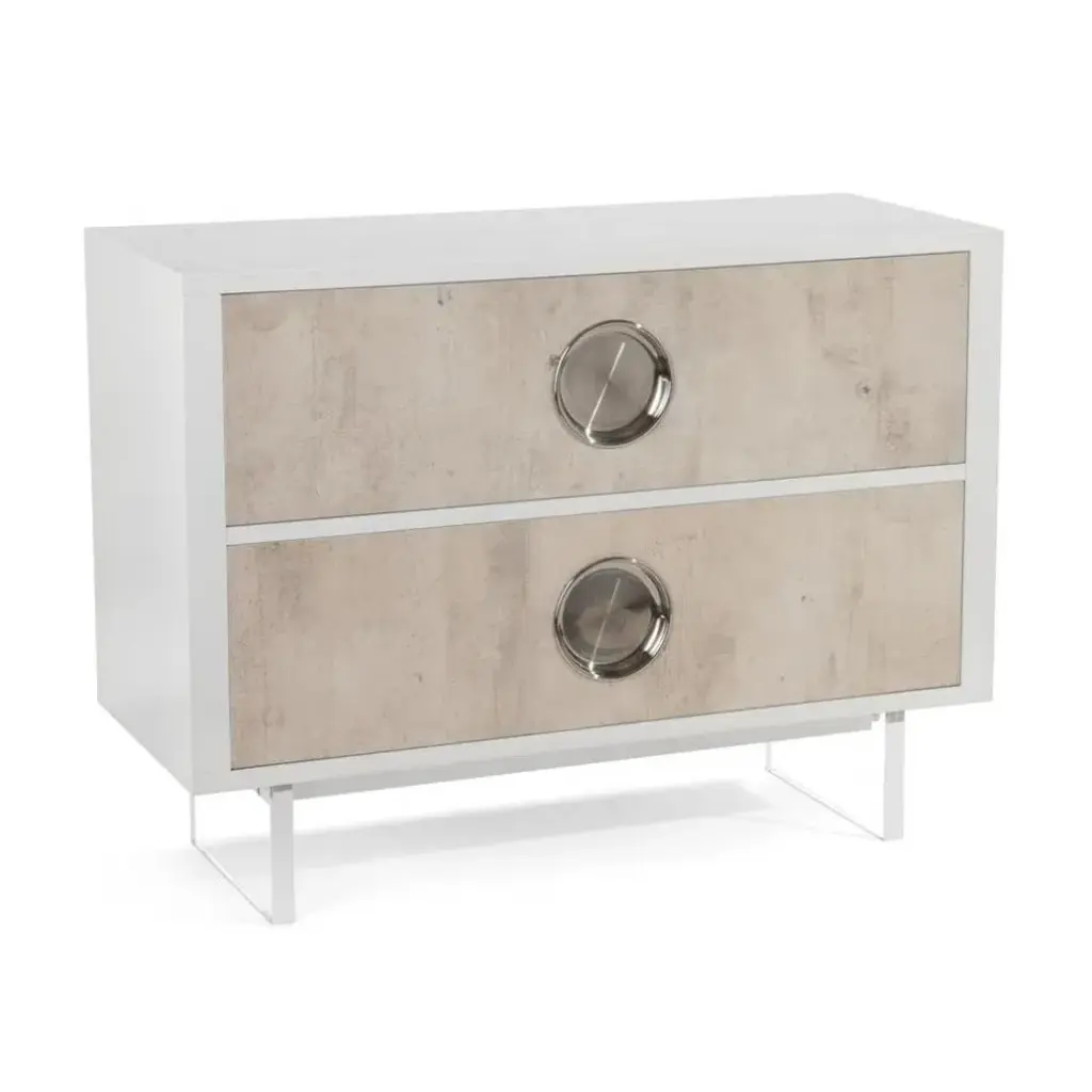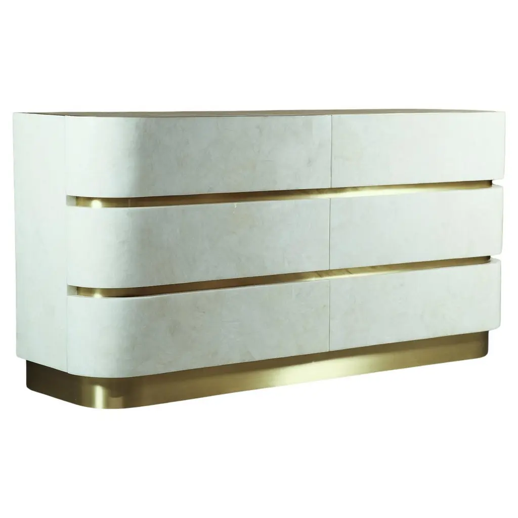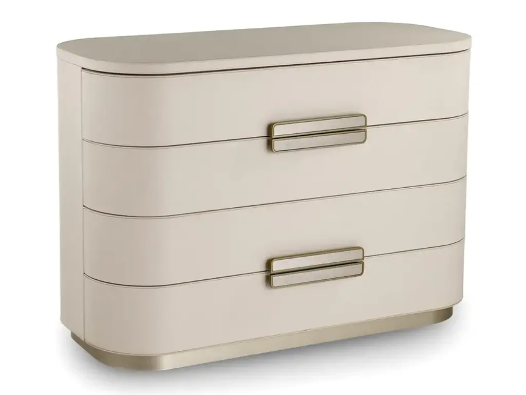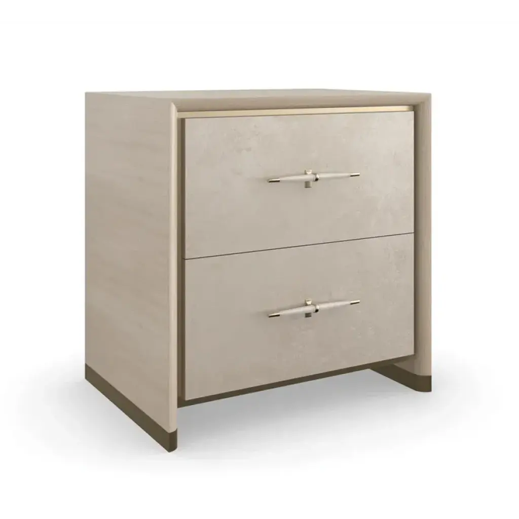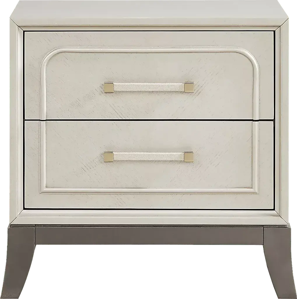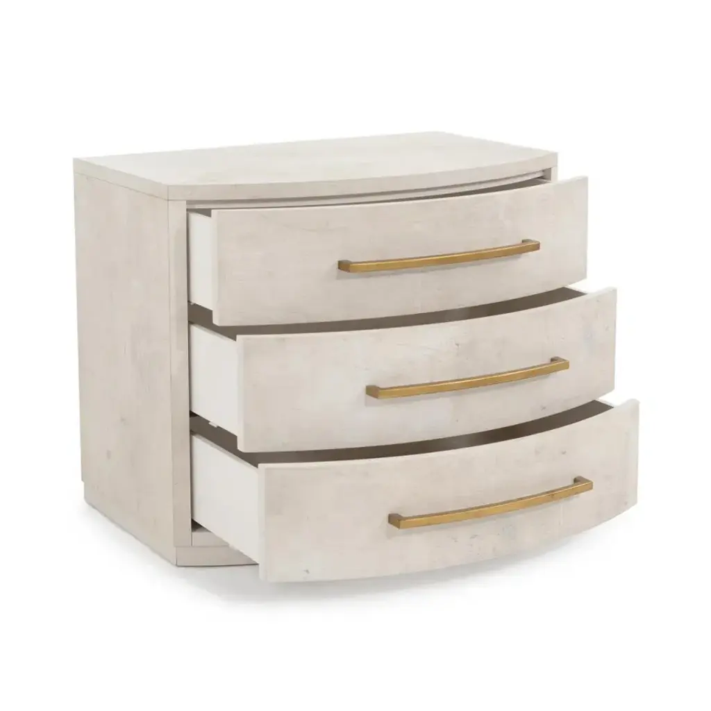 This three-drawer nightstand with an elegant, curved front is finished in tiza gesso. It features soft-closing drawers with elongated, curved handles in antique gold.