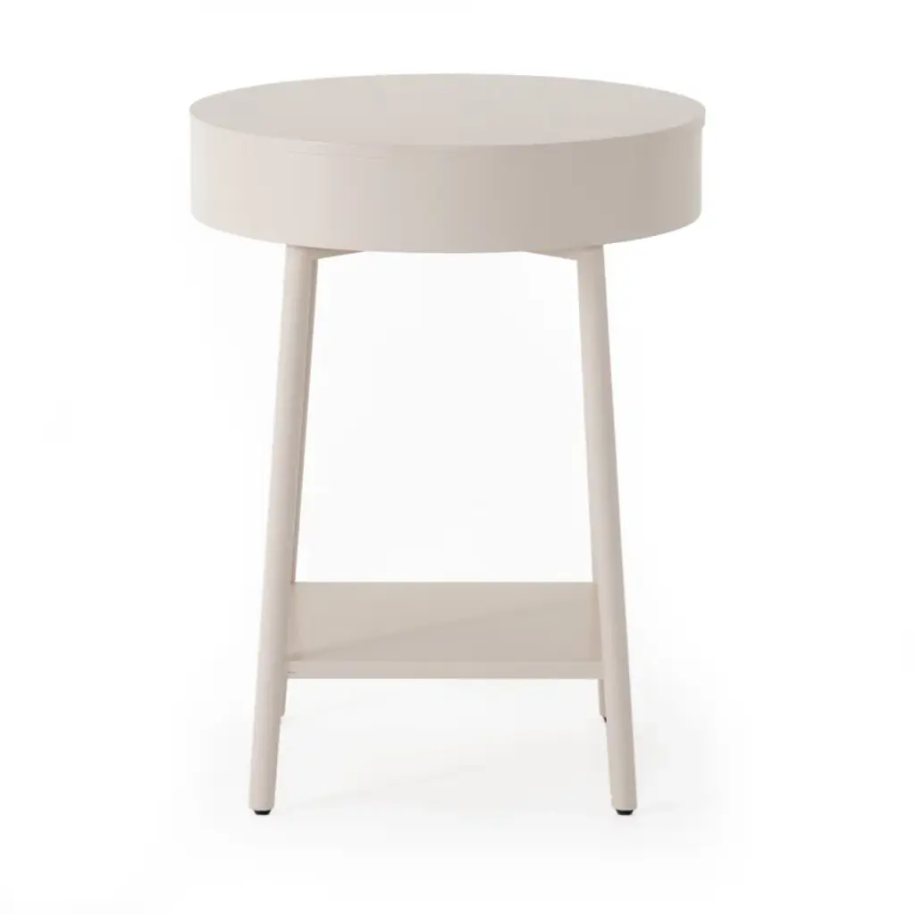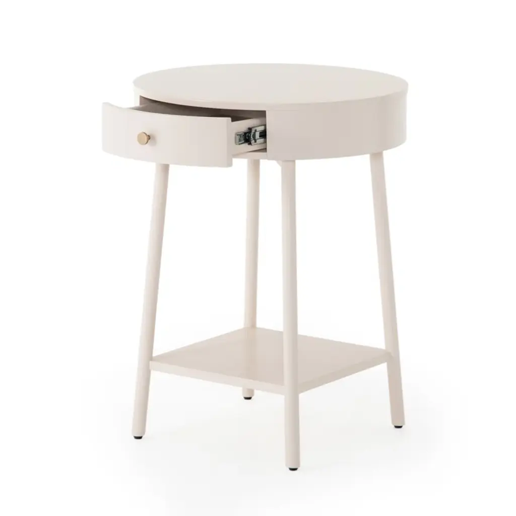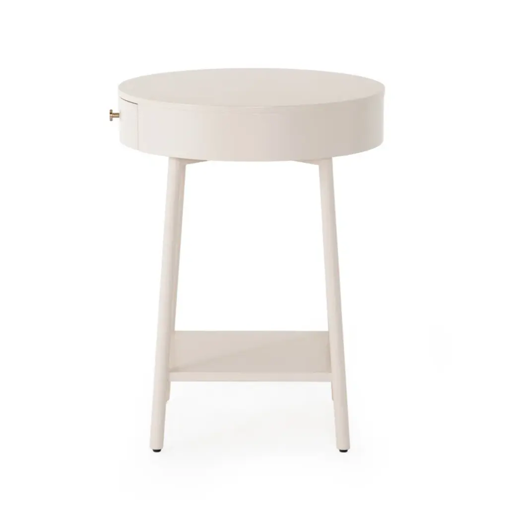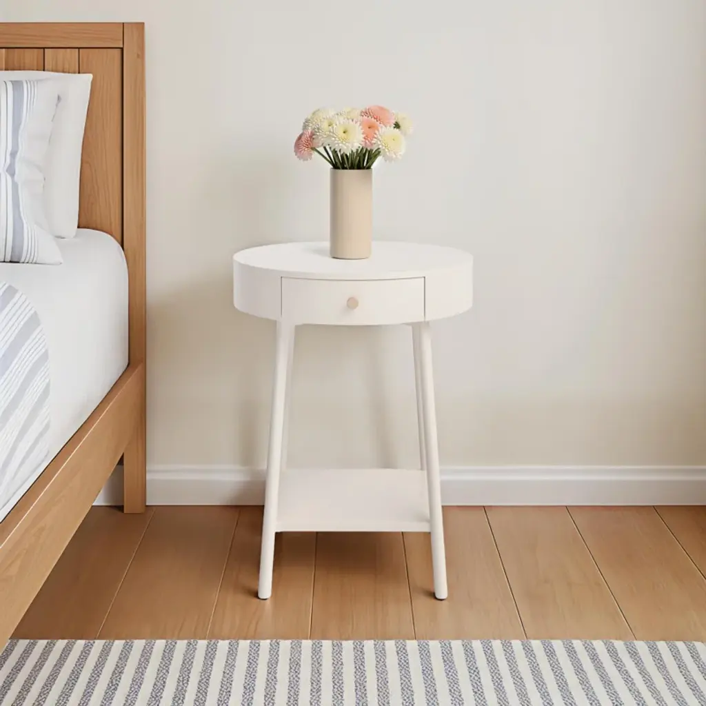 Finished in a dreamy off-white, an engineered hardwood nightstand features a single drawer and lower shelf, bringing both style and storage to the bedside.