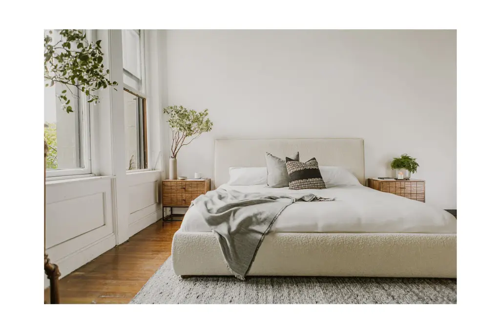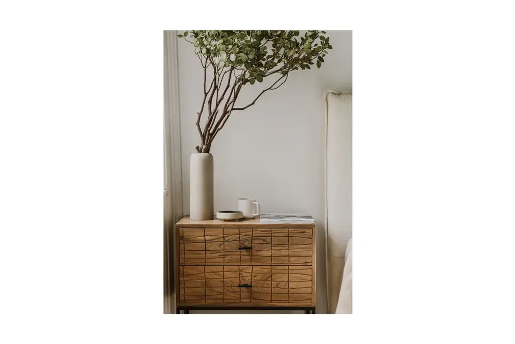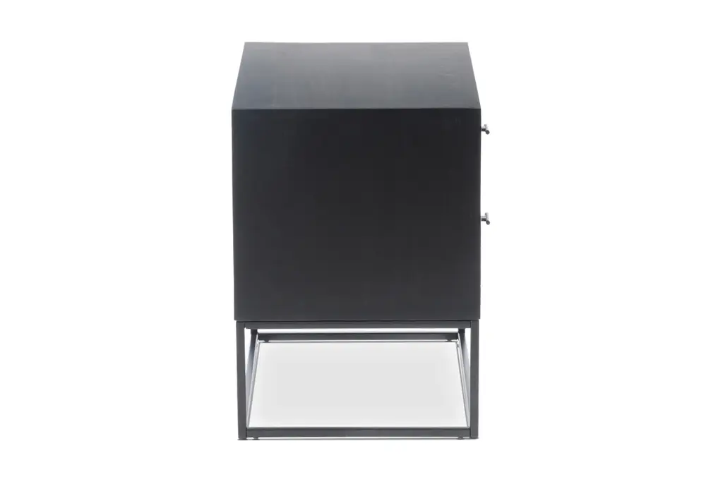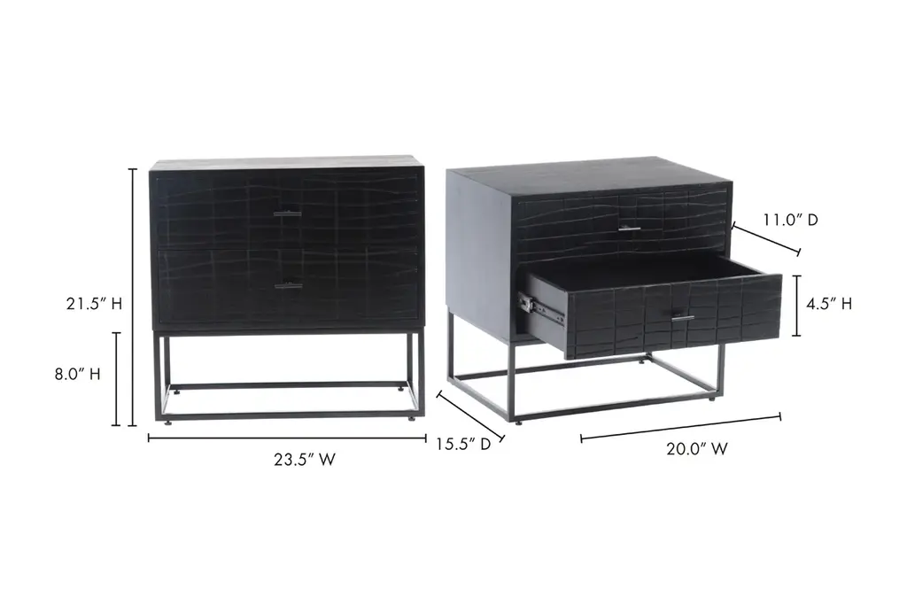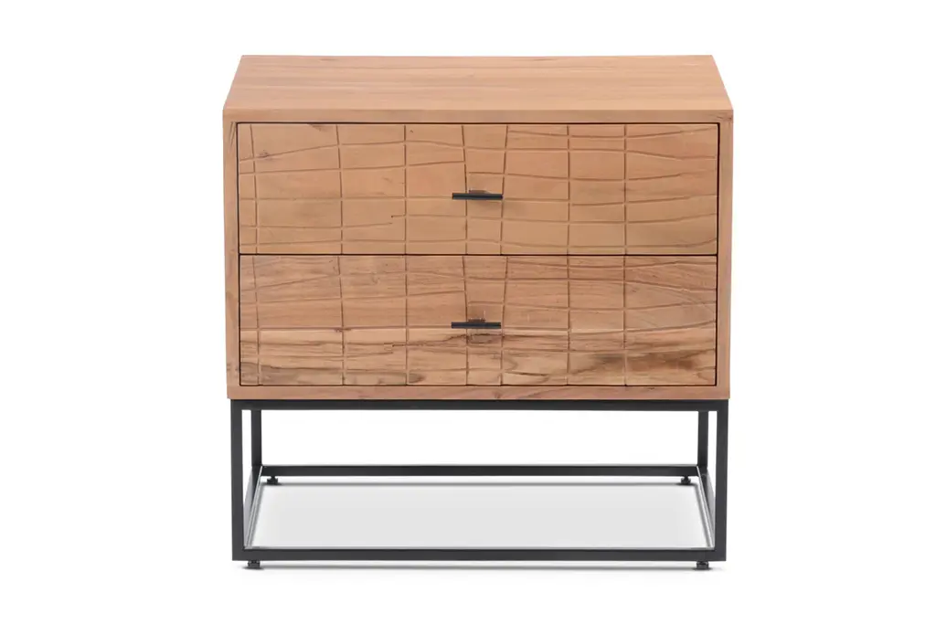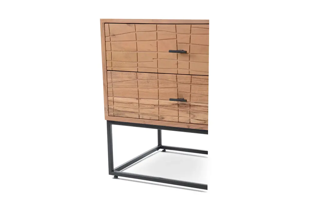 Elevate your bedroom with the Turano Nightstand. Crafted from solid acacia wood, it offers durable construction and a choice of natural or black finishes. The sleek black powder-coated metal base and unique textured front give this piece a modern, artistic flair. Two soft-close doors provide generous space for your possessions, with felt linings for a luxurious feel.