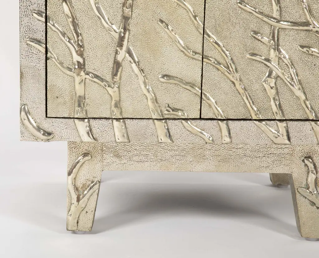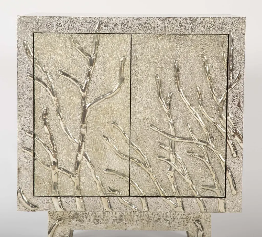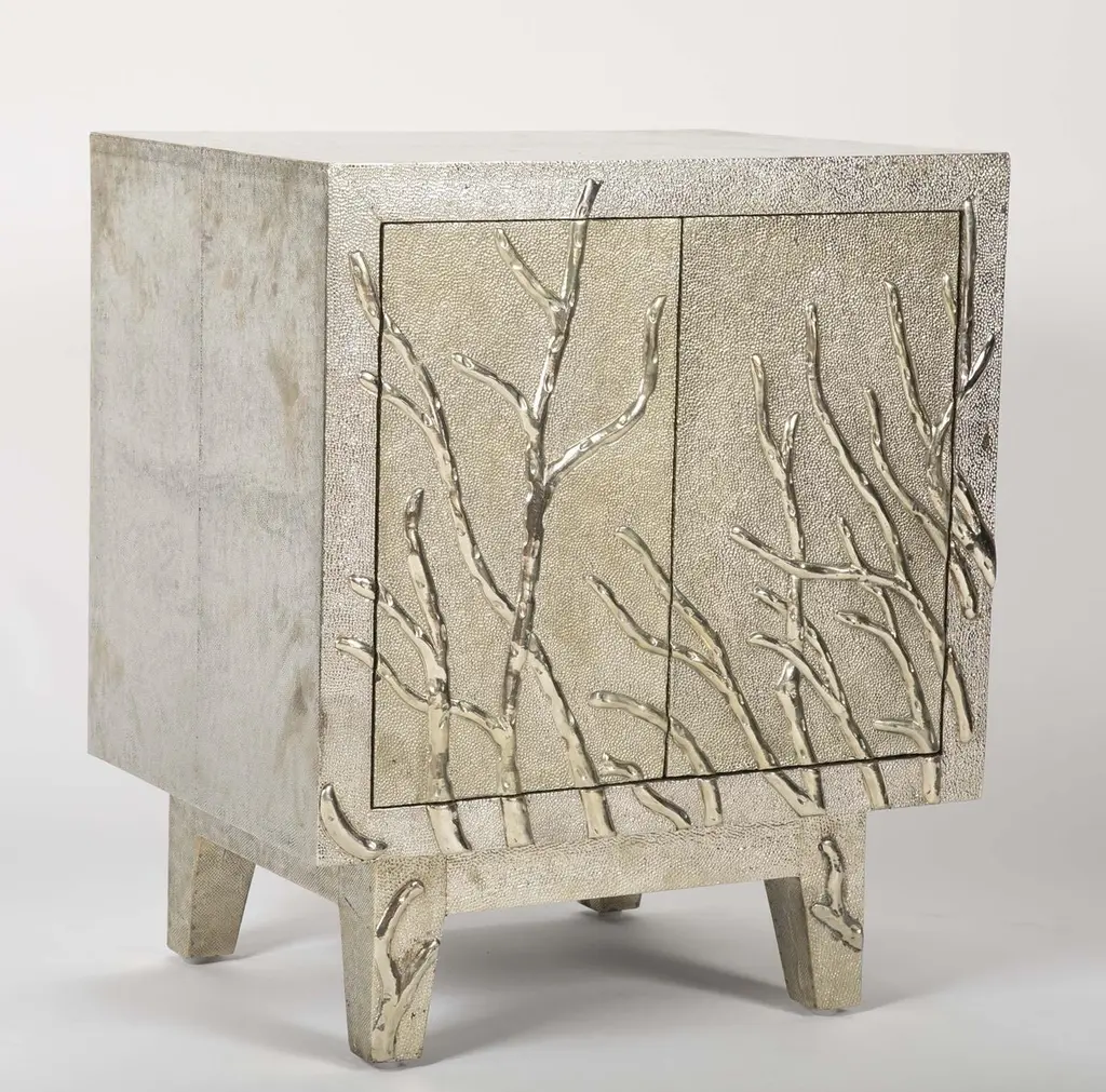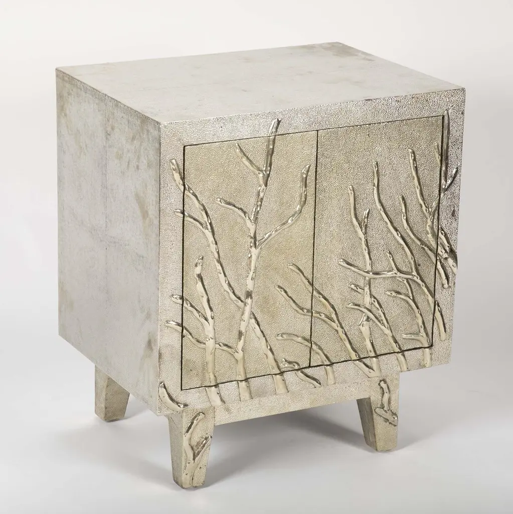 Inspired by the twig used in the paintings of palaces of Rajasthan. One of the best selling pieces of Stephanie Odegard collection. This elegant piece is hand made from solid teak which is joined to form the clean and elegant outline. The front is entirely sculpted out of a solid piece of wood by hand, then covered with metal sheeting. The available options for metal cladding are brass, white bronze, antiqued bronze, silver and copper. Both silver and copper will tarnish over time. Regular non-abrasive household metal polishes can be used to restore the original finish. Twig Nightstand in White MetalSize- 24" x 18" x 28" H.Materials - White Metal, Teak, Cast, Hand-CraftedPlease note that moisture in air, sudden change in temperature and natural movement of wood over time causes the metal to wrinkle or bubble up. We use well seasoned, reclaimed teak and high quality marine grade MDF (wherever technically possible) to avoid and delay the above mentioned changes. However a perfect stability of metal cannot be guaranteed.Buyer Cancellation-The cancellation charge is 25% which increases to 50% if the production is started.Prices do not include shipping from India (for custom orders) or our MN warehouse (items from stock). That will be additional.