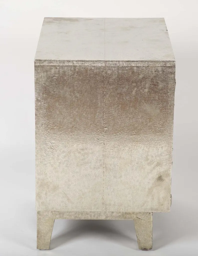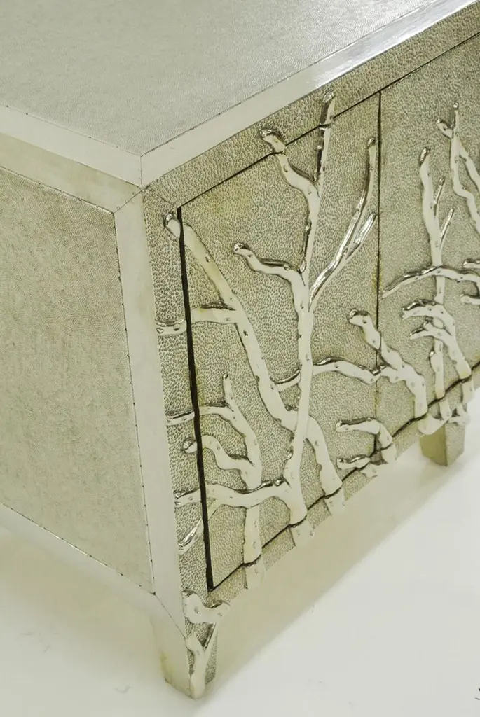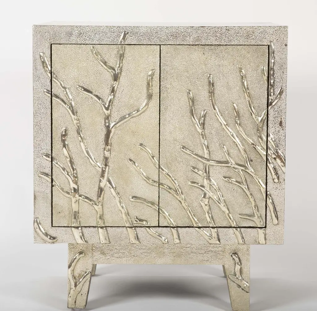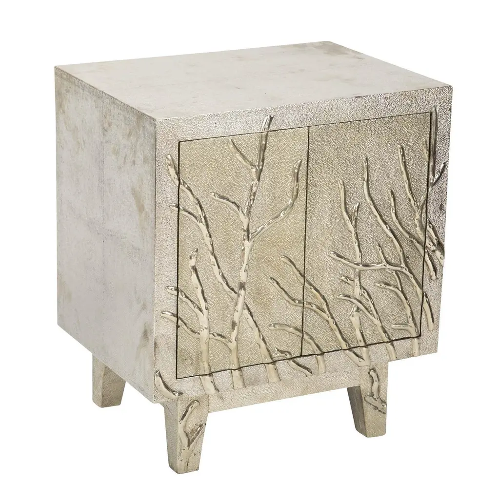 Inspired by the twig used in the paintings of palaces of Rajasthan. One of the best selling pieces of Stephanie Odegard collection. This elegant piece is hand made from solid teak which is joined to form the clean and elegant outline. The front is entirely sculpted out of a solid piece of wood by hand, then covered with metal sheeting. The available options for metal cladding are brass, white bronze, antiqued bronze, silver and copper. Both silver and copper will tarnish over time. Regular non-abrasive household metal polishes can be used to restore the original finish. Twig Nightstand in White MetalSize- 24" x 18" x 28" H.Materials - White Metal, Teak, Cast, Hand-CraftedPlease note that moisture in air, sudden change in temperature and natural movement of wood over time causes the metal to wrinkle or bubble up. We use well seasoned, reclaimed teak and high quality marine grade MDF (wherever technically possible) to avoid and delay the above mentioned changes. However a perfect stability of metal cannot be guaranteed.Buyer Cancellation-The cancellation charge is 25% which increases to 50% if the production is started.Prices do not include shipping from India (for custom orders) or our MN warehouse (items from stock). That will be additional.