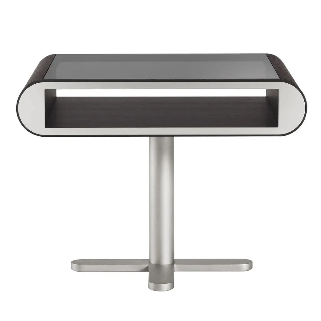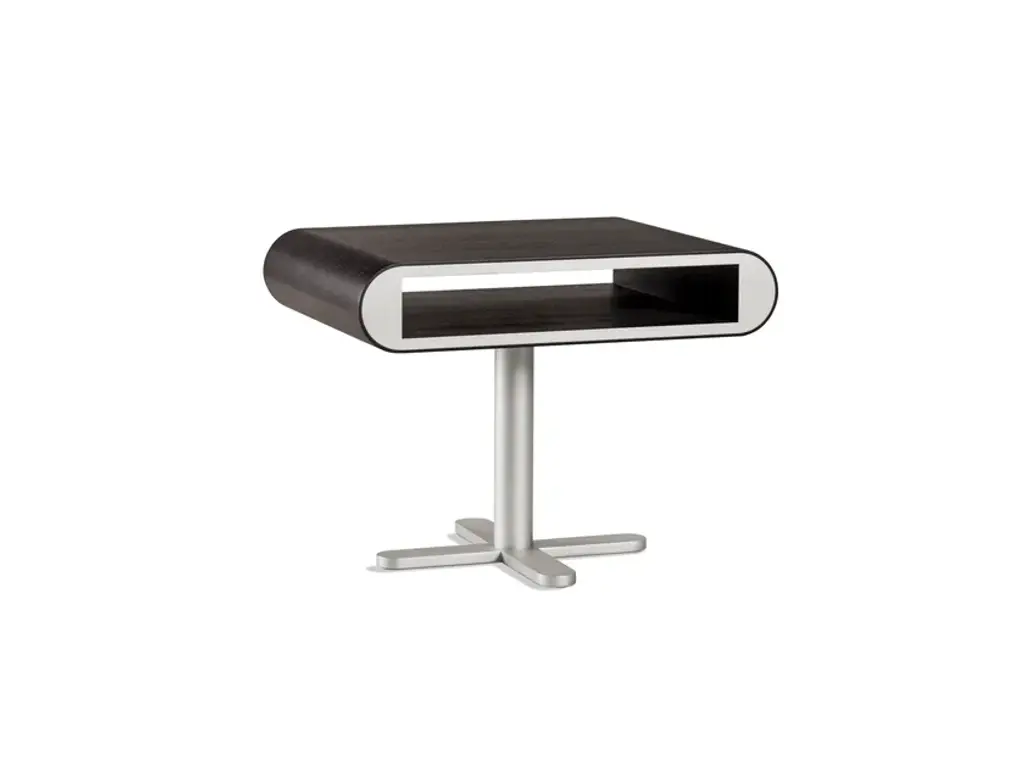 UFO is a bedside table made of wood and metal with a contemporary, functional, and elegant aesthetic.Next to the Mambo bed, it creates a truly elegant combination: soft and enveloping design on one side, and futuristic, clean lines on the other.The base consists of a central column that extends into a four-legged support, resembling a pedestal, also finished in metallic gray.The upper structure is a wooden container open on both sides, useful for storing books, objects, or small devices.