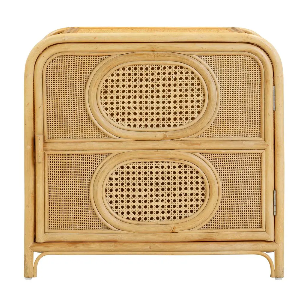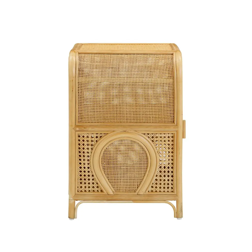 Introducing the Ullric Rattan Nightstand, where the charm of natural raw rattan and cane combines to create the ultimate earthy, Boho vibe. This piece features mixed styles of cane and a rounded, arched shape that's utterly trendy and perfect for adding a touch of organic style to your bedroom. Beyond its beauty, it boasts a magnetic-catch door revealing two spacious shelves inside, ideal for organizing your nighttime routine essentials with ease.