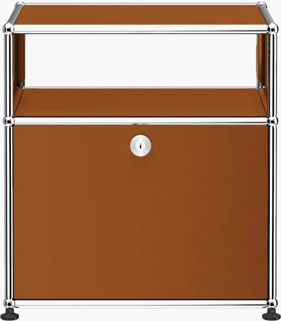 The USM Haller Bedside Table (1961) is crafted with precision, constructed of steel, and built to last for generations. Pieces bought 50 years ago can be paired with those purchased today, and you can continue to add others as needs change. This unit has a drop-down door that locks with the twist of a coin. Made in Switzerland.