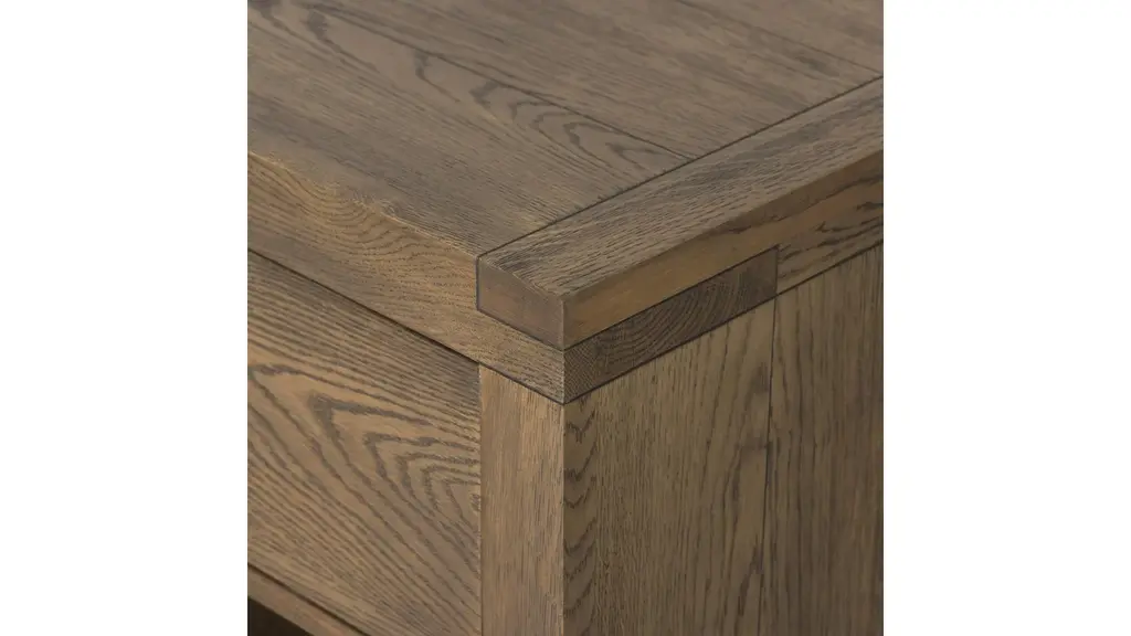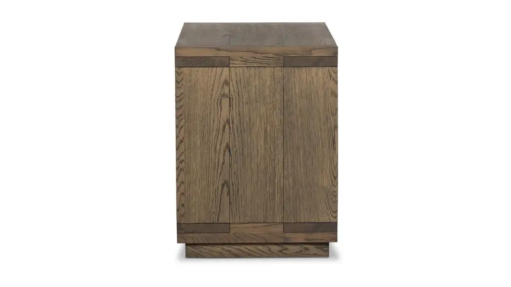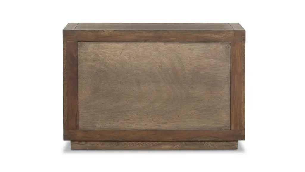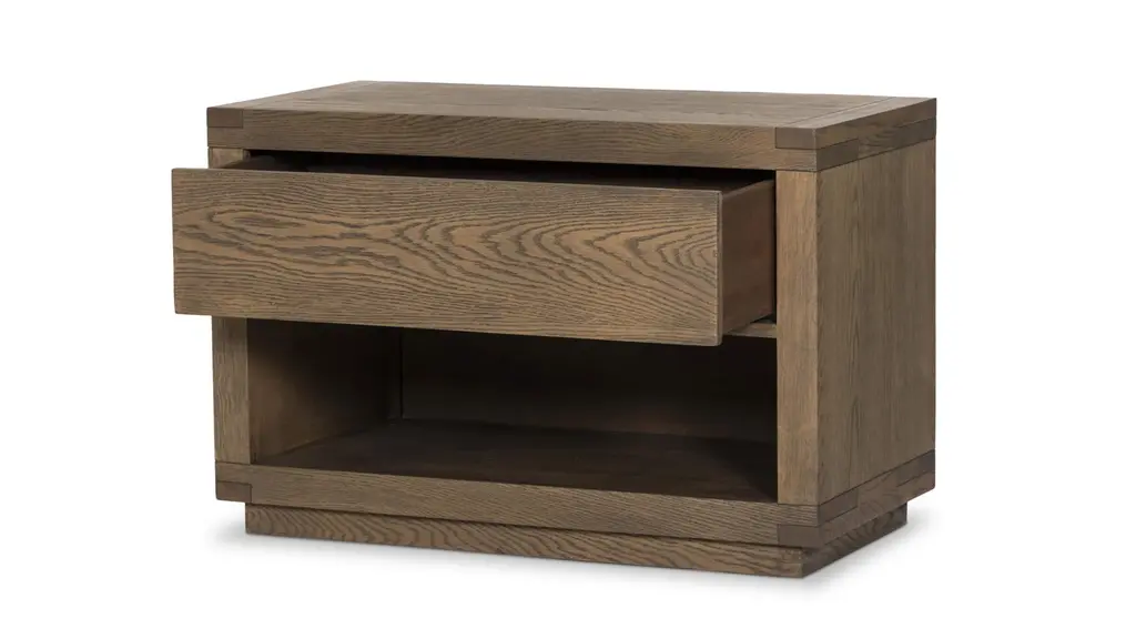 Solid acacia shapes a streamlined box-style nightstand, with lap joint corners for a detail-driven touch. Finished with smooth, push-latch drawer glides. Made in India.